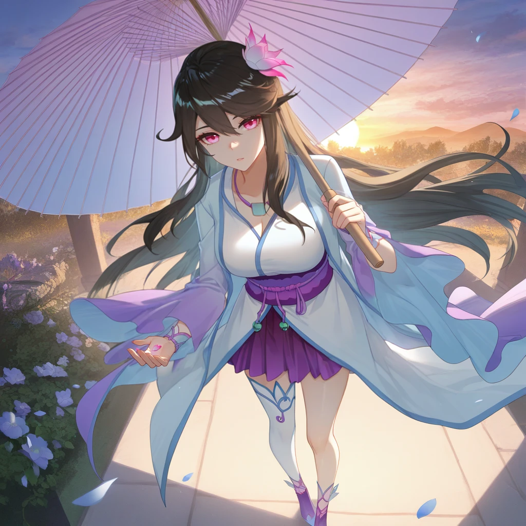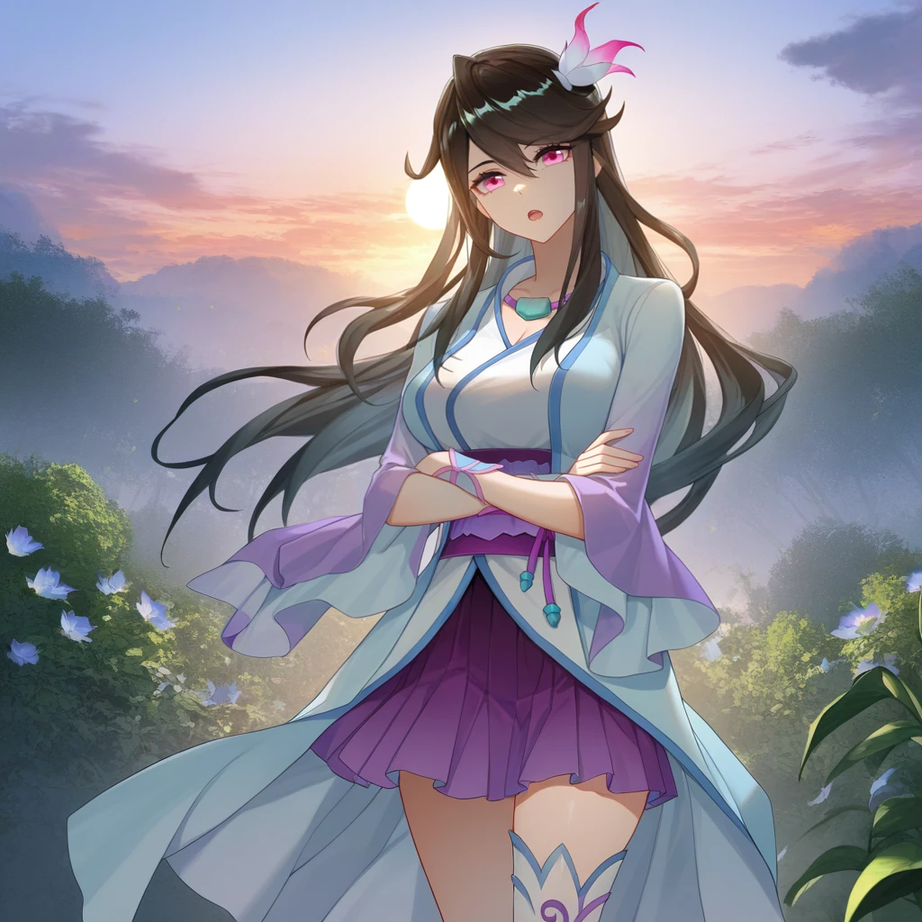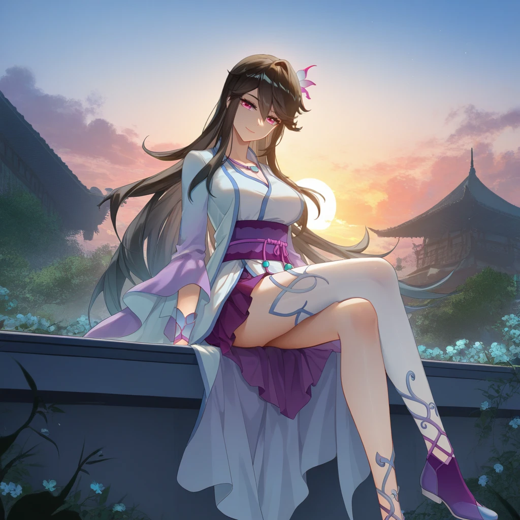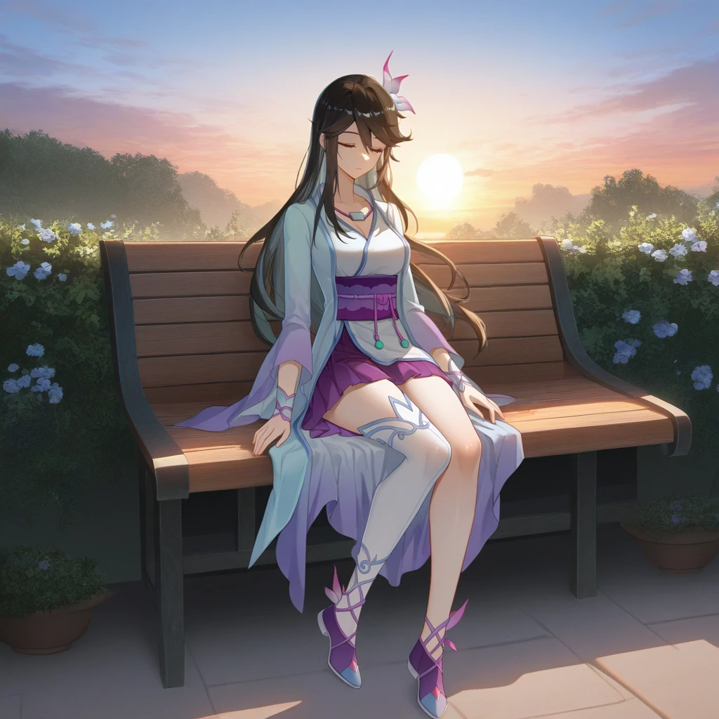 chinese clothes, white dress, light blue dress, white kimono, purple sash, single thighhigh, white thighhighs, purple skirt, pleated skirt, long sleeves, wide sleeves, bracelet, asymmetrical legwear, cleavage, purple footwear, high heelsThe results of your generations are dependent on the additional LoRAs, weights, and models you use, so it may not work or come out as consistent as my sample images.