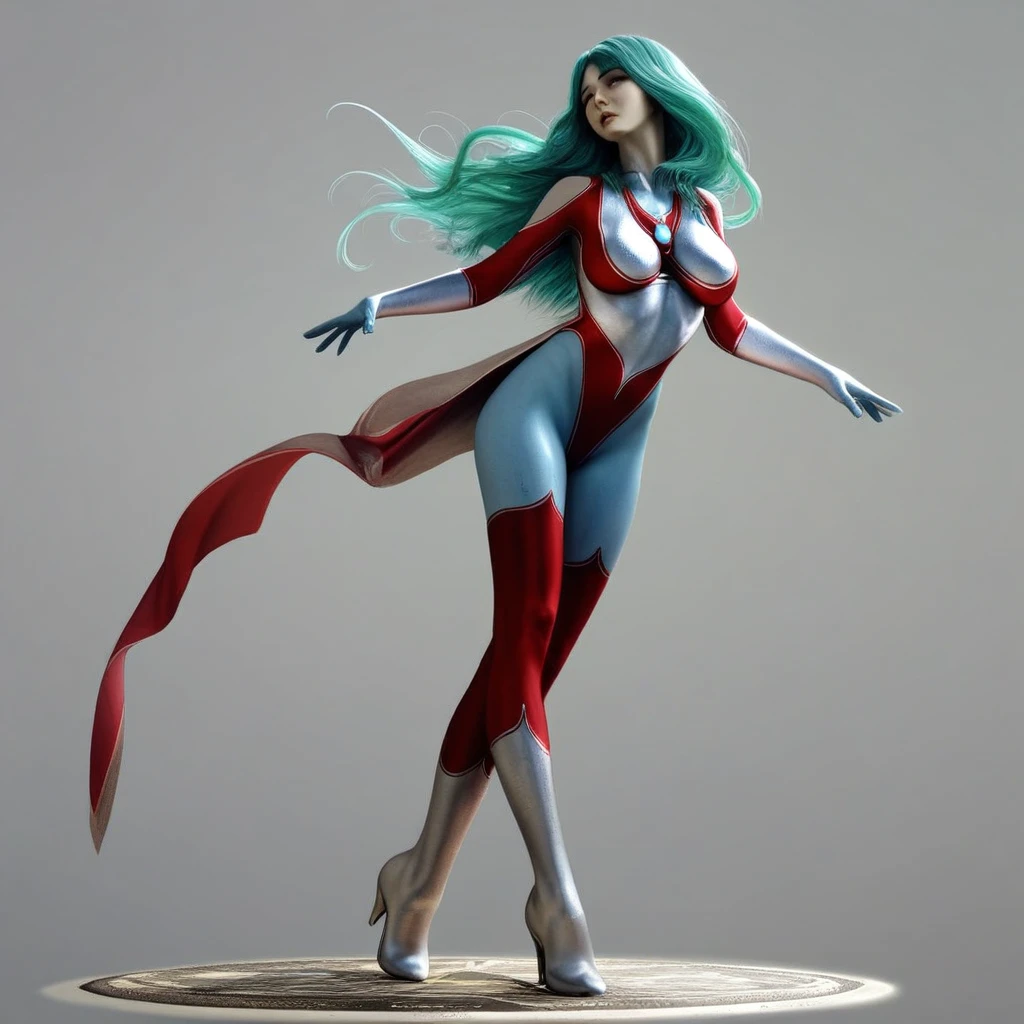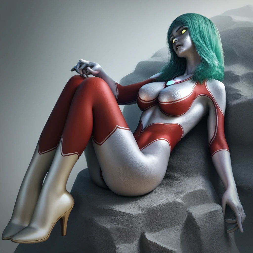 ultra rein, full henshin, blue chest jewel,colored skin, leotard, blue chest jewel, silver face, yellow eyes, glowing eyes, red thighhighs, silver boots, thin highheels, green hair, large breasts,