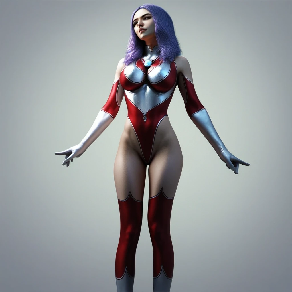 half rein, half henshin, leotard(silver-and-red leotard), blue chest jewel(glowing jewel on mental base), red thighhighs, silver boots(knee-high boots), thin highheels, purple hair, short hair, large breasts,