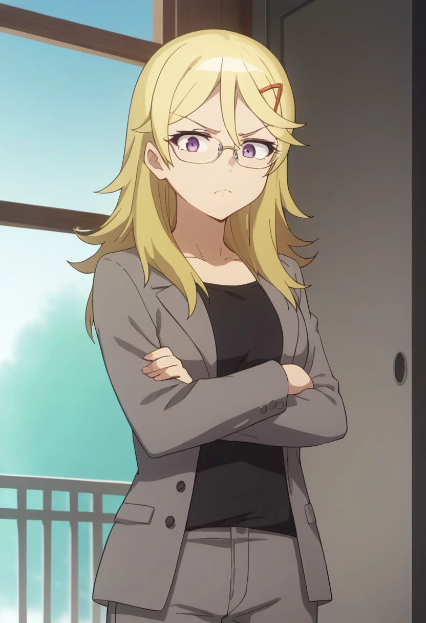 Formal: landlord, 1girl, blonde hair, hair ornament, hair between eyes, hairclip, purple eyes, glasses, grey jacket, black shirt, grey pants, shoes,