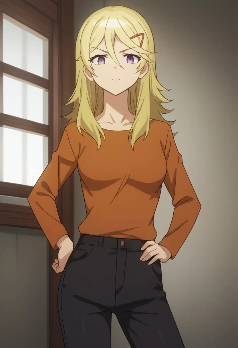 Casual: landlord, 1girl, blonde hair, hair ornament, hair between eyes, hairclip, pants, orange shirt, shoes, purple eyes, black pants,