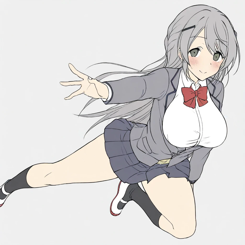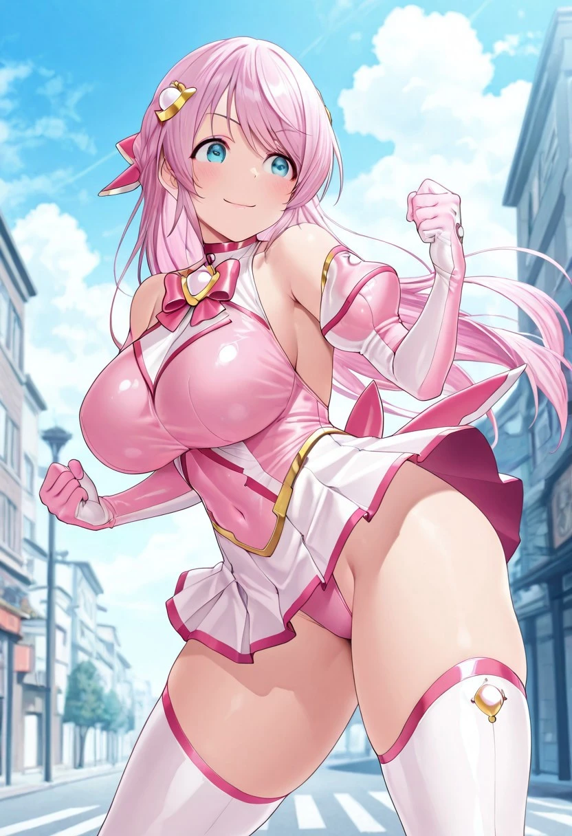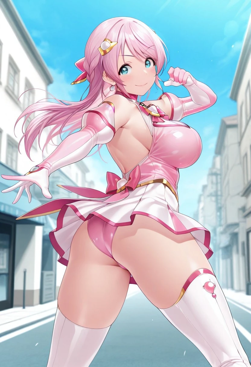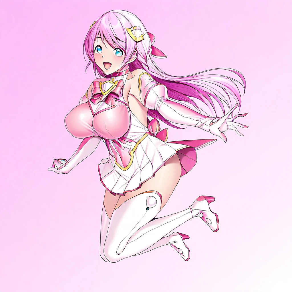 Esphere_Perle, pink hair, long hair, hair ornament, blue eyes, large breasts, leotard, chest jewel, pink bow, skirt(white), elbow gloves, thigh boots(white), highheel boots,