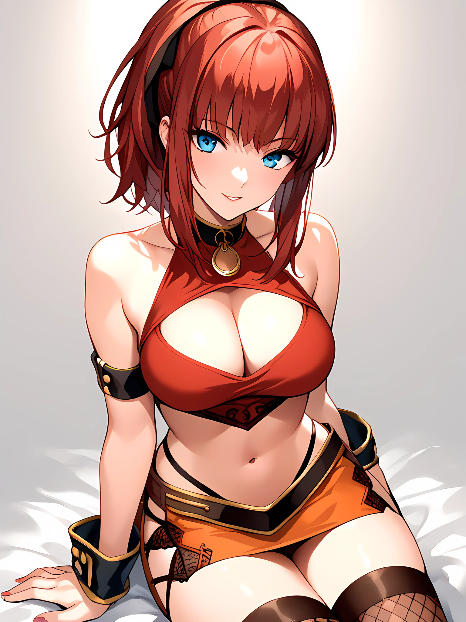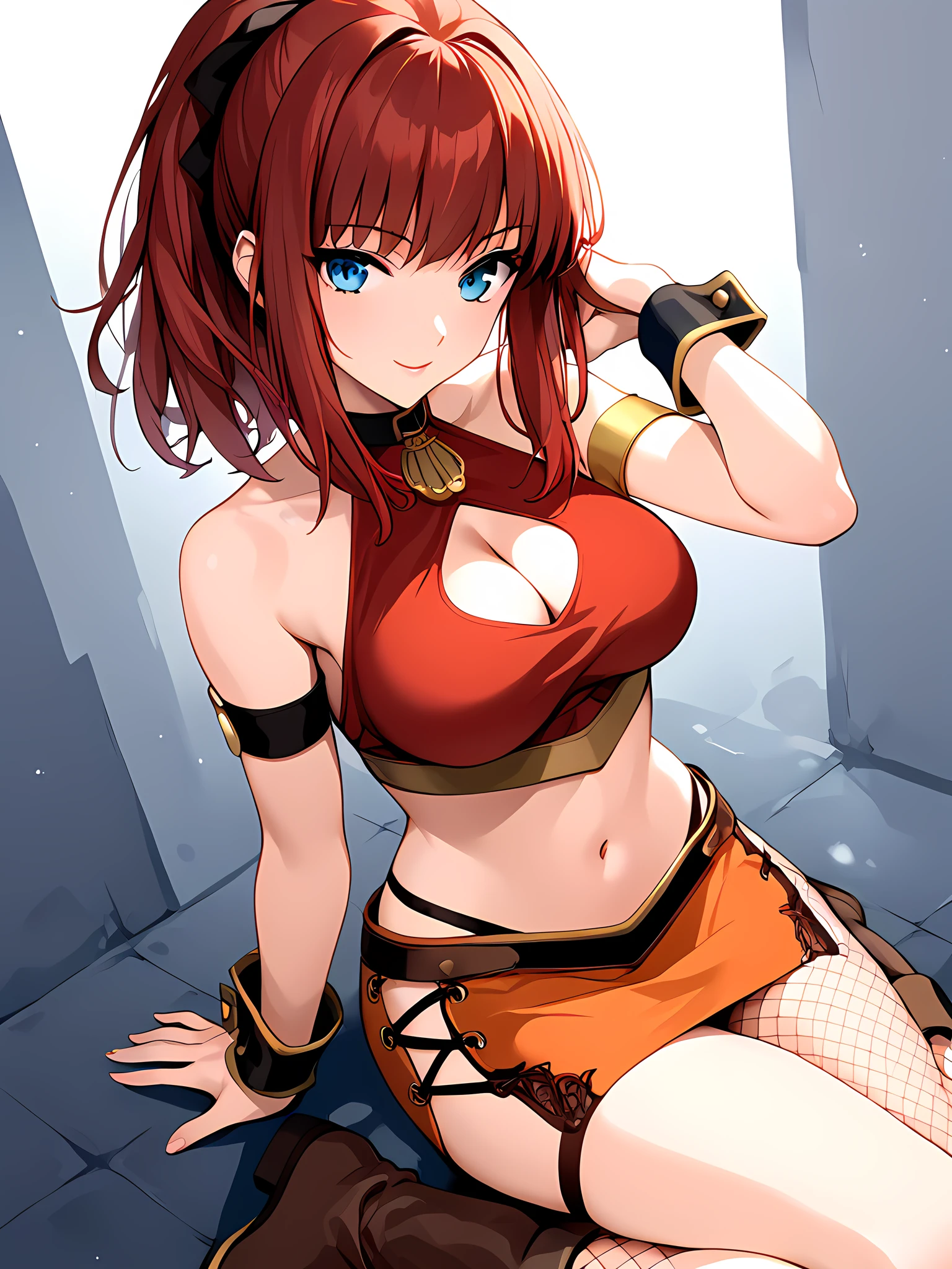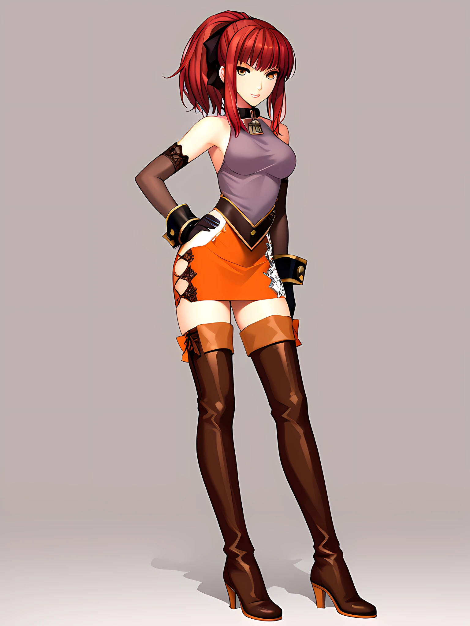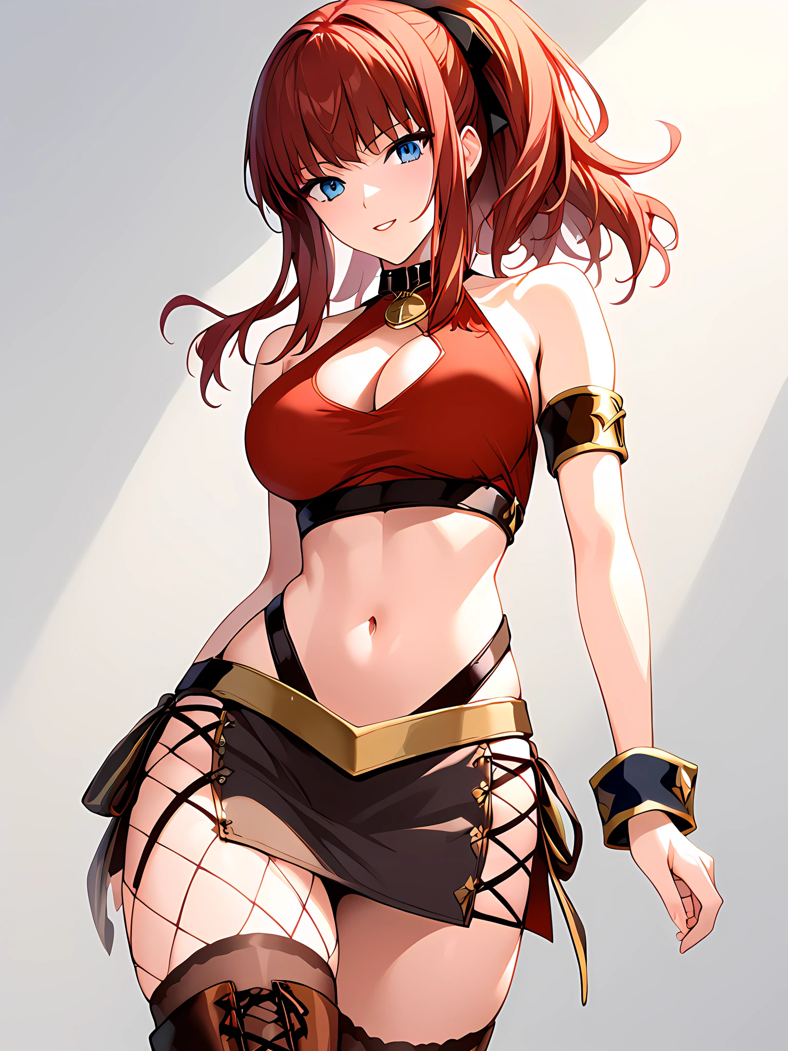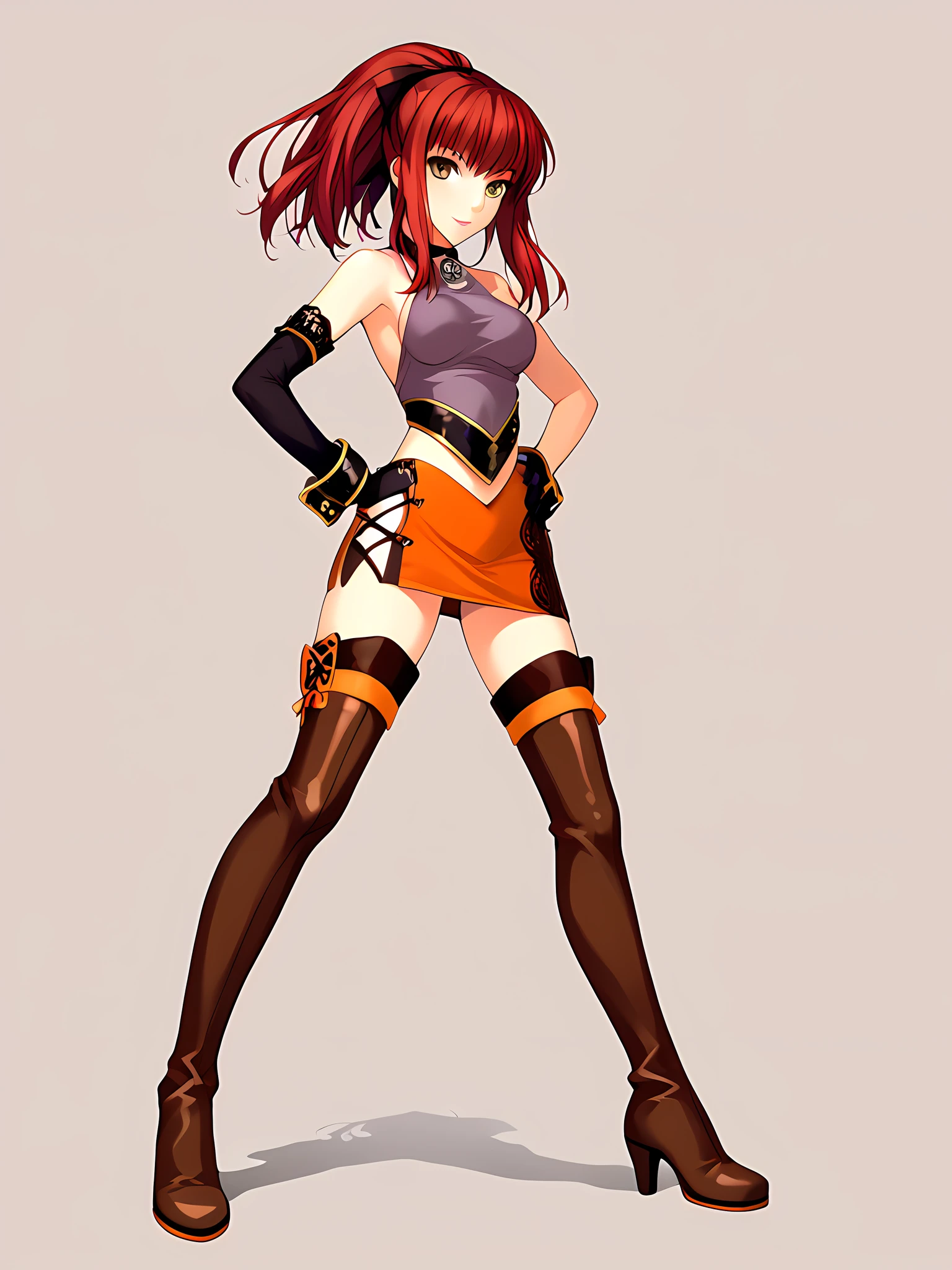 cleavage, cleavage cutout, midriff, boots, skirt, navel, clothing cutout, miniskirt, armband, datingoutfit