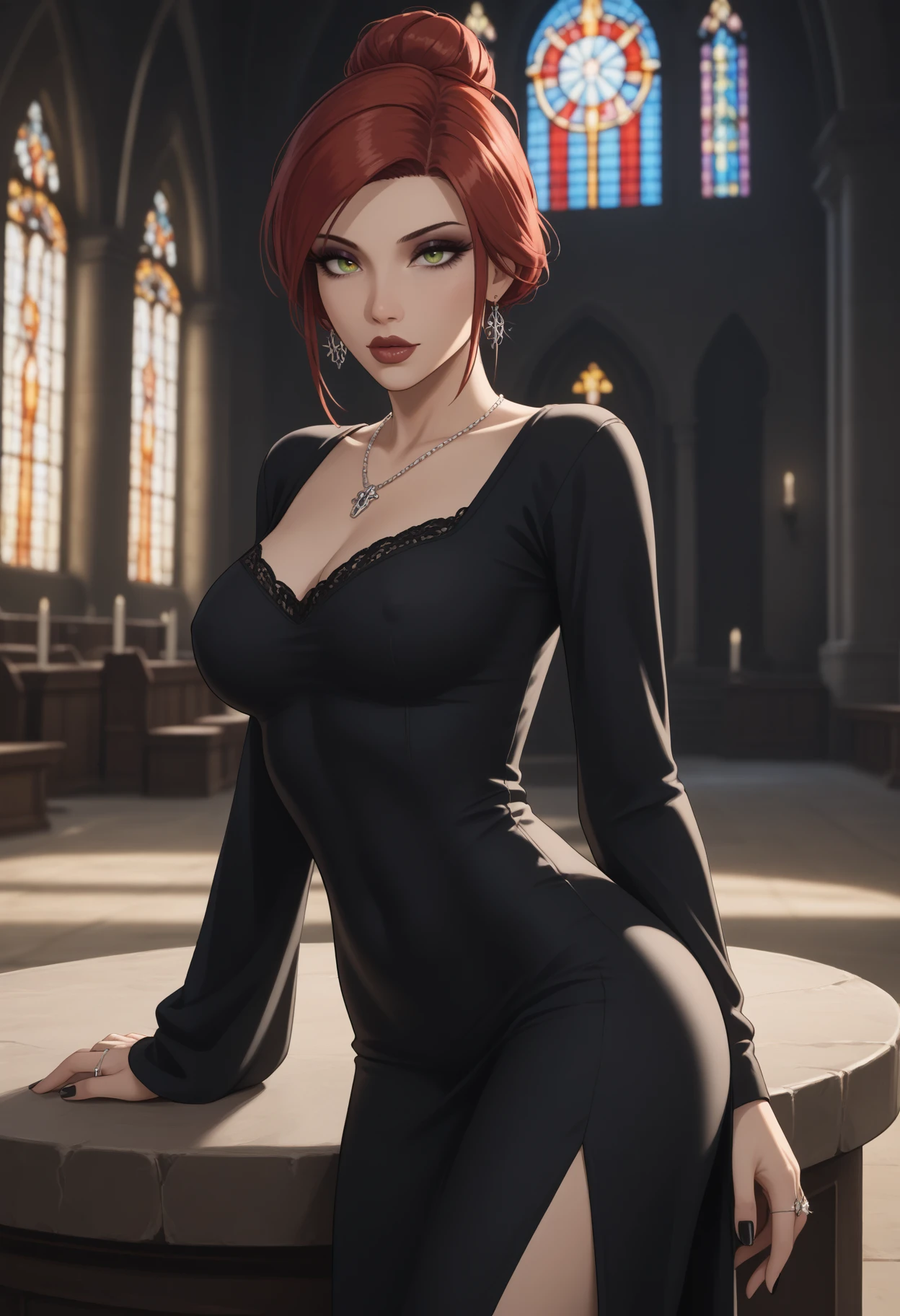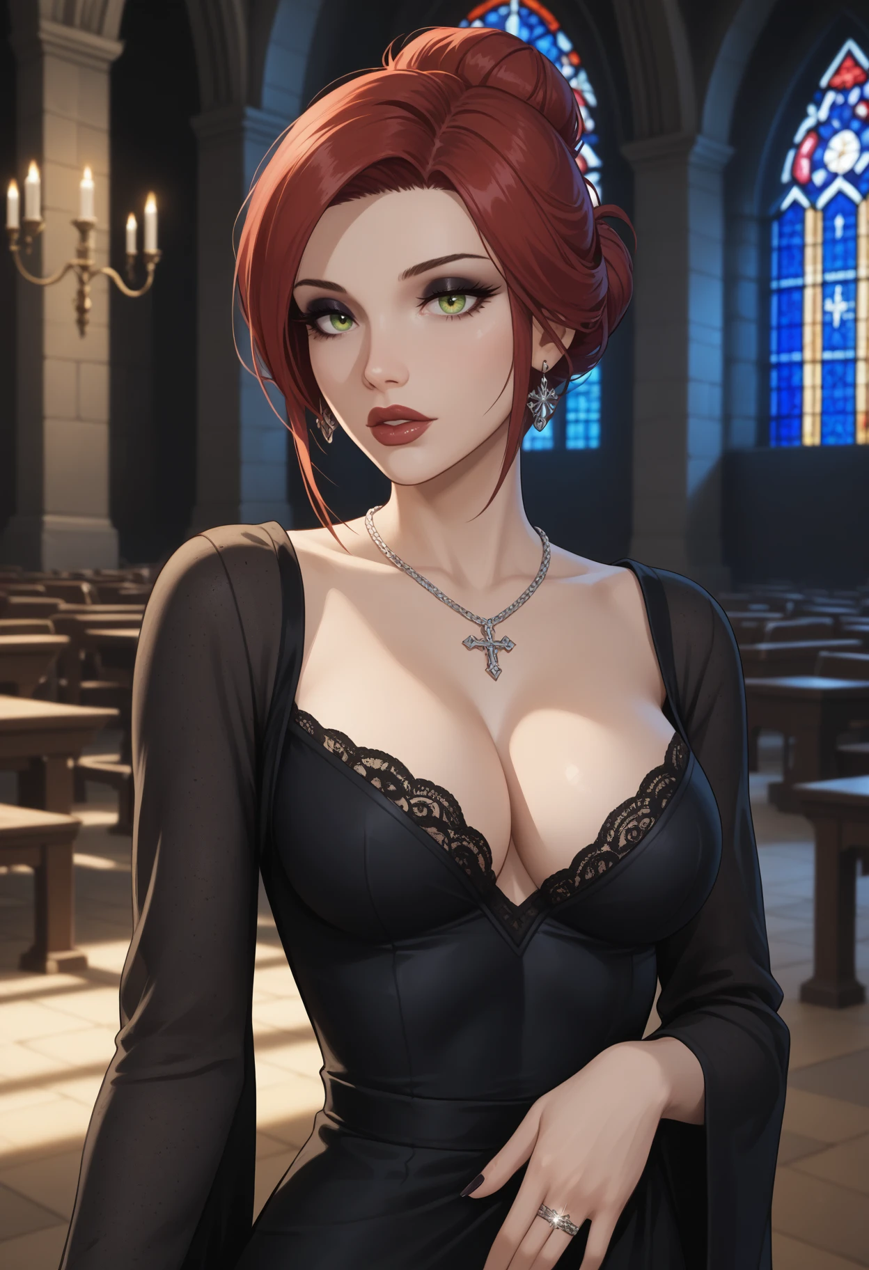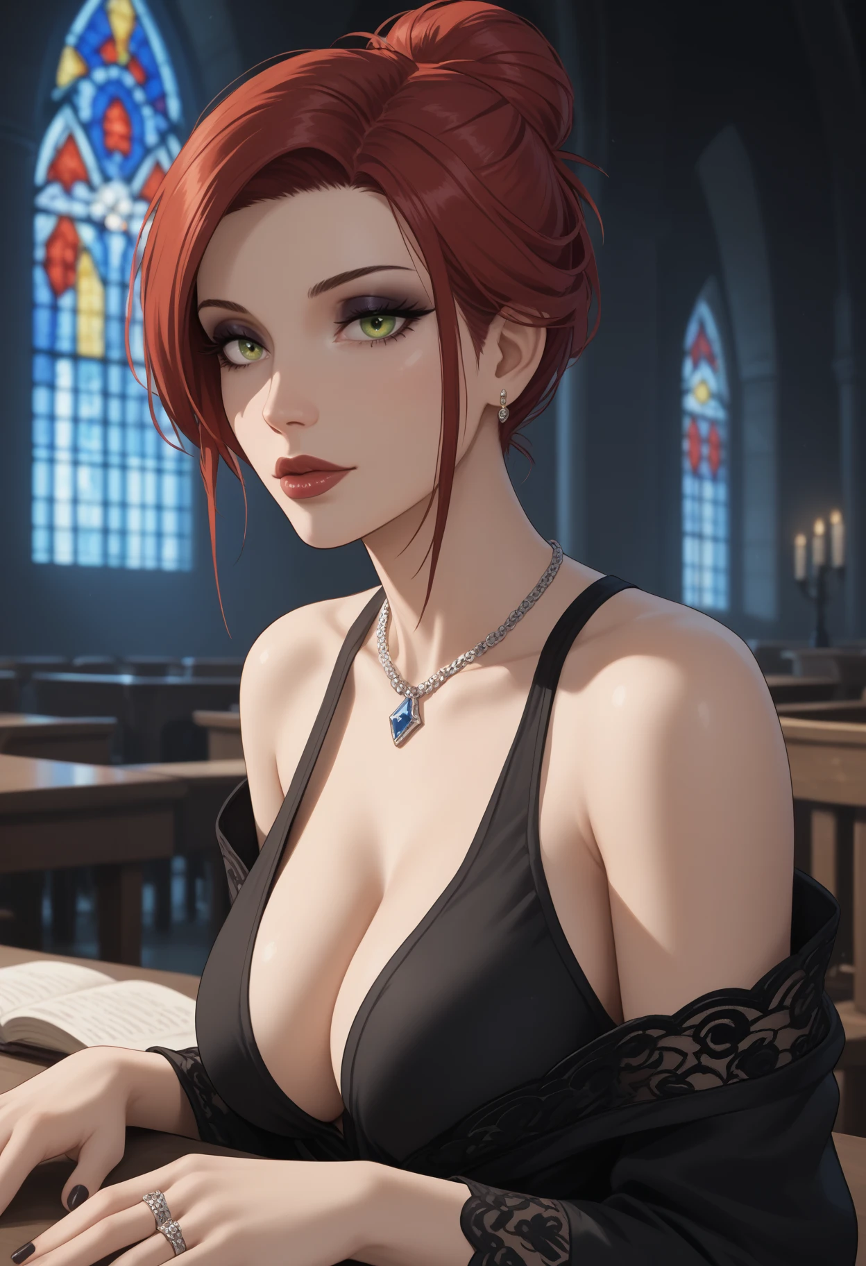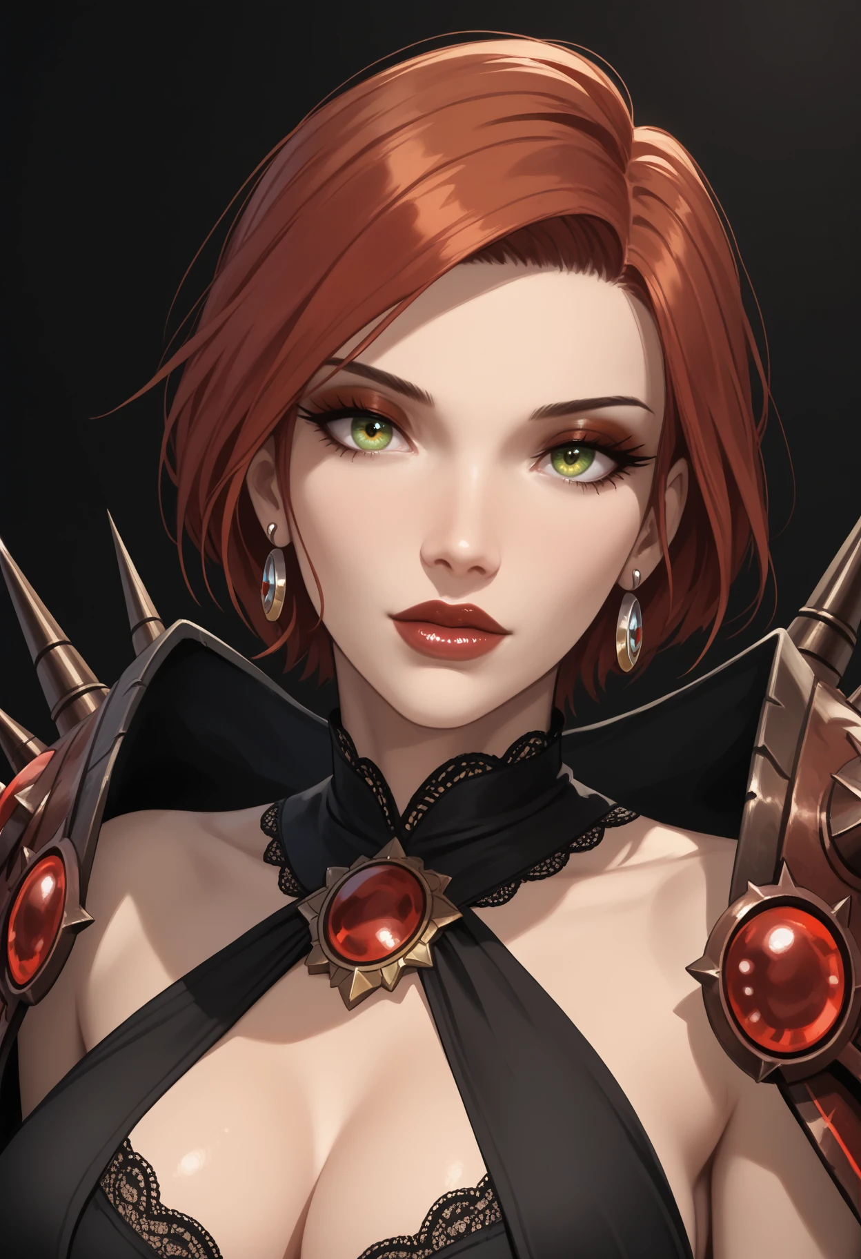 1girl, solo, green eyes, yellow eyes, red hair, brown hair, short hair,breasts, large breasts, lips, makeup, eyeshadow, lipstick,