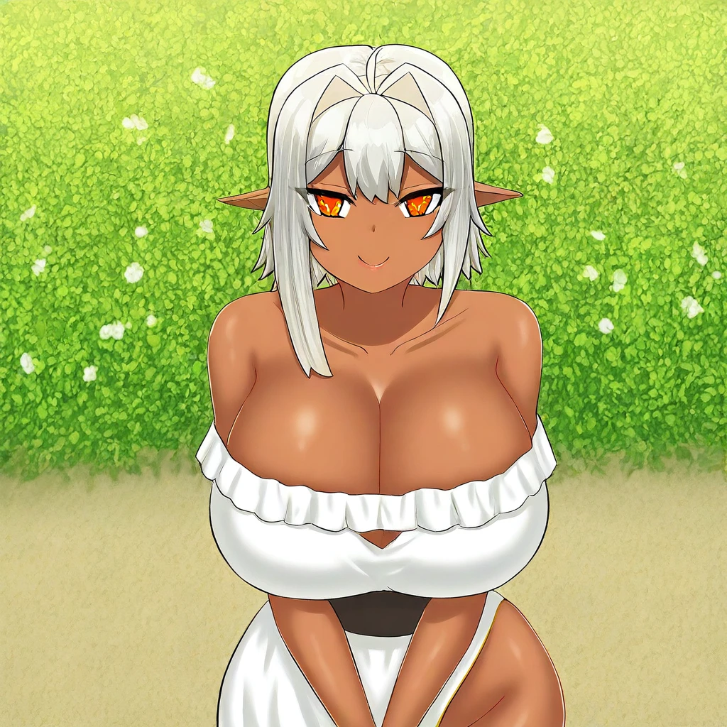 (( <lora:koe_this_world’s_breastfeeding_cafe:1> , koe_this_world’s_breastfeeding_cafe, koe, normal waist, wide hips, beautiful dark skin, pointy ears, pointy dark elf ears, piercing orange eyes, clear eyes, bright pupils, beautiful eyes, beautiful silver hair, hair intakes, ahoge, bangs, huge and shaggy breasts, natural dark elf beauty, extraordinary beautiful dark elf woman, attractive dark elf woman, super sexy dark elf woman, lustful dark elf body, sexy dark elf woman with seductive obscene body, sensual dark elf body, voluptuous dark elf body, sexy dark elf beauty, no piercings, no piercing, ))
