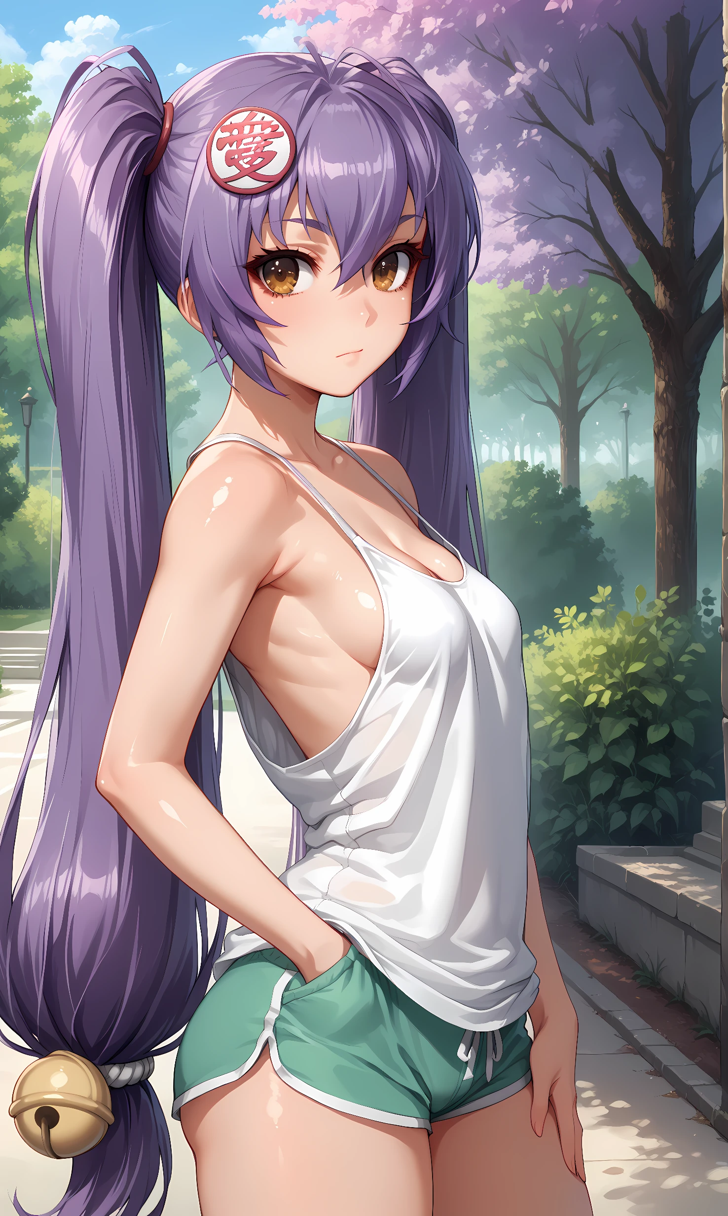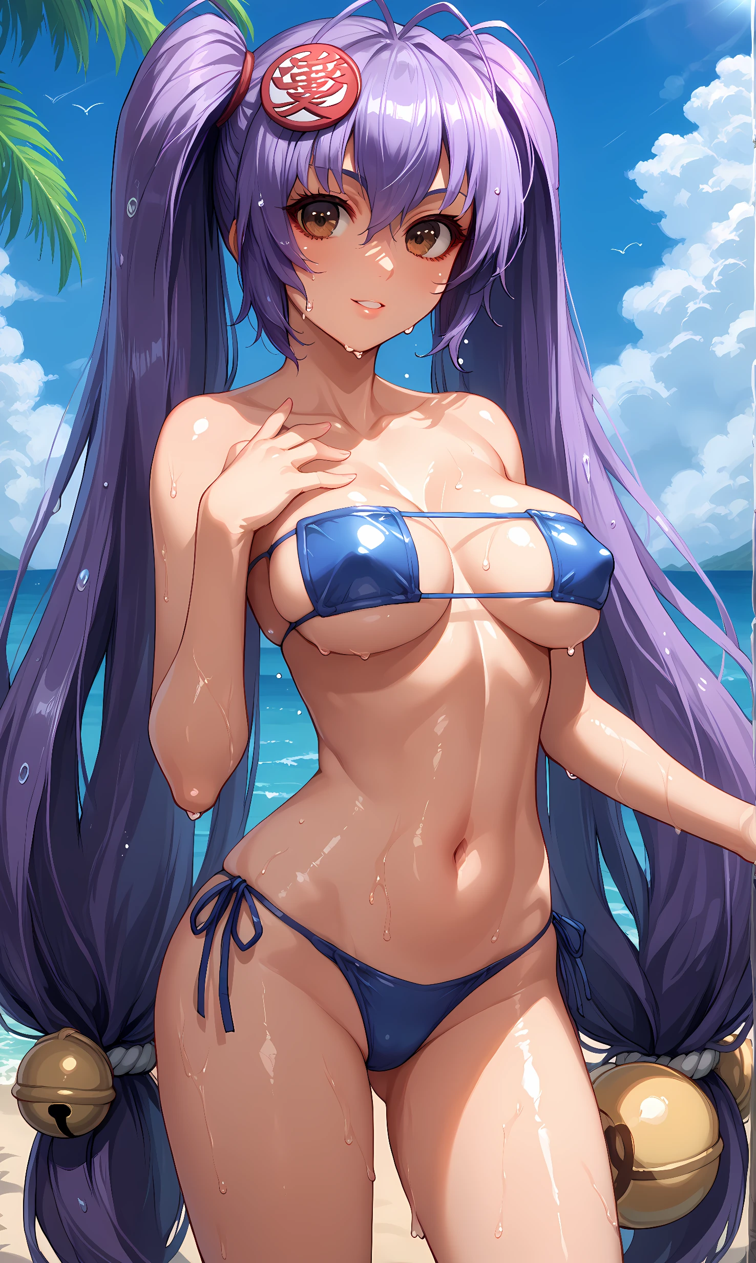 naoe_kanegutsu, brown eyes, purple hair, very long hair, twintails, hair bell, hair ornament