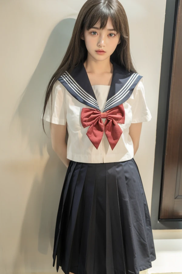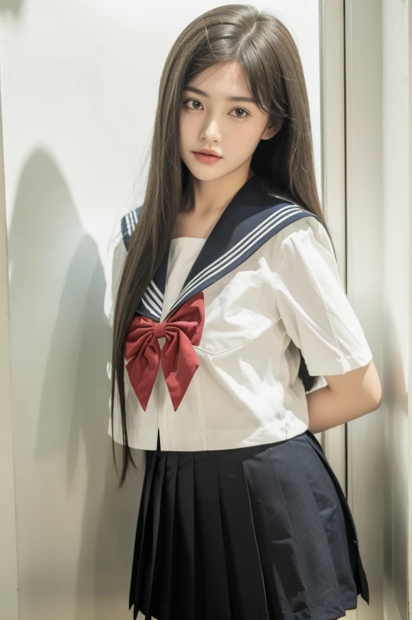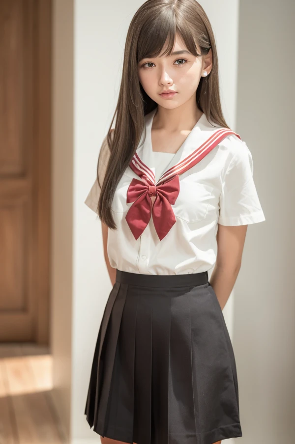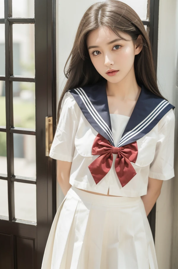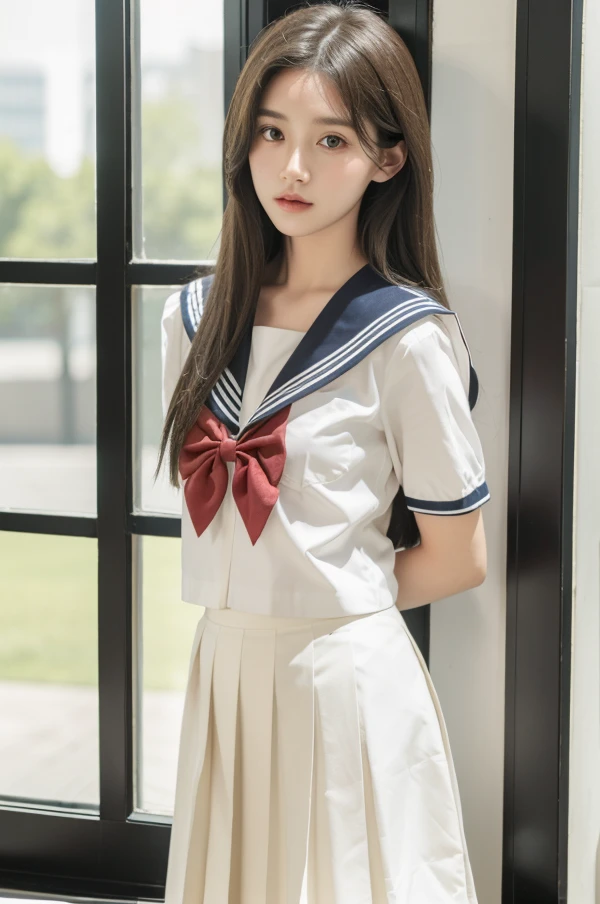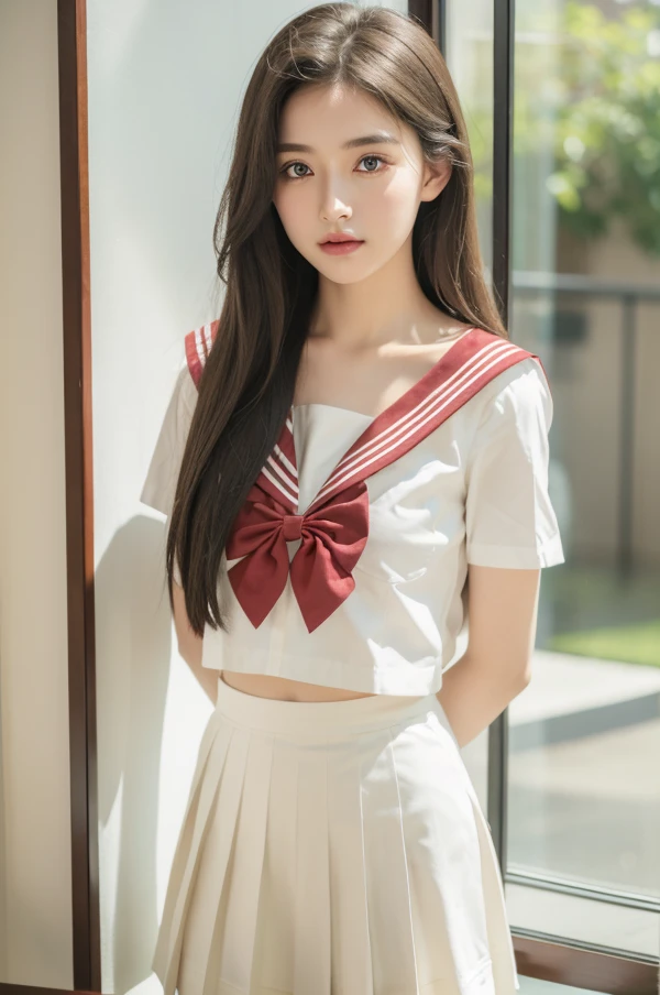 Prompt word:jk-uniform, school uniform, skirt, serafuku, red bow, white shirt, sailor collar, shirt, pleated skirt