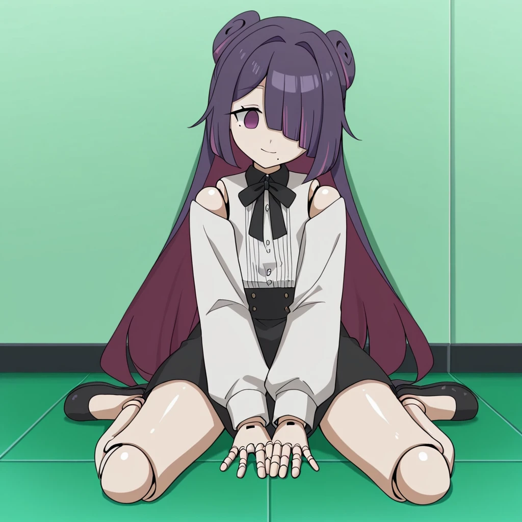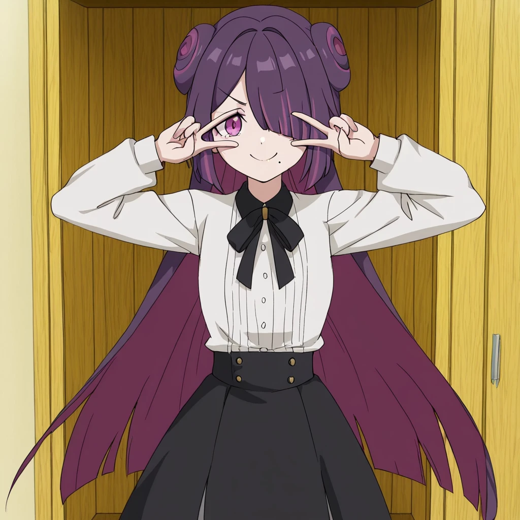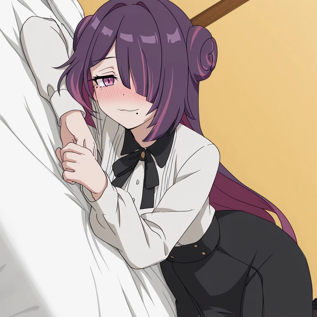 Purple hair, Purple eyes, Mole, Mole under the mouth, Bun hairstyle, Hair above one eye, Multicolored hair, Long hair,