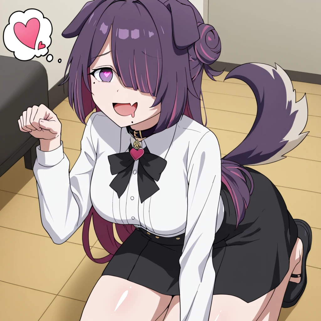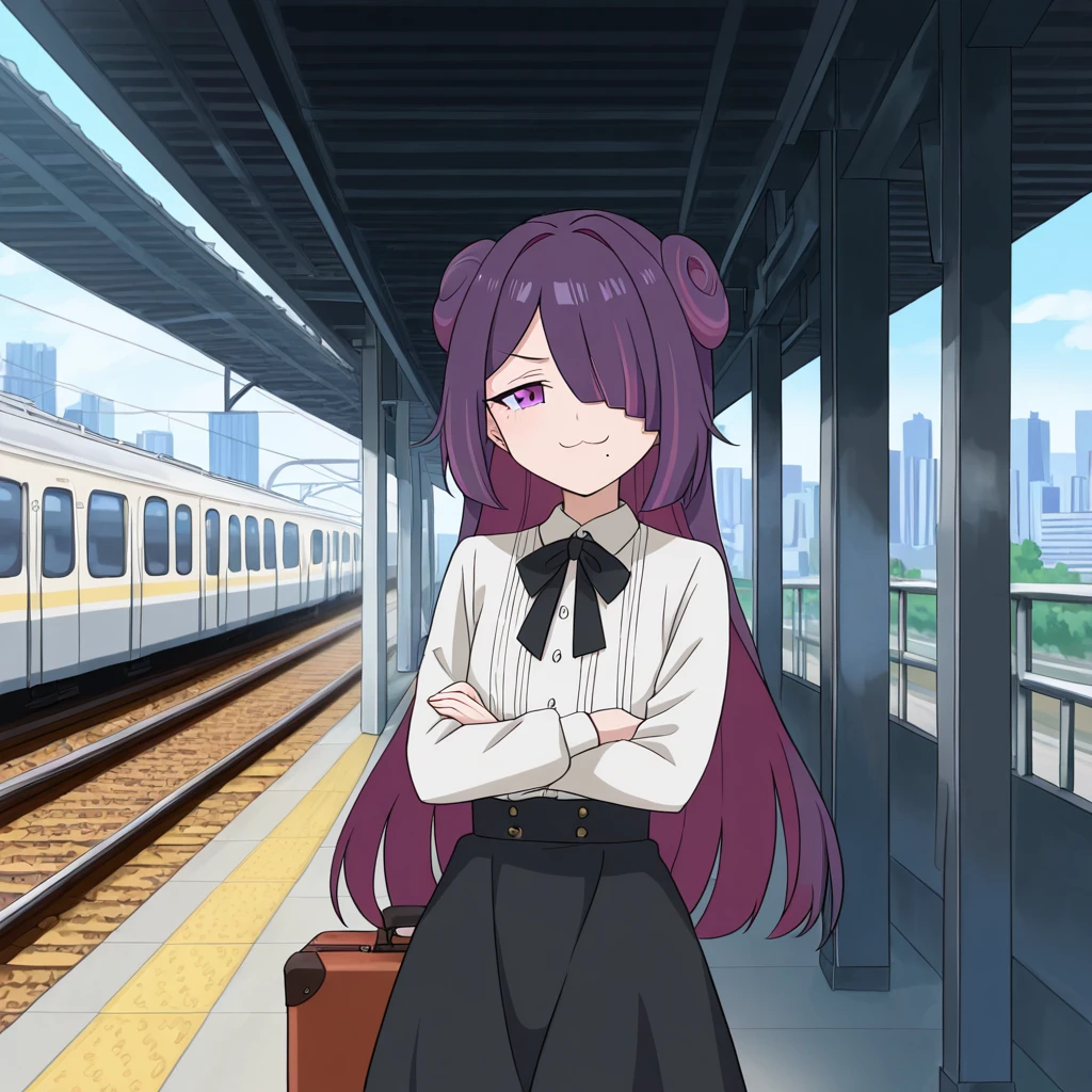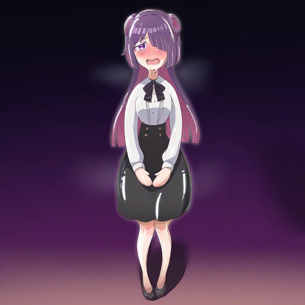 Purple hair, Purple eyes, Mole, Mole under the mouth, Bun hairstyle, Hair above one eye, Multicolored hair, Long hair,