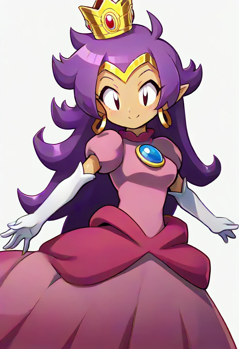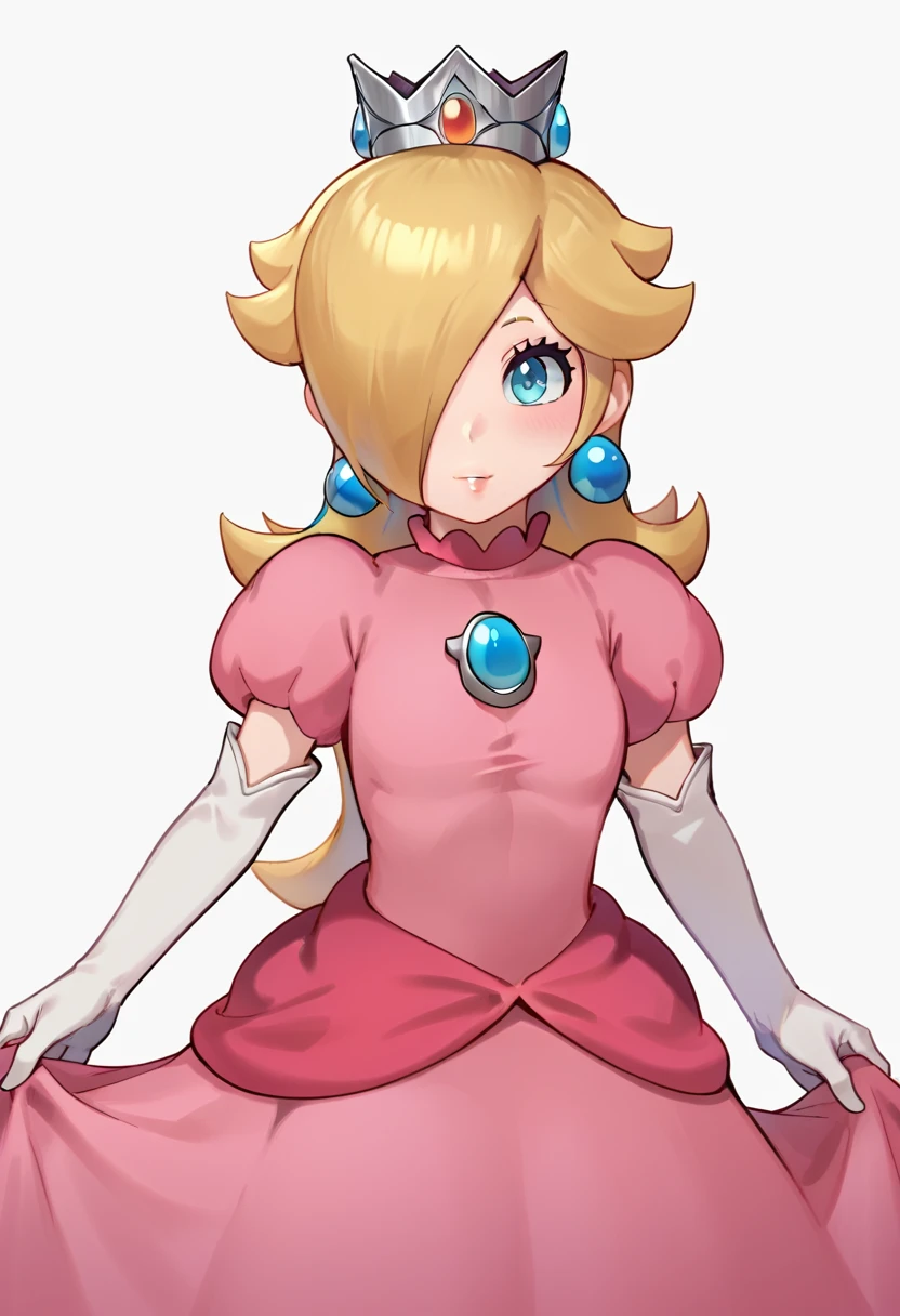 1girl, <character>, p34ch3s-dress, cosplay, crown, blue earrings, jewelry, pink dress, elbow gloves, white gloves