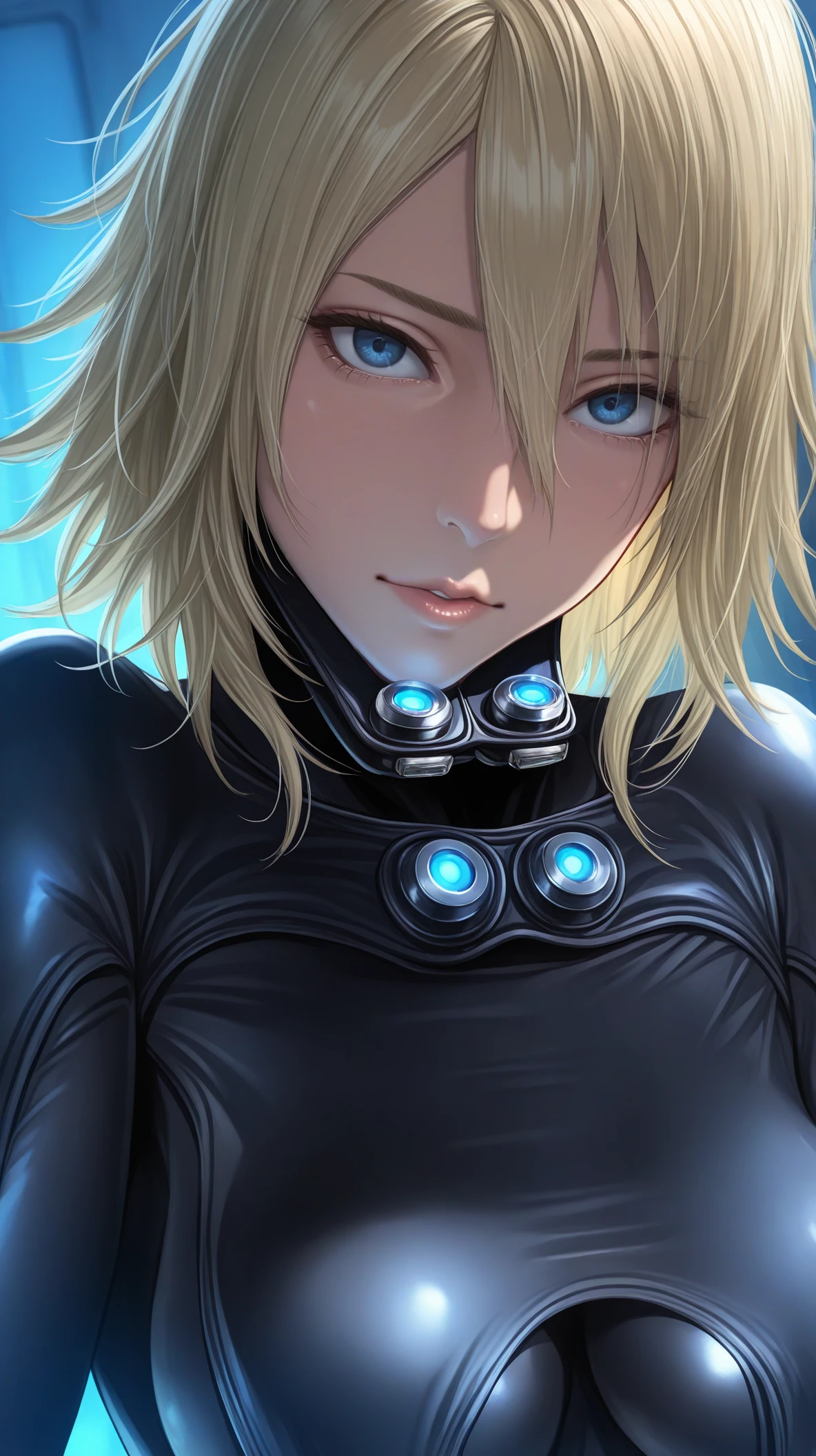 mary_mclane, blue eyes, blonde hair, short hair, messy hair, hair between eyes, black bodysuit, gantz suit, latex bodysuit, skin tight, layered clothes,