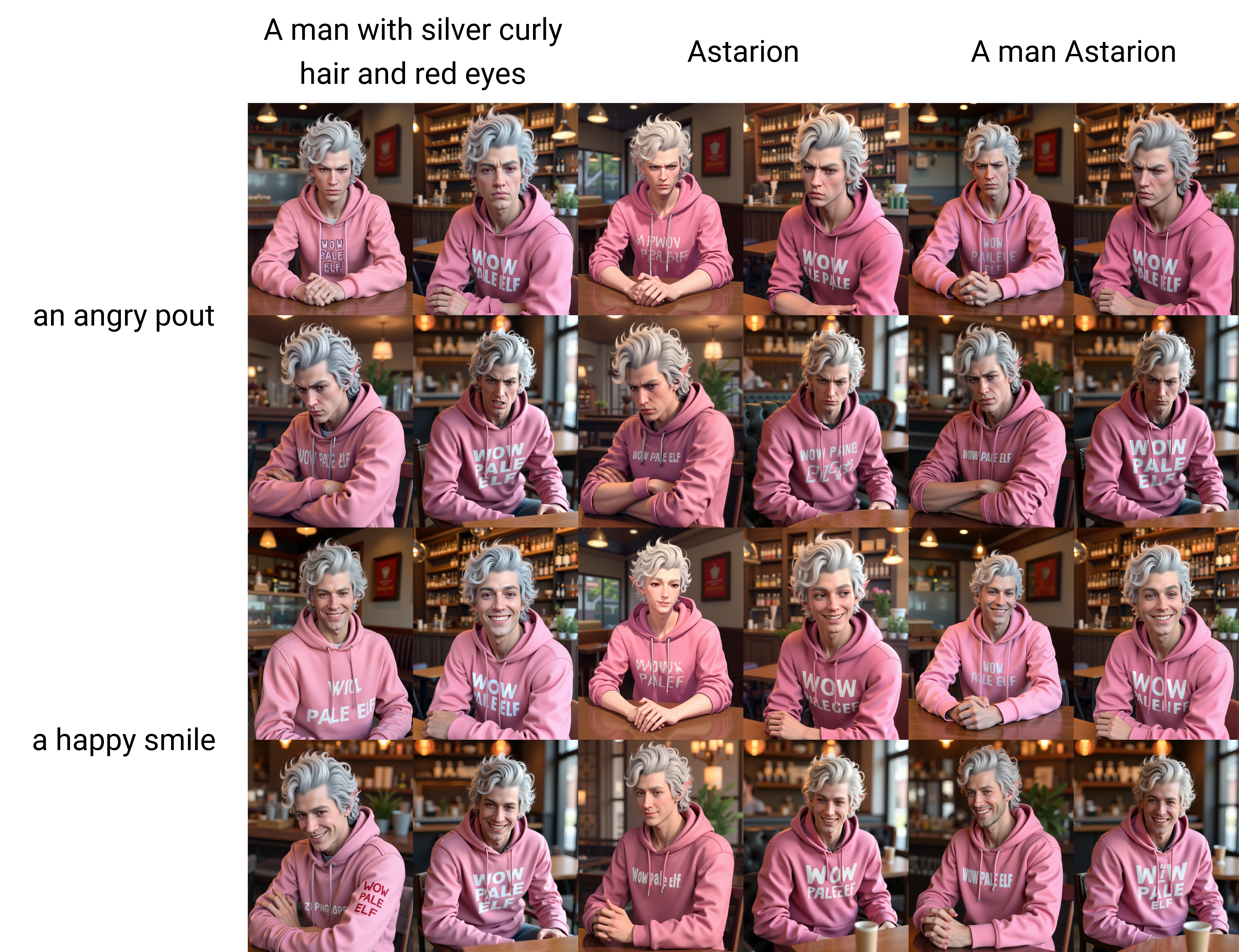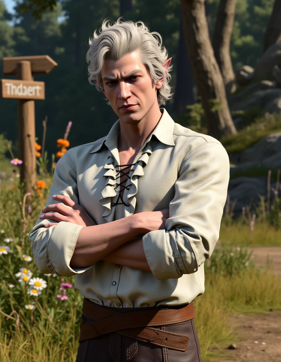 The activation word is "Astarion", but it seems to be associated to the 3d style from the game engine a tad too much for my liking, so I tend to just use "a man with silver curly hair with red eyes". Lora weight of 0.5-0.7 seems to be a good balance for keeping the likeliness while keeping the 3d rendering style at an acceptable level.