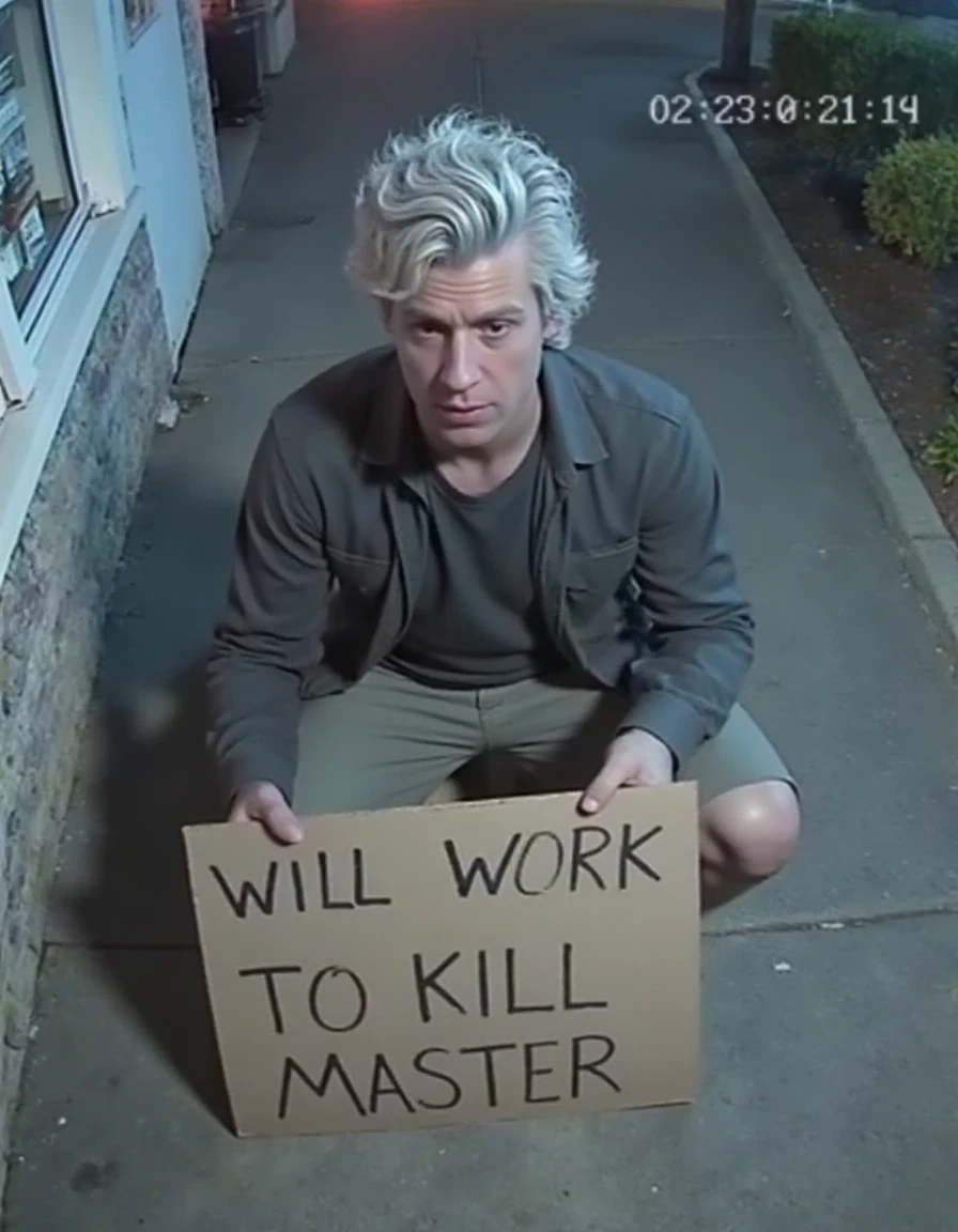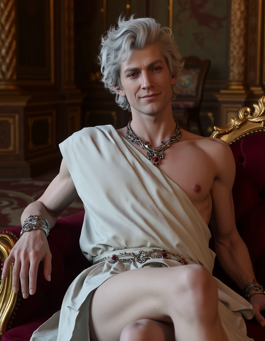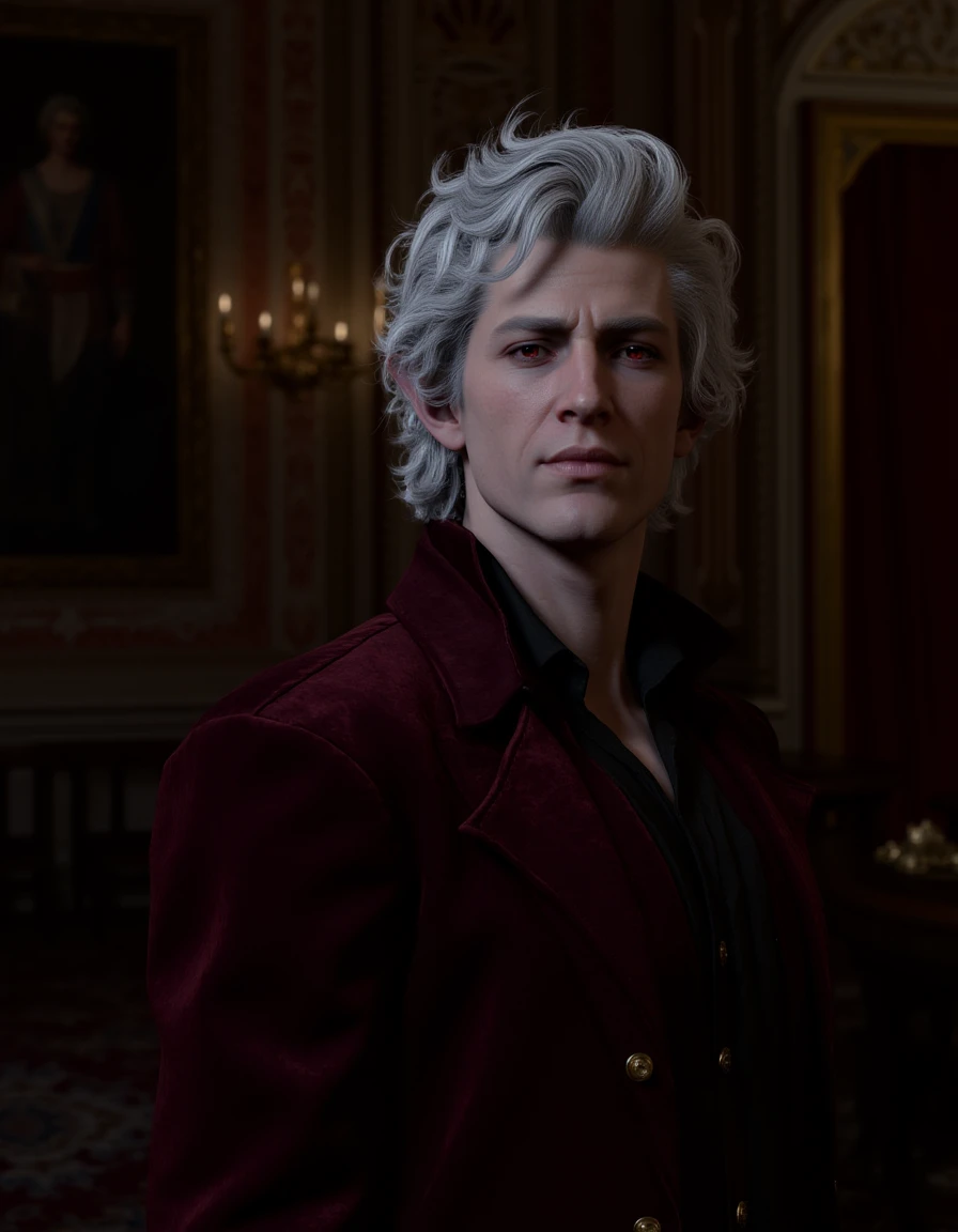 A man with silver curly hair and red eyes