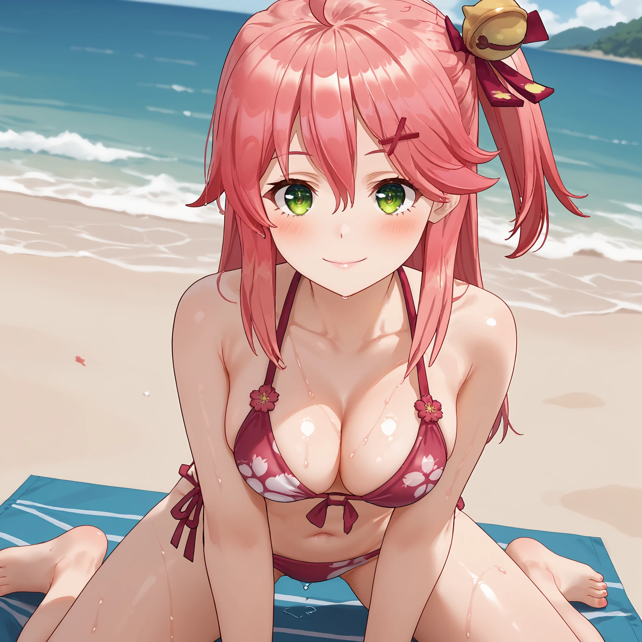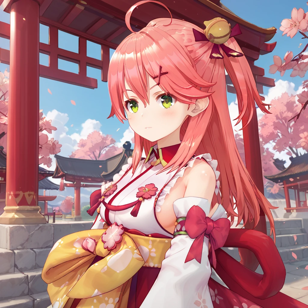score_9_up,score_8_up,masterpiece,best quality,detailed skin,1girl,Mikochi,pink hair,ahoge,green eyes,hair bell,hair ornament,x hair ornament,hair bell,long hair,one side up,floral print,detached sleeves,paw print,paw print pattern,cherry blossom print,shrine,cowboy shot,sideboob