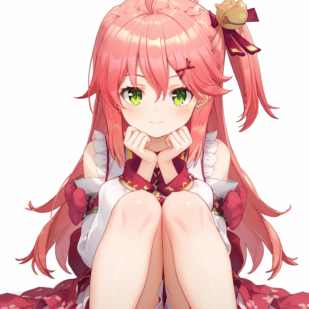 Miko_nml ,pink hair,ahoge,green eyes,hair bell,hair ornament,x hair ornament, hair bell,long hair, one side up,floral print,detached sleeves,paw print,paw print pattern,cherry blossom print
