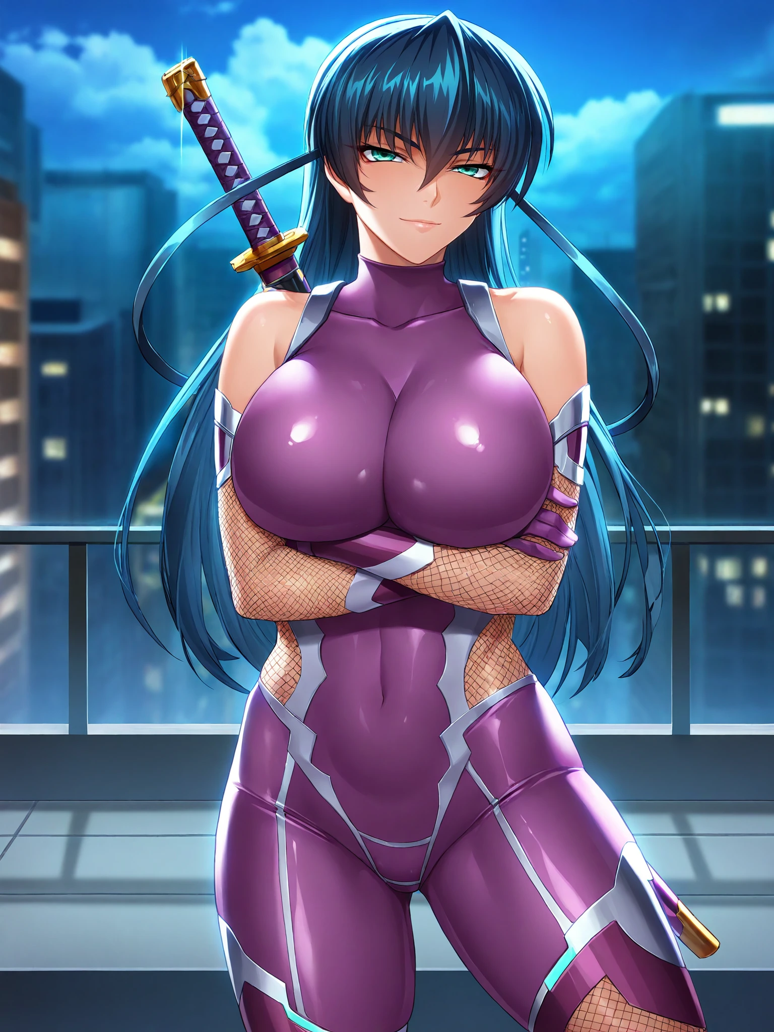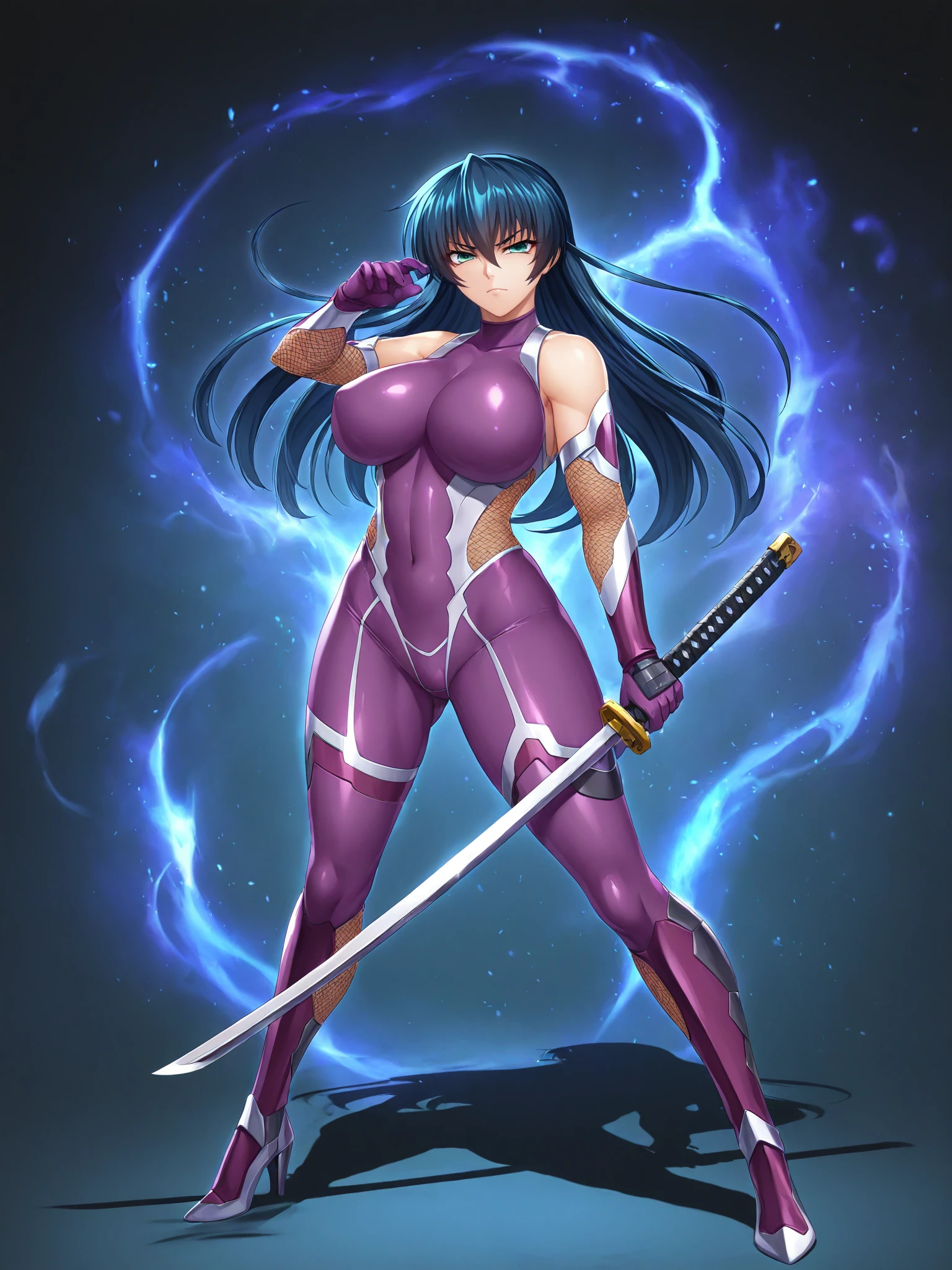 Bodysuit: purple bodysuit, bare shoulders, elbow gloves, fishnets, high heel boots,