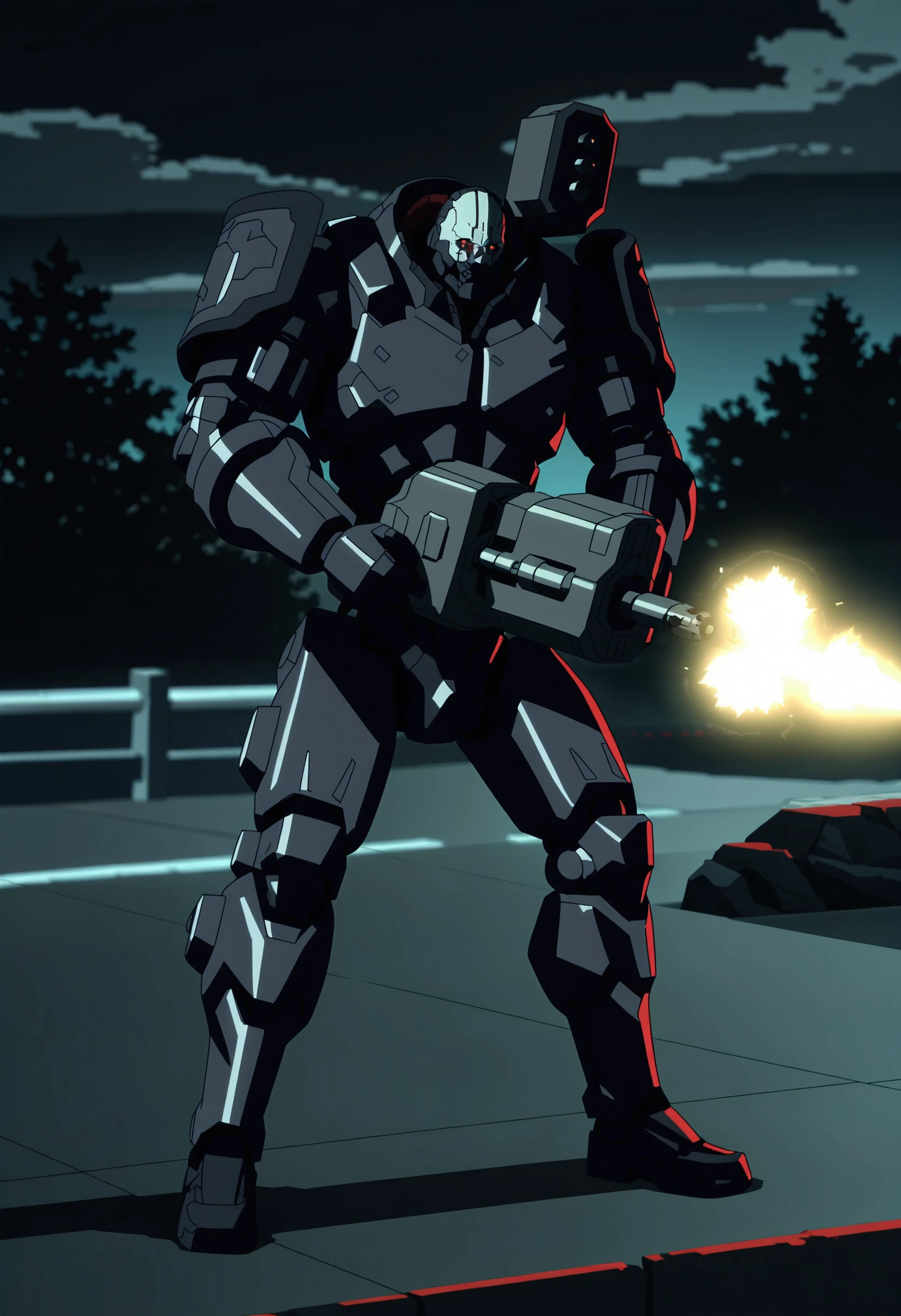 • adesilf, robot, red eyes, glowing eyes, shoulder cannon