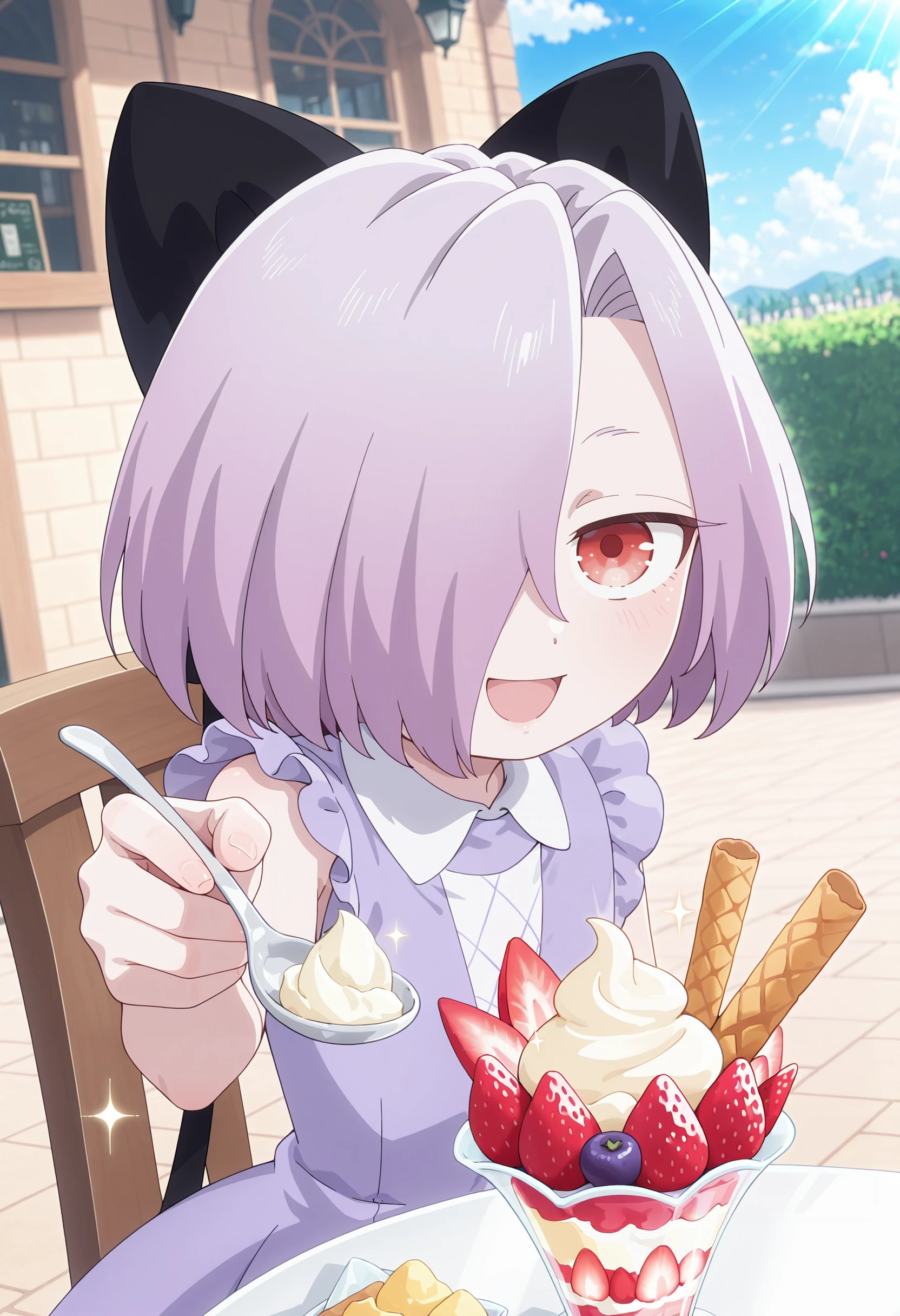 KizetsuCiel, red eyes, light purple hair, short hair, hair over one eye