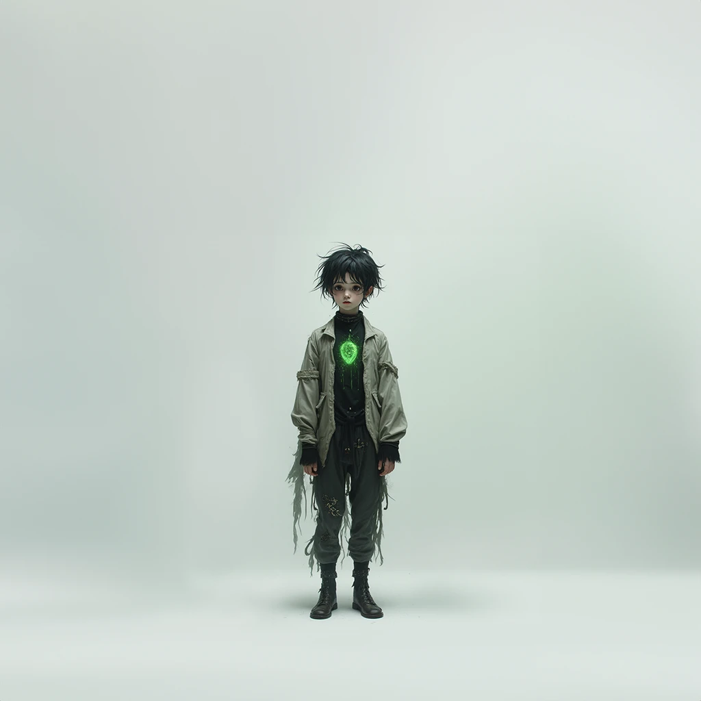 β€’ Black turtleneck with a glowing green heart in the center of his chest