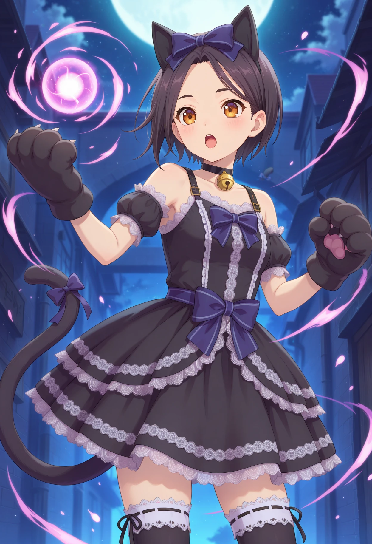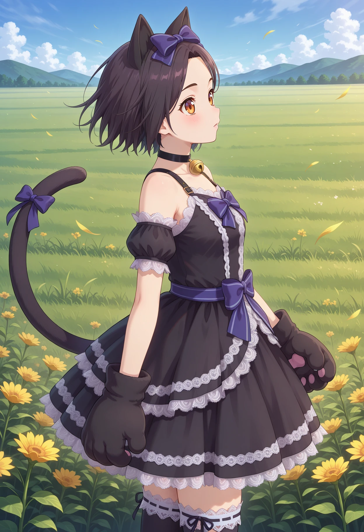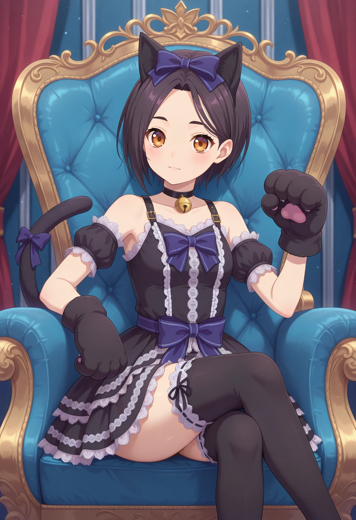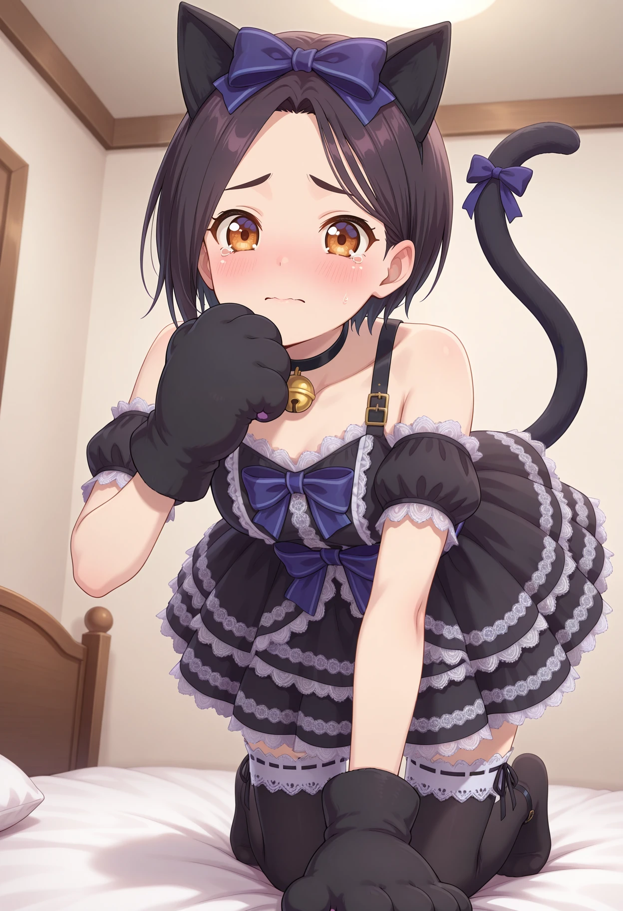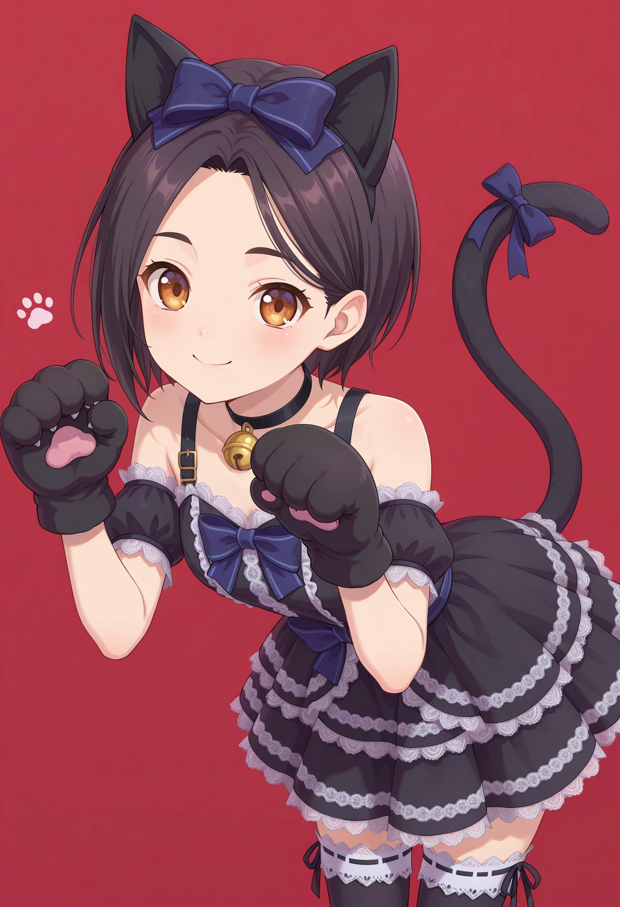 aarinwell, short hair, black hair, animal ears, hair bow, brown eyes, cat tail, tail ribbon, black choker, neck bell, frilled dress, black dress, animal hands, detached sleeves, short sleeves, paw gloves, black thighhighs