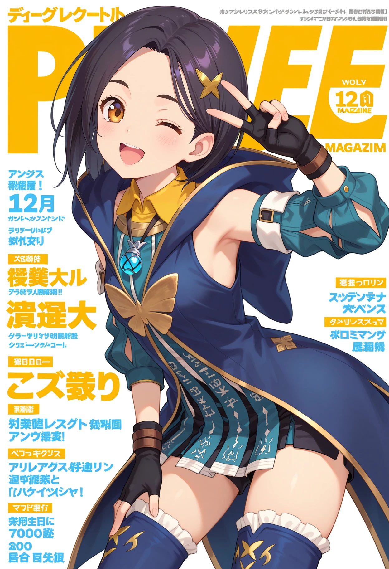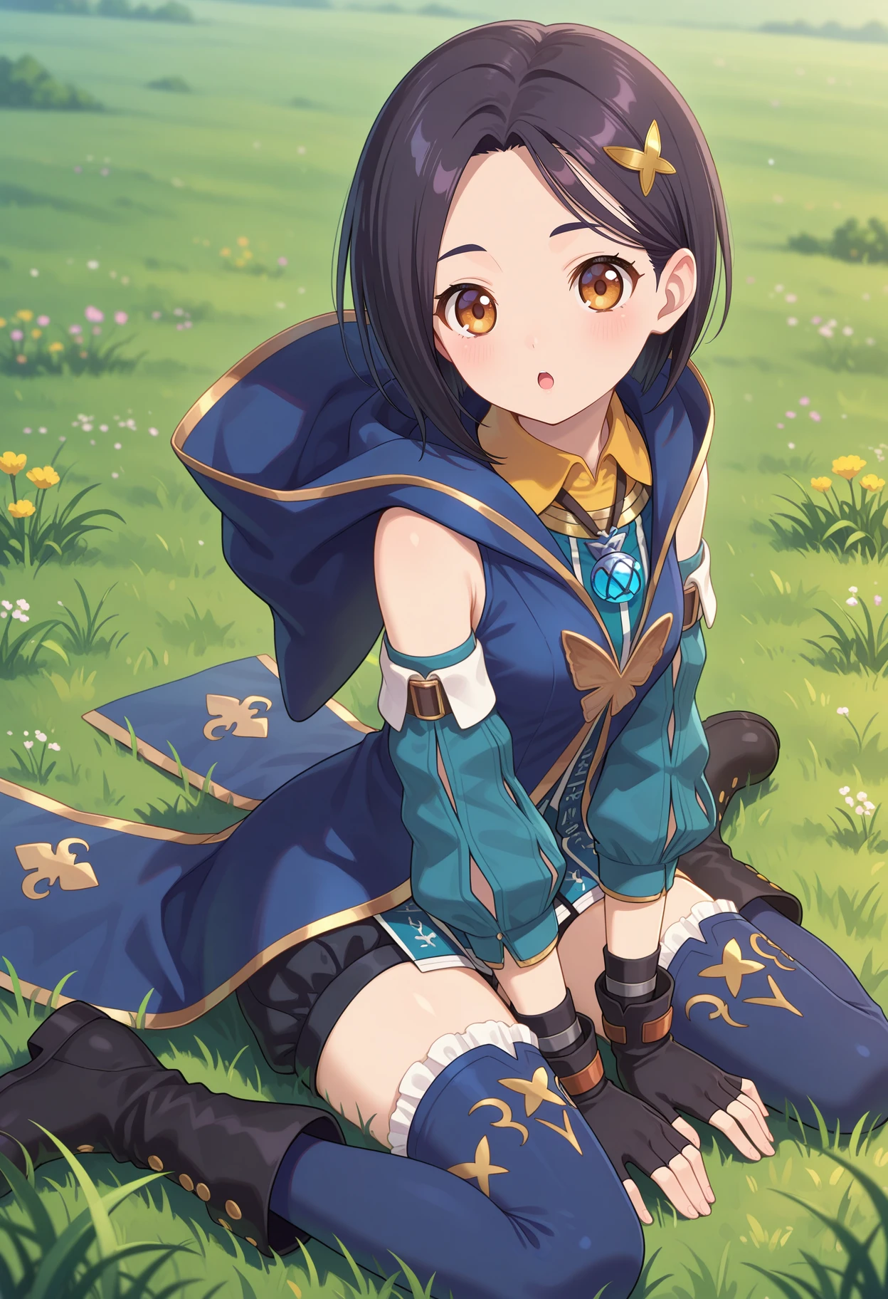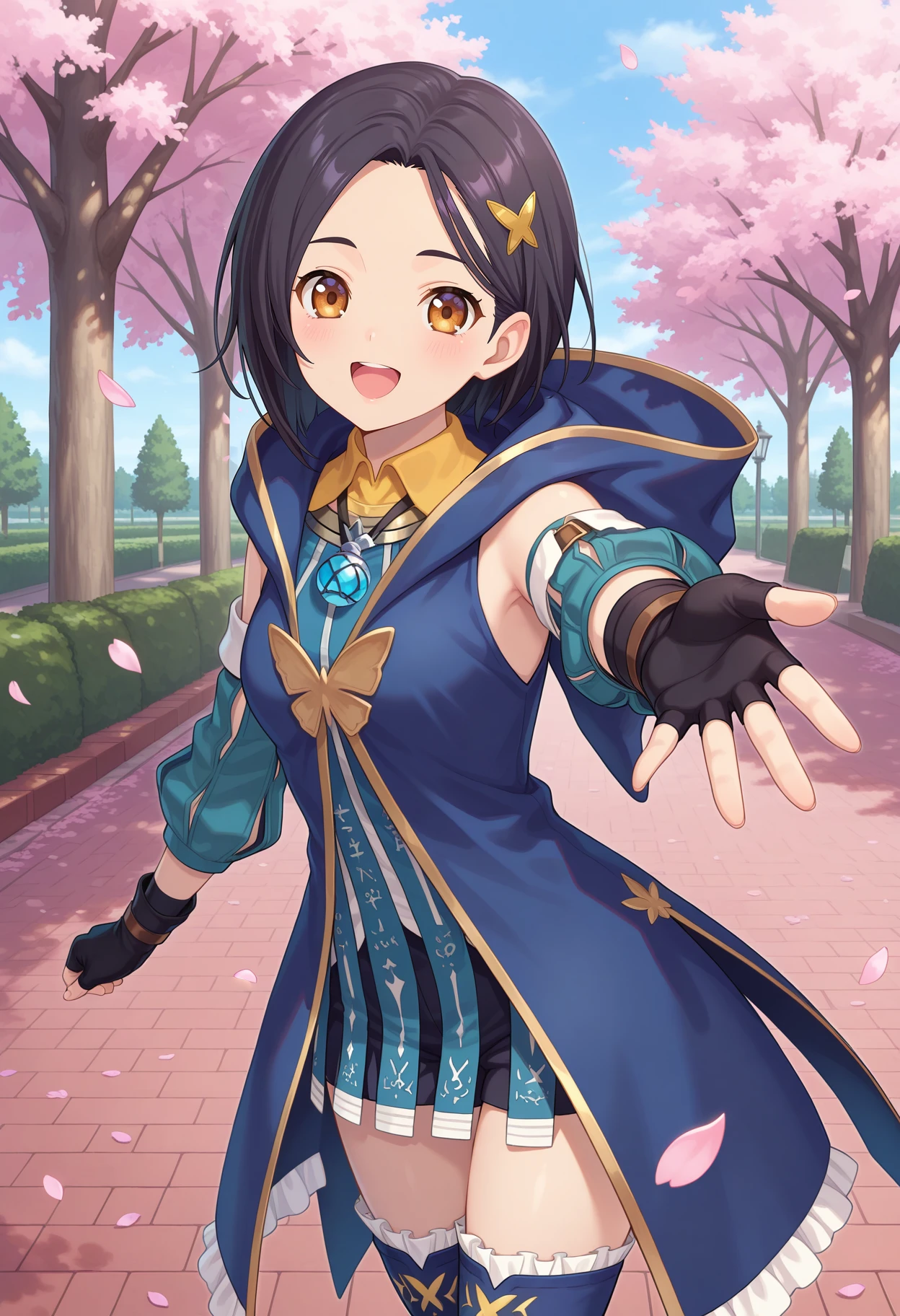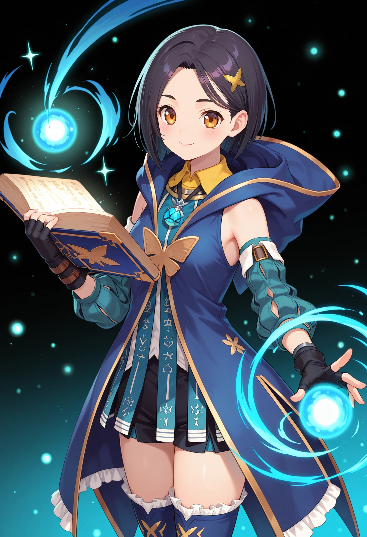 aarinwell, short hair, black hair, hair ornament, brown eyes, pendant, blue dress, hood, sleeveless coat, blue coat, detached sleeves, fingerless gloves, black gloves, black shorts, blue thighhighs