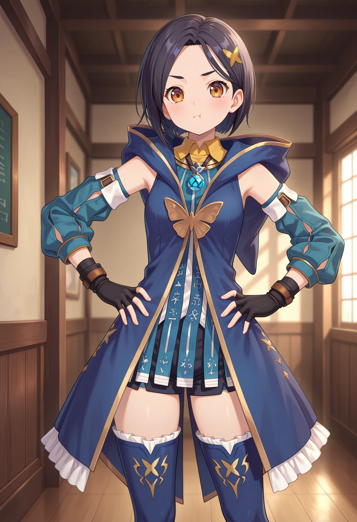 outfit1aarinwell, short hair, black hair, hair ornament, brown eyes, pendant, blue dress, hood, sleeveless coat, blue coat, detached sleeves, fingerless gloves, black gloves, black shorts, blue thighhighs