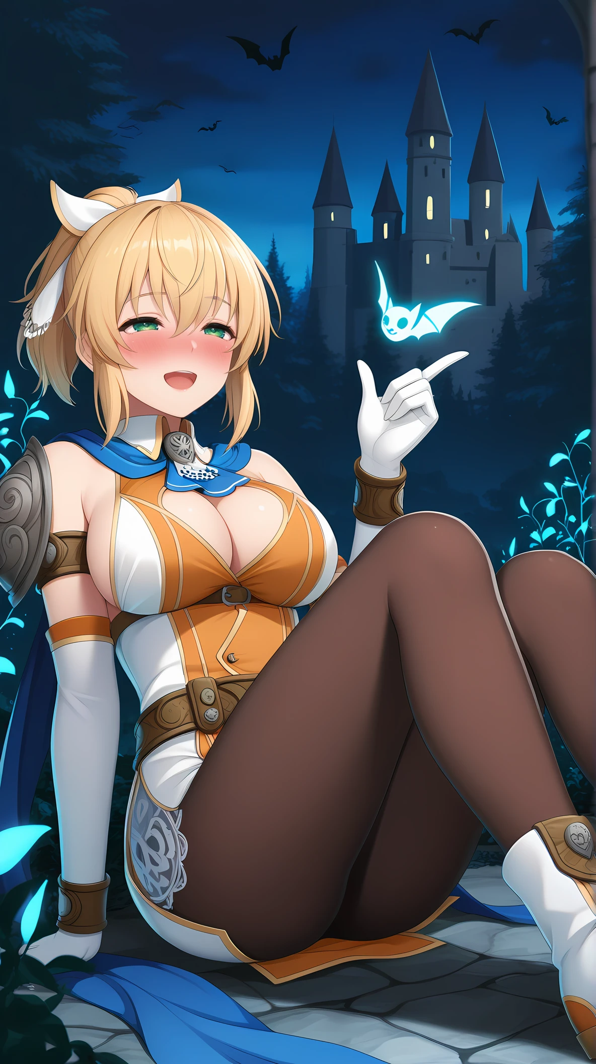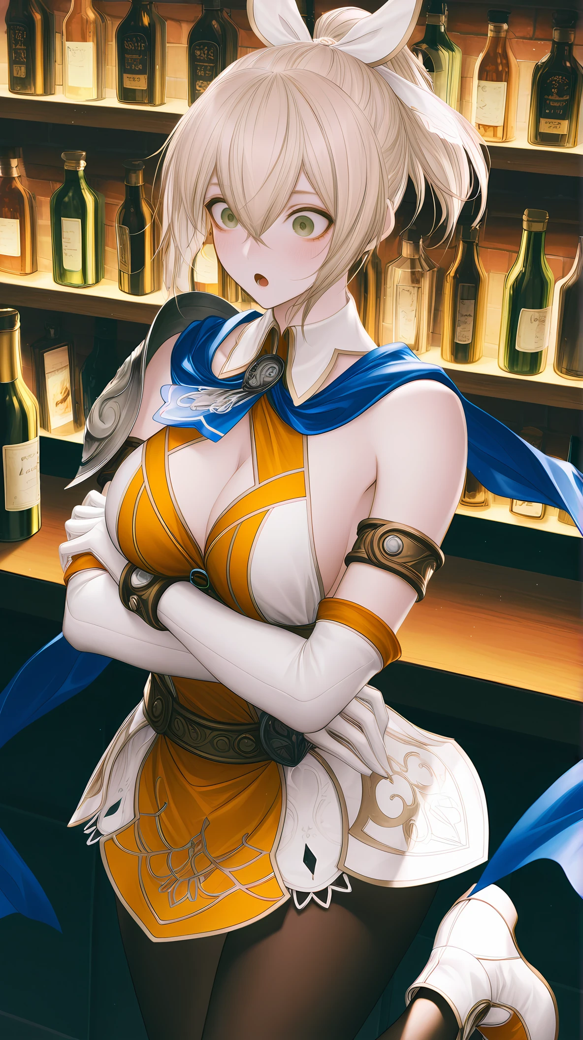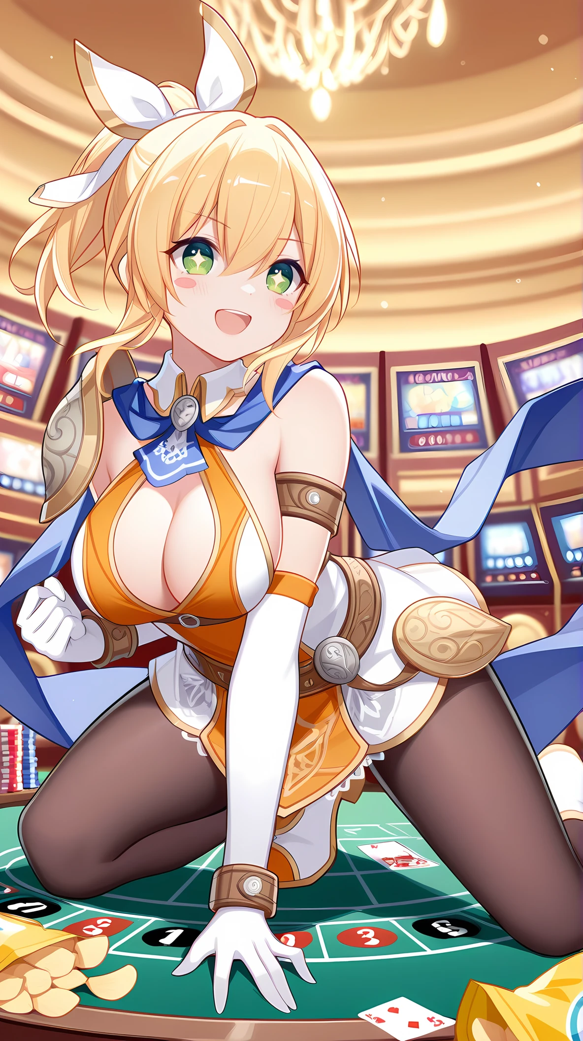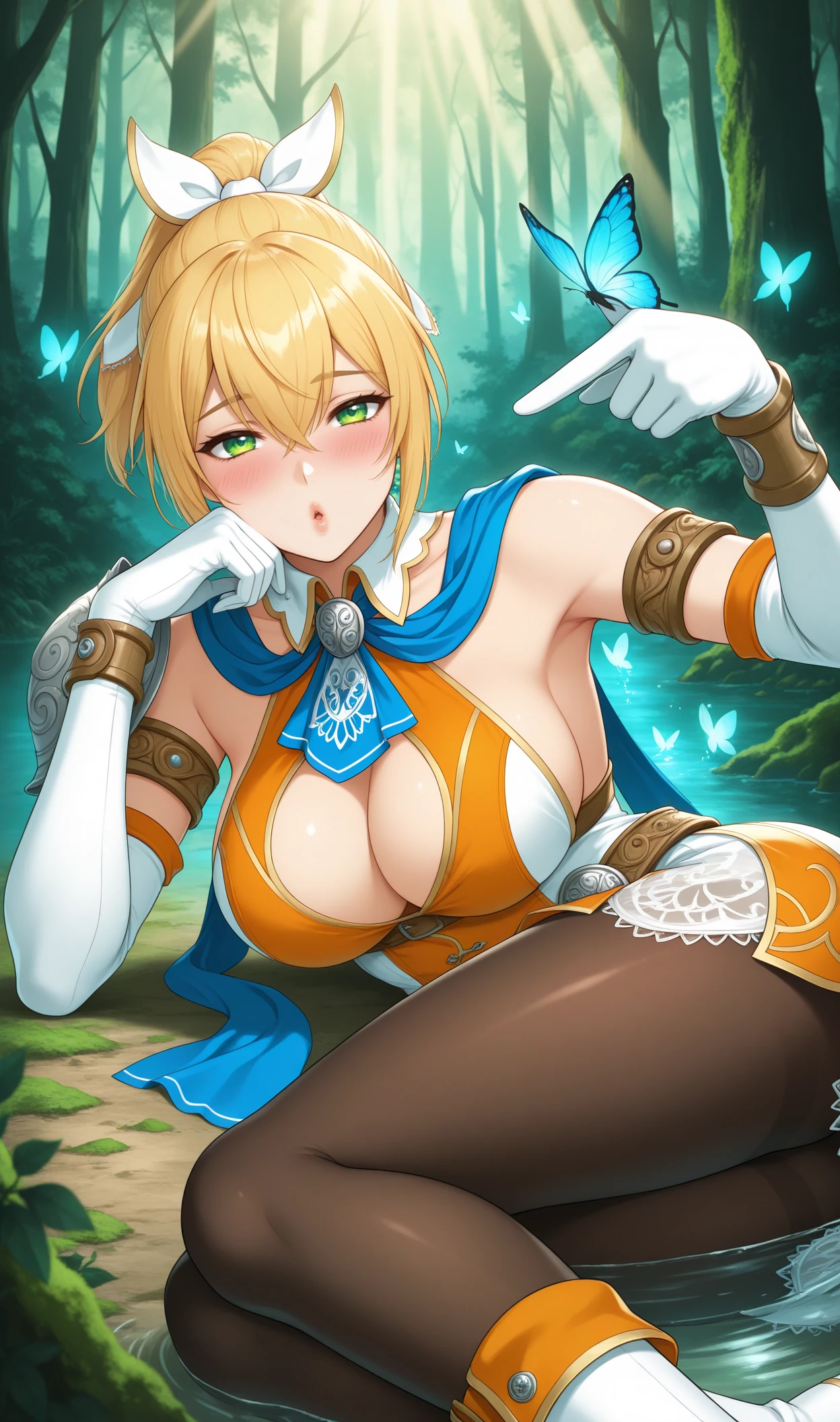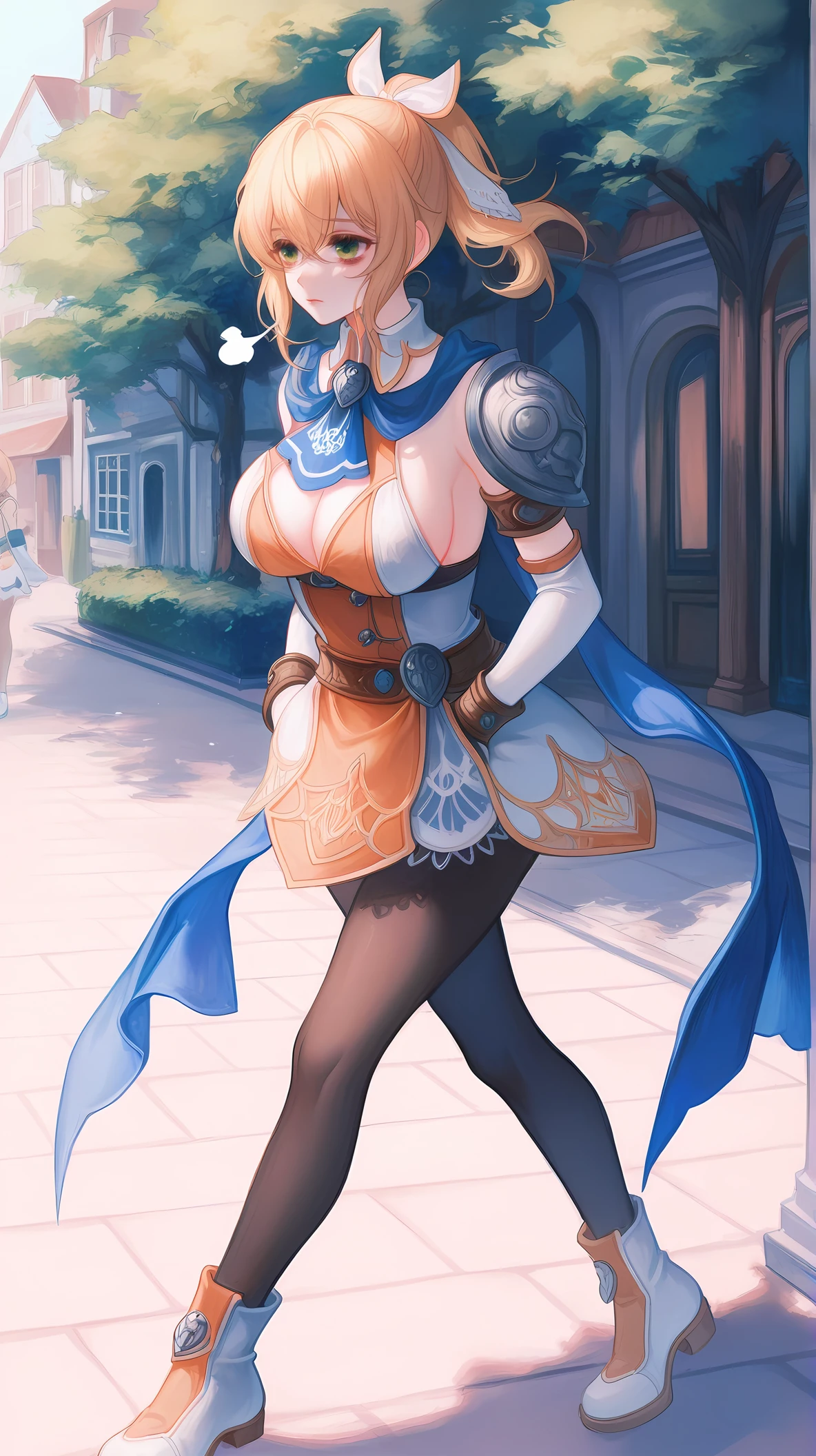 CsAlxndr, green eyes, blonde hair, hair between eyes, high ponytail, sidelocks, short hair, hair ornament, white gloves, ponytail, hair ribbon, white ribbon, blue ascot, blue scarf, two-tone dress, orange dress, white dress, sleeveless dress, short dress, lace-trim, brown pantyhose, detached sleeves, elbow gloves, jewelry, bracelet, shoulder armor, belt, armlet, cleavage cutout, cleavage, shoulder pad, sideboob, two-tone footwear, white footwear,