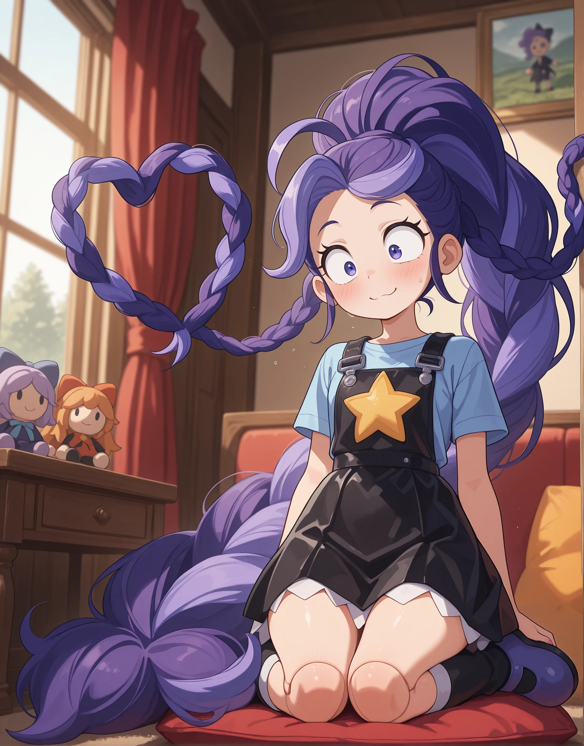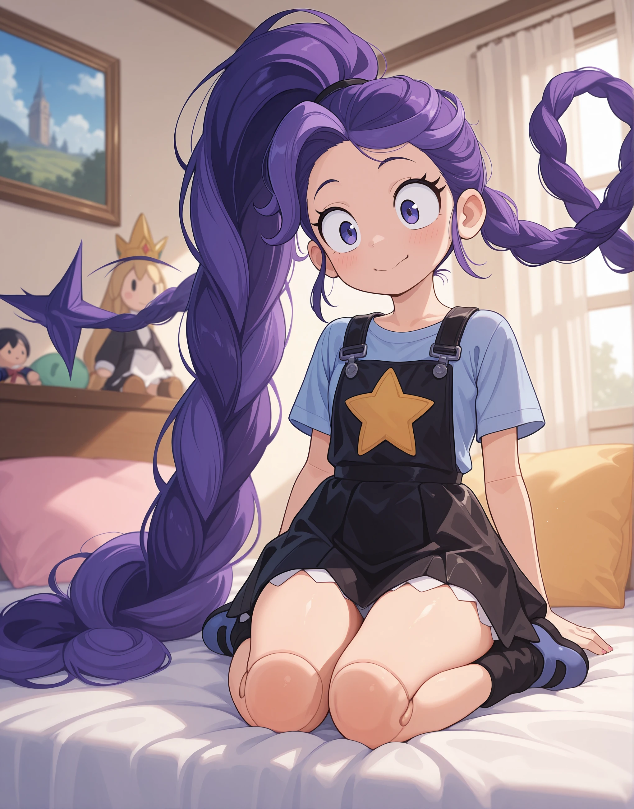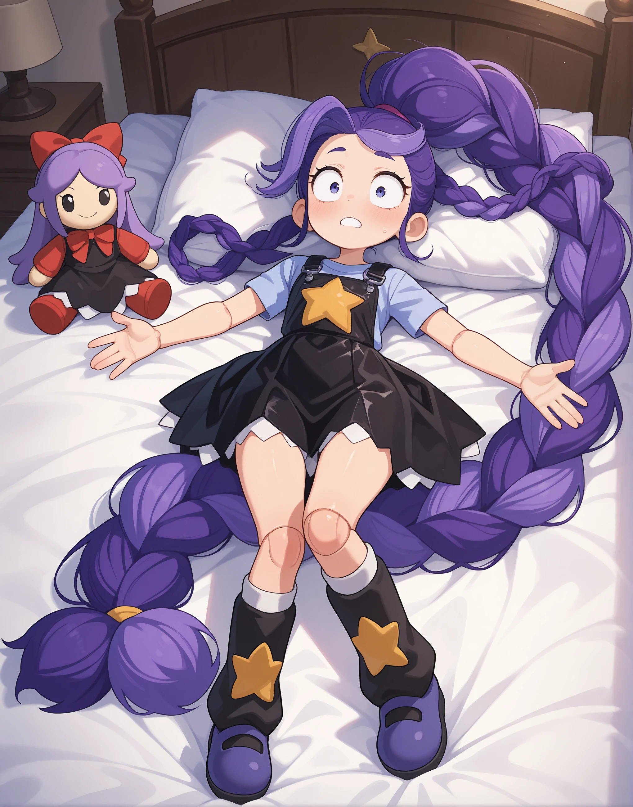 Lily_Lovebraids, 1girl, solo, purple shirt, short sleeves, black overall dress, pinafore dress, star print, star (symbol), black boots, knee bootsWorks phenomenally well with Anime/Illustrative SDXL checkpoints like Illustrious or NoobAI.