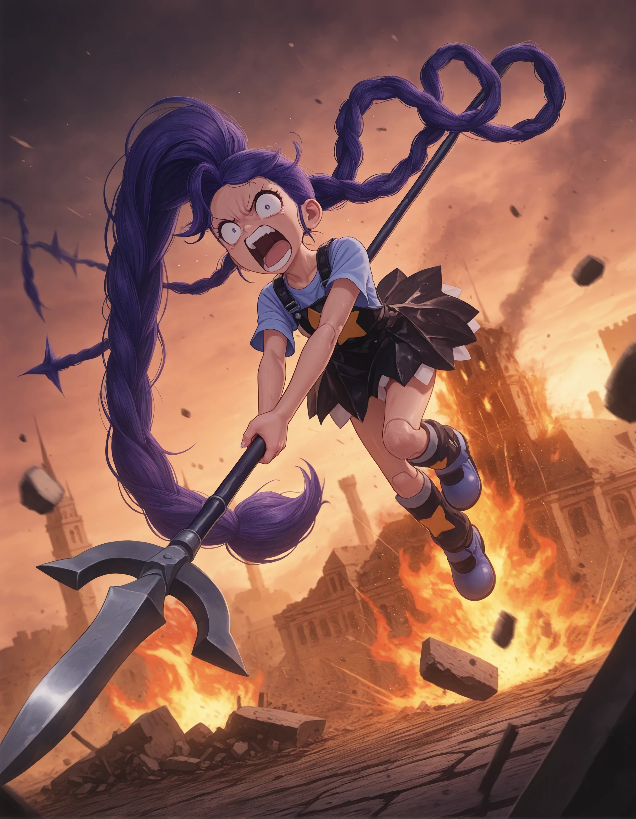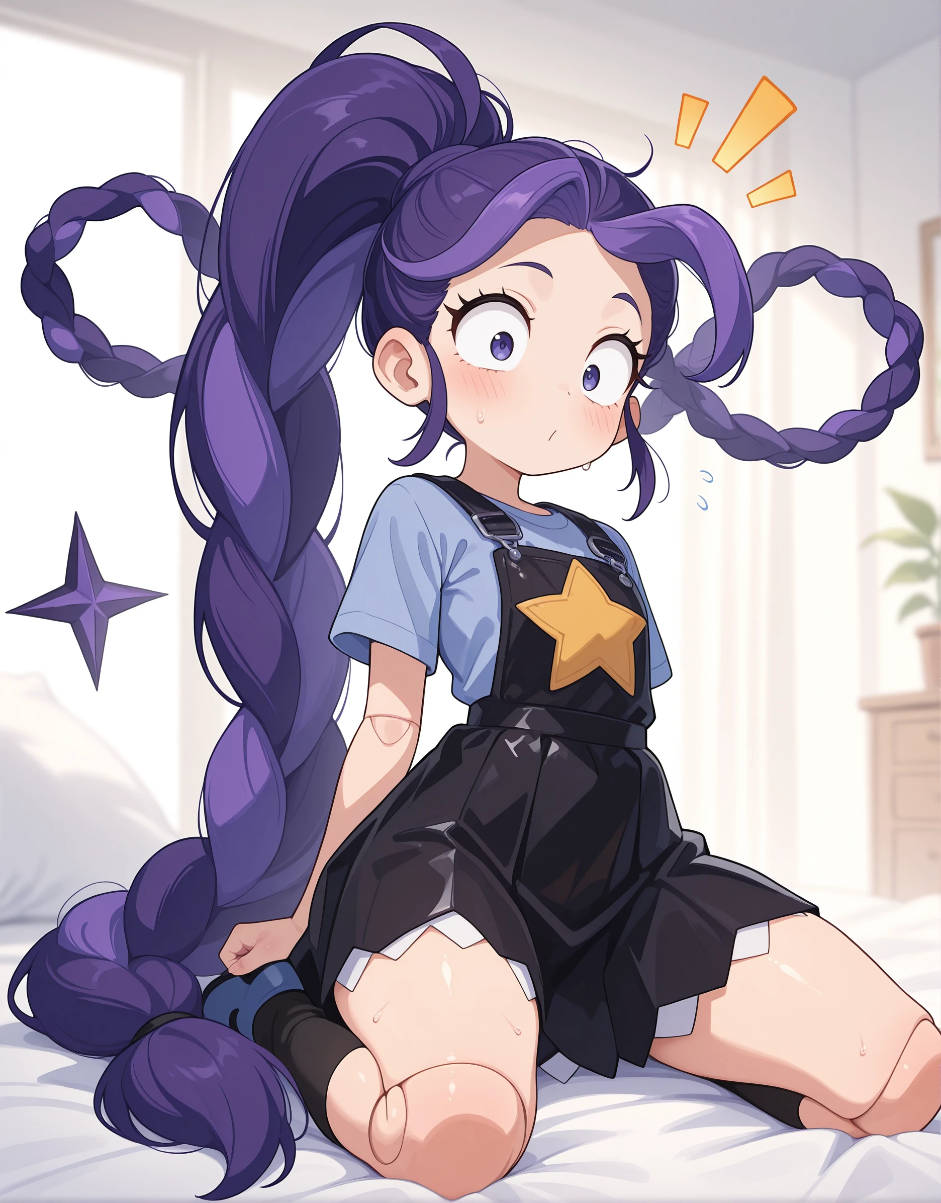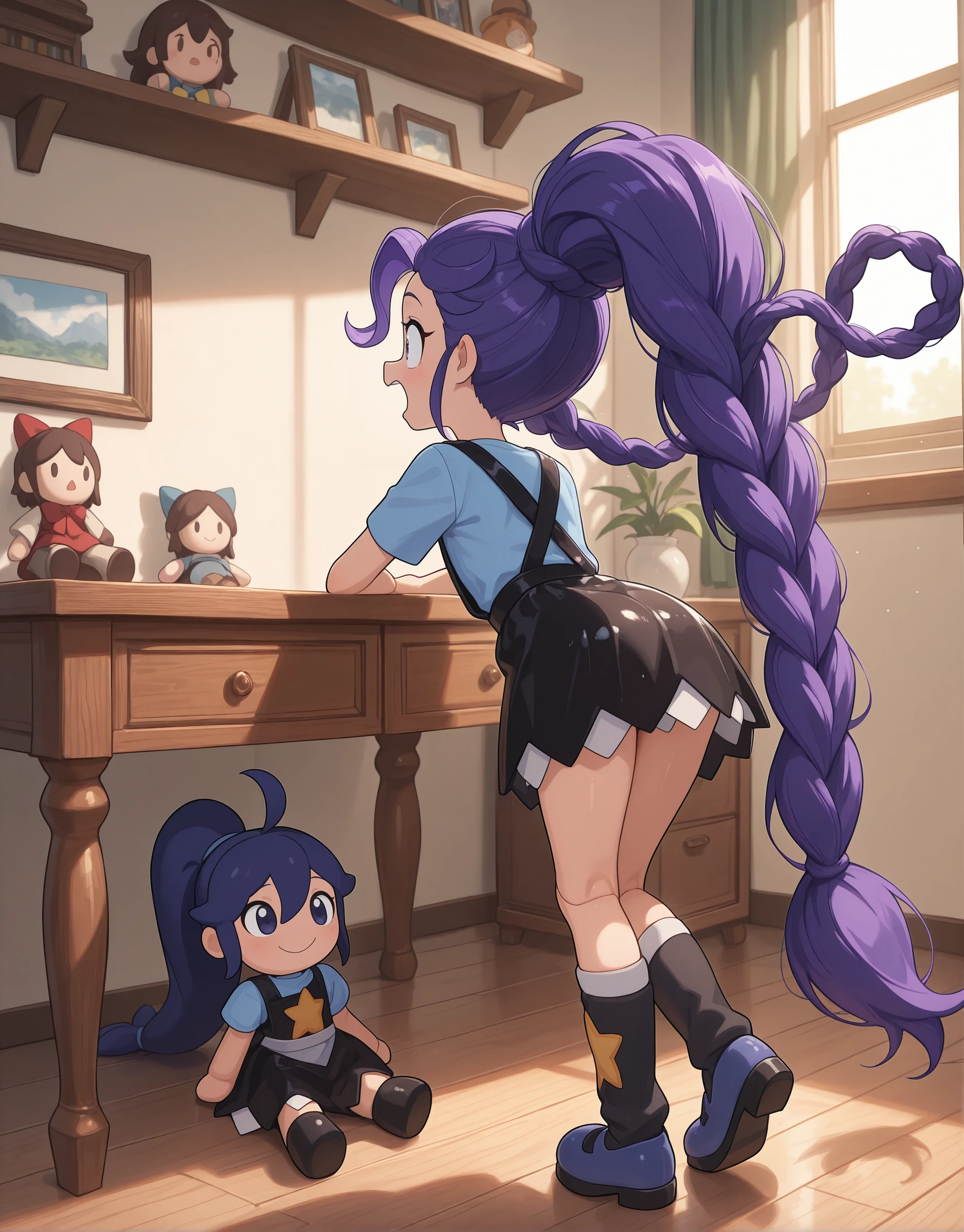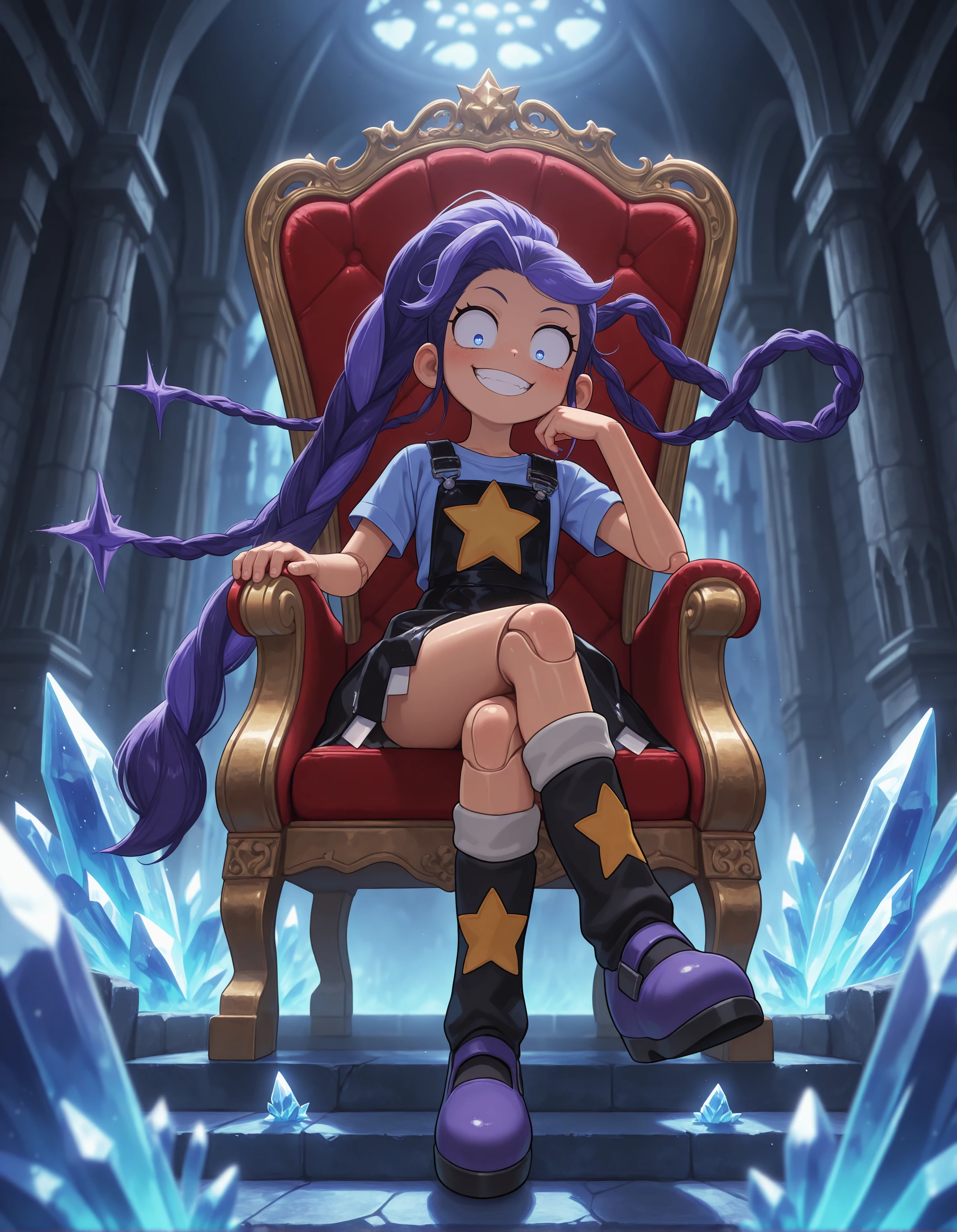 Lily_Lovebraids, 1girl, solo, purple shirt, short sleeves, black overall dress, pinafore dress, star print, star (symbol), black boots, knee bootsWorks phenomenally well with Anime/Illustrative SDXL checkpoints like Illustrious or NoobAI.