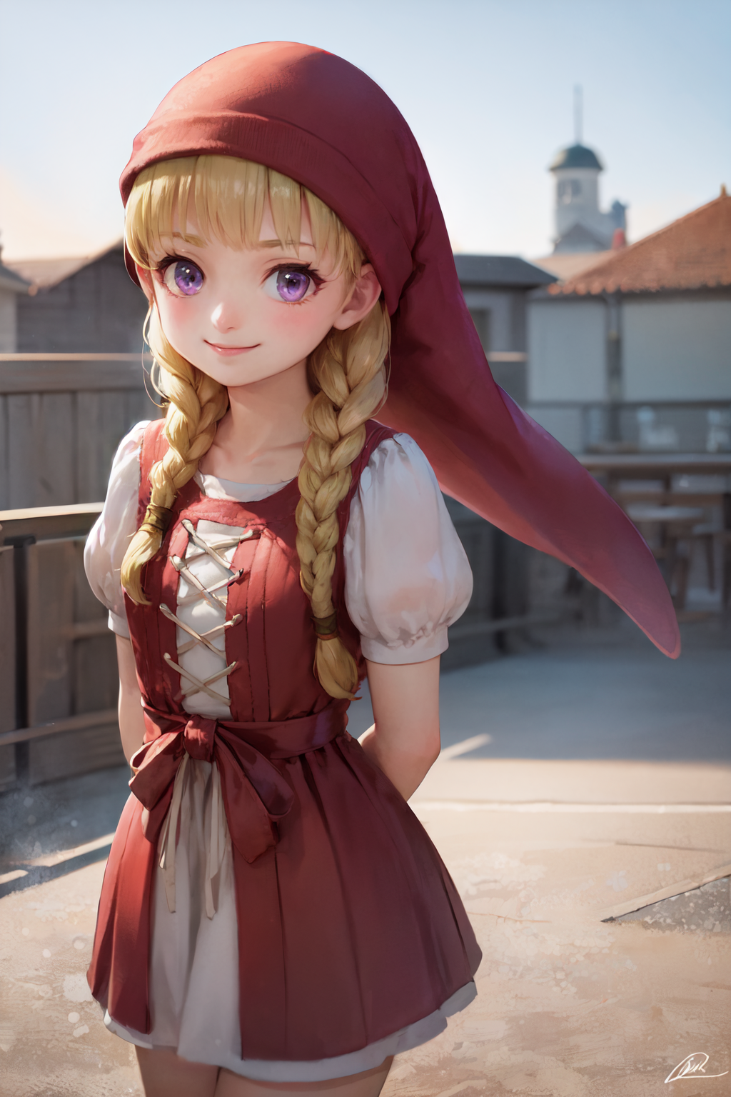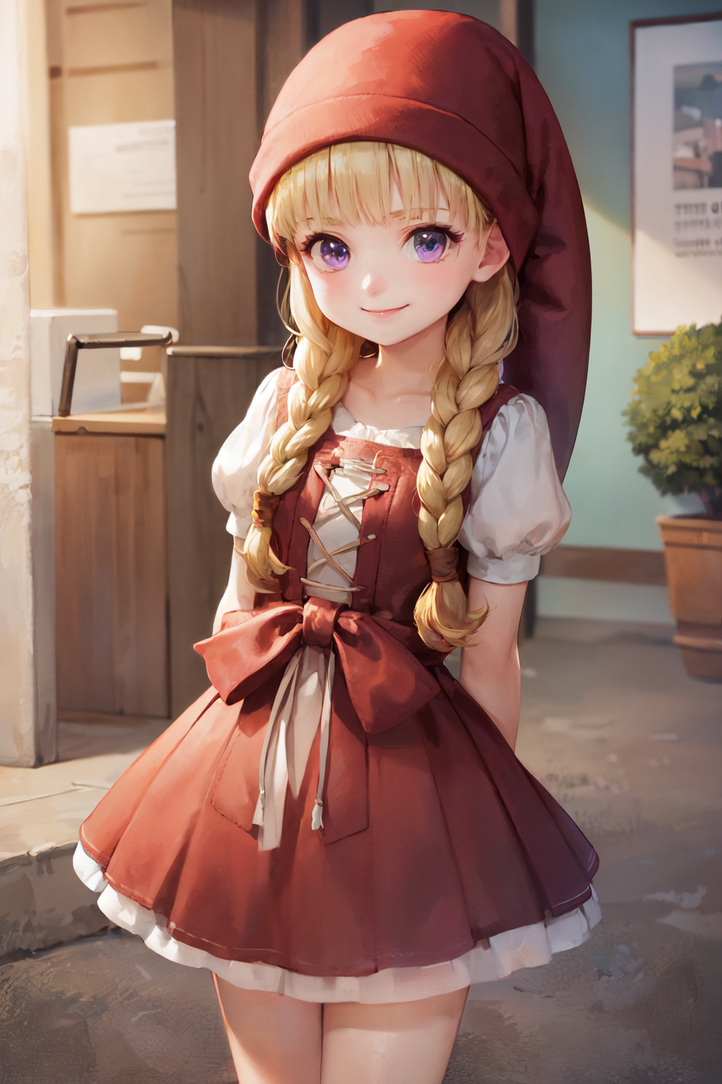 Default Outfit: red hat, red dress, puffy short sleeves, jewelry, bracelet