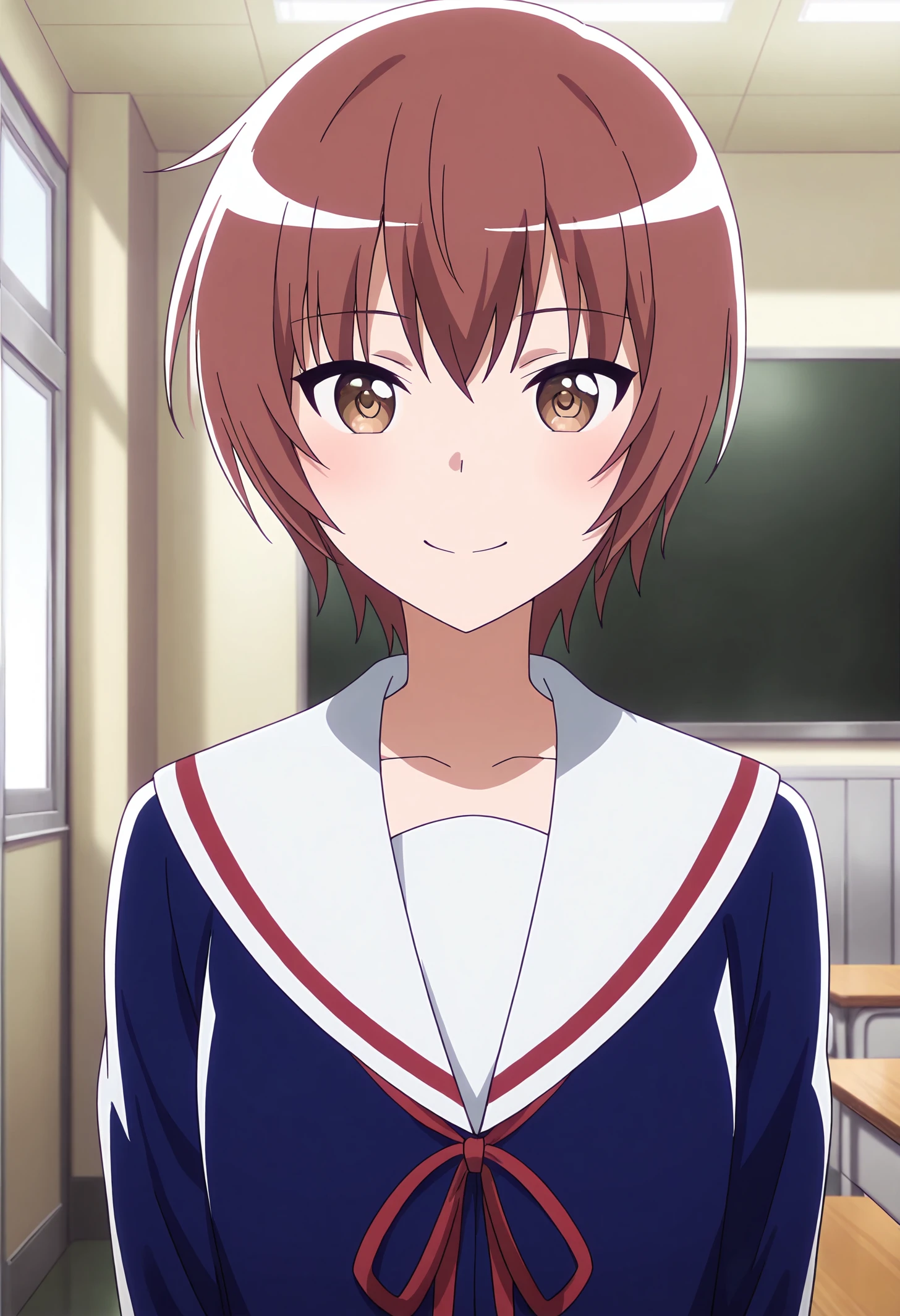 school uniform, chest ribbon, sailor collar, blue shirt, grey skirt, black pantyhose,