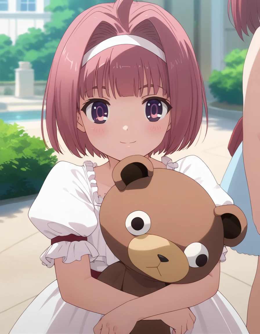 mint_clark, ahoge, purple eyes, pink hair, short hair, hairband, hair intakes,