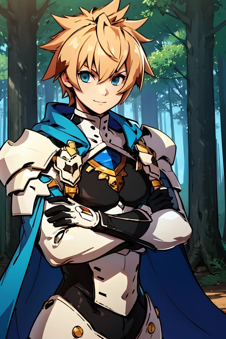 deadlychaser, blue eyes, blonde hair, brown hair, multicolored hair, gloves, 1boy, male focus, armor, spiked hair, cape