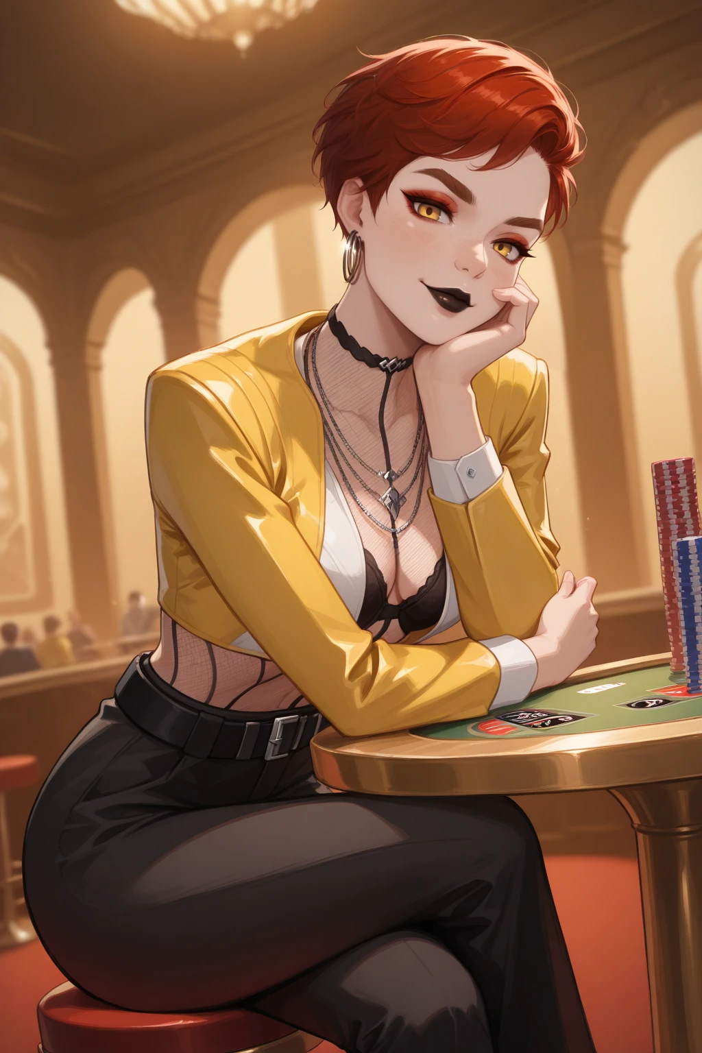 4ur0re, freckles, medium breasts, yellow eyes, thick eyebrows, red hair, short hair, sidecut, eyeshadow, black lips, hoop earrings, black choker