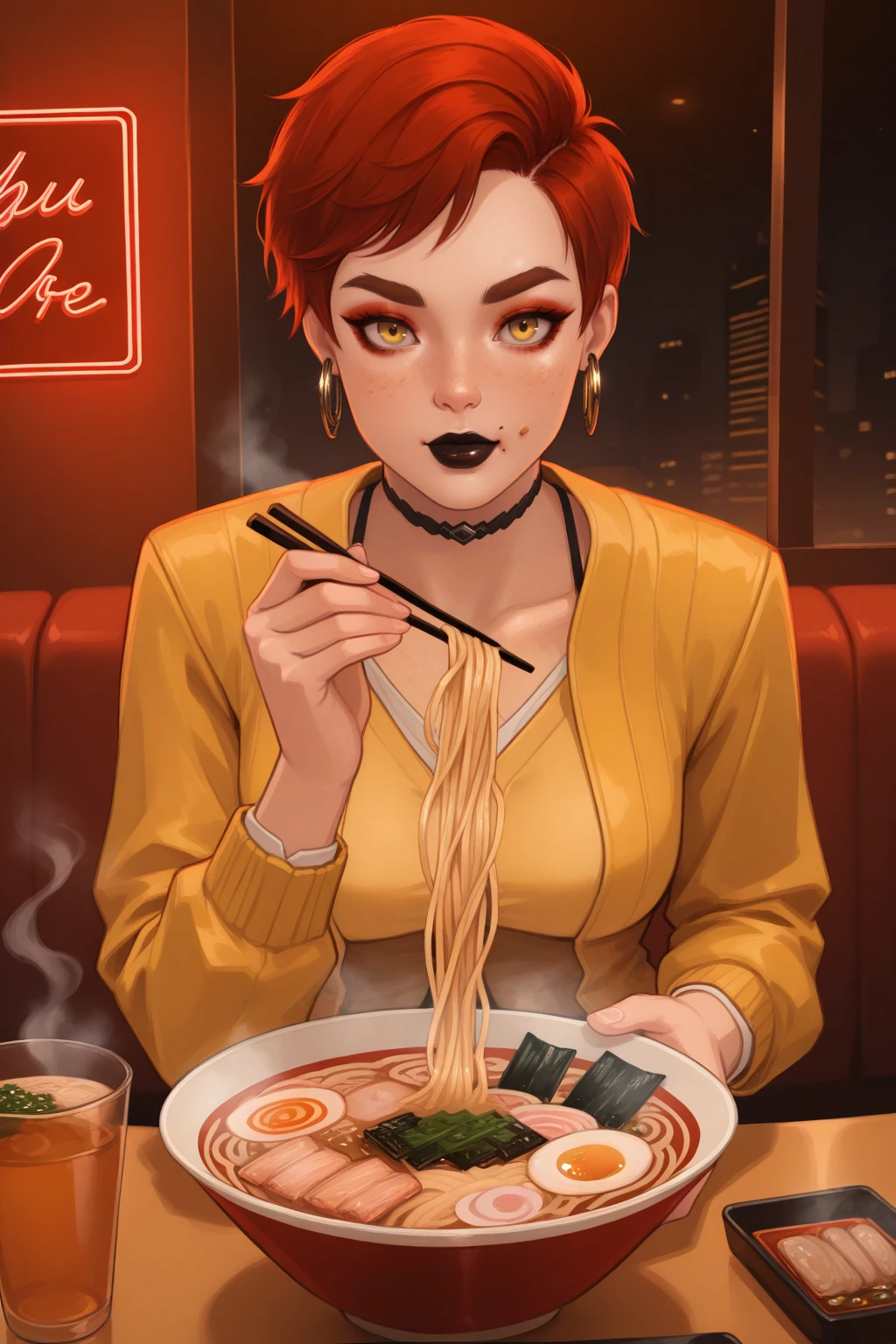 Appearance : 4ur0re, freckles, medium breasts, yellow eyes, thick eyebrows, red hair, short hair, sidecut, eyeshadow, black lips, hoop earrings, black choker