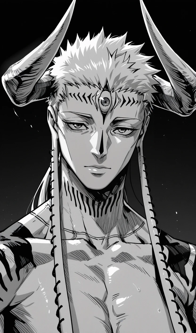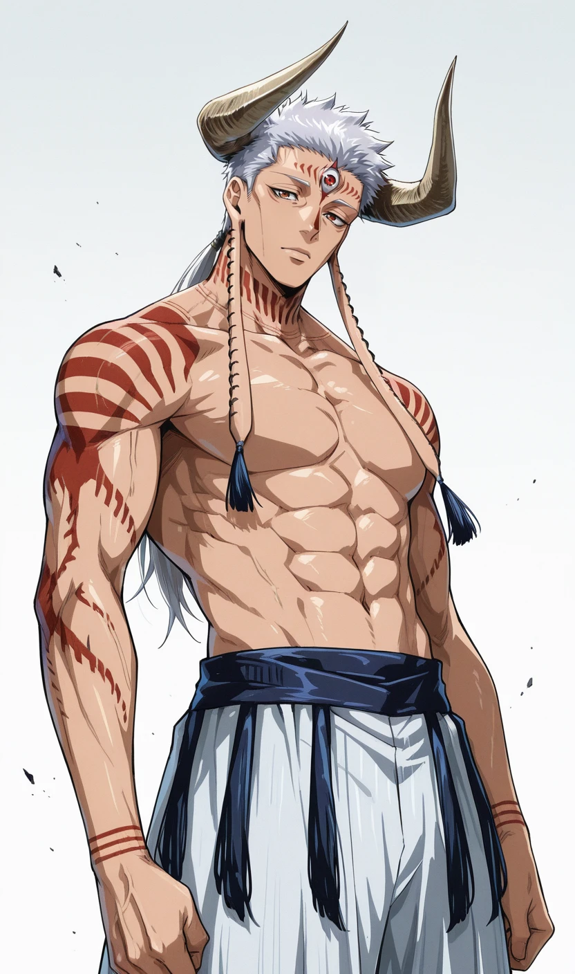 jujutsu kaisen modulo, dabura karaba, third eye, horns, long earlobes, earrings, tassel earrings, tattoo, muscular male, facial tattoo, white hair, puffy white pants,