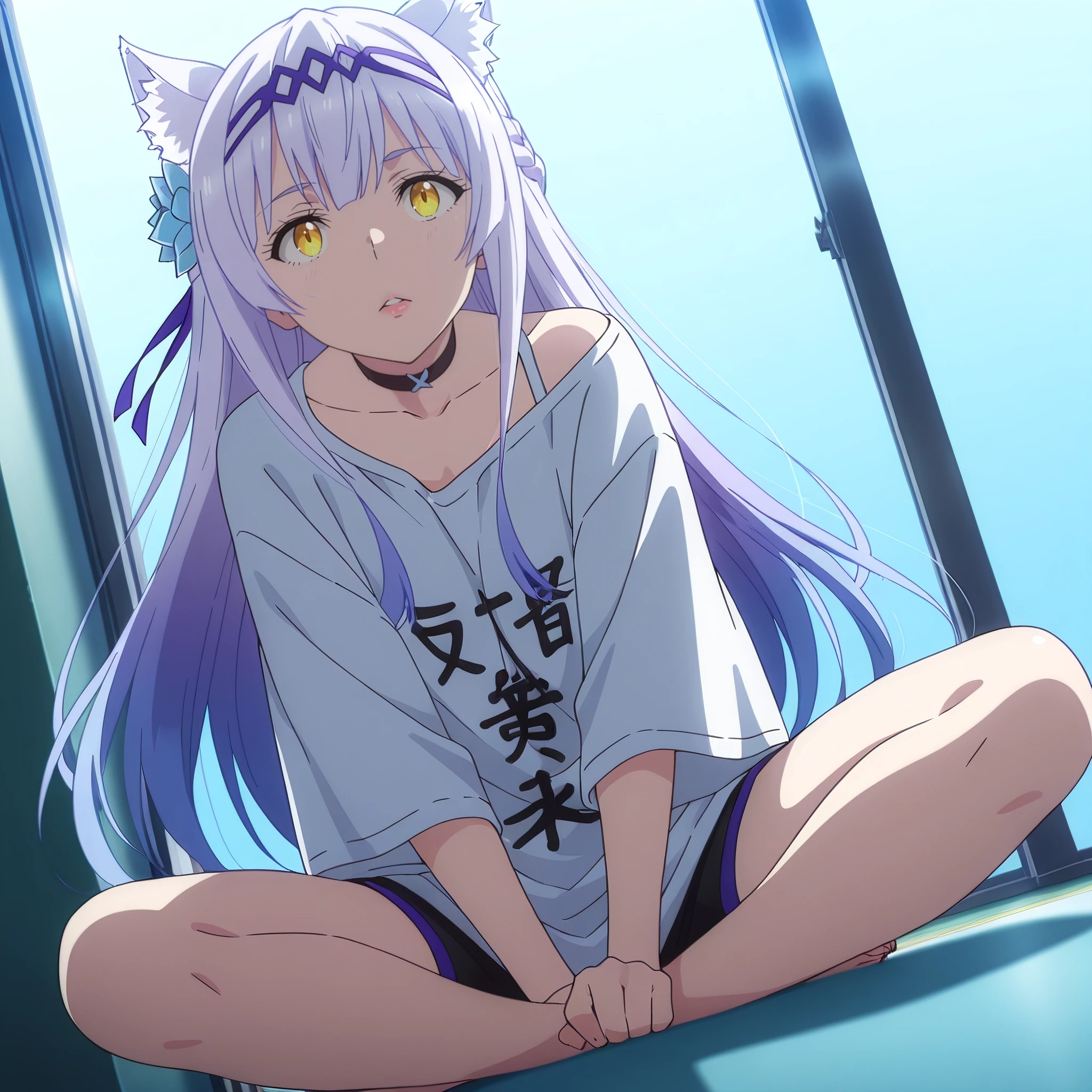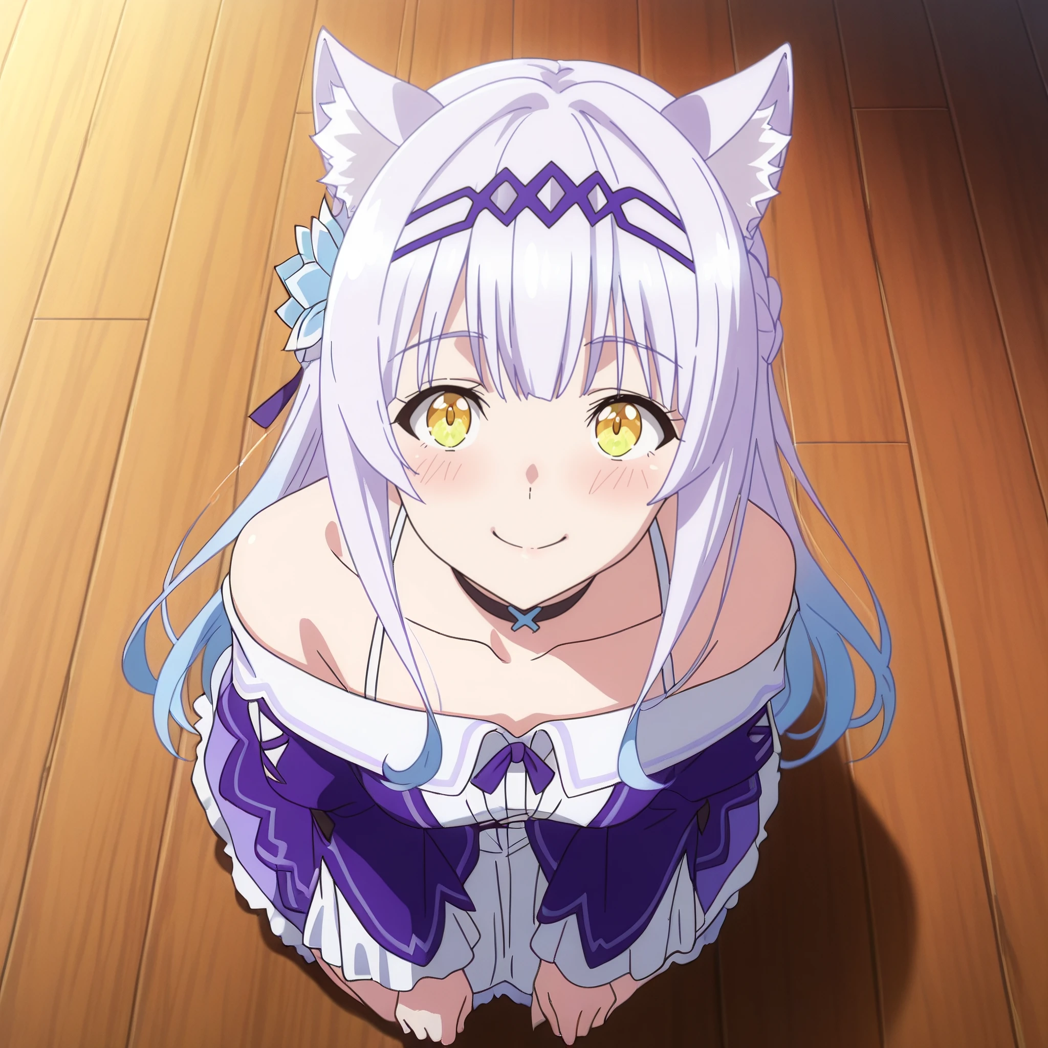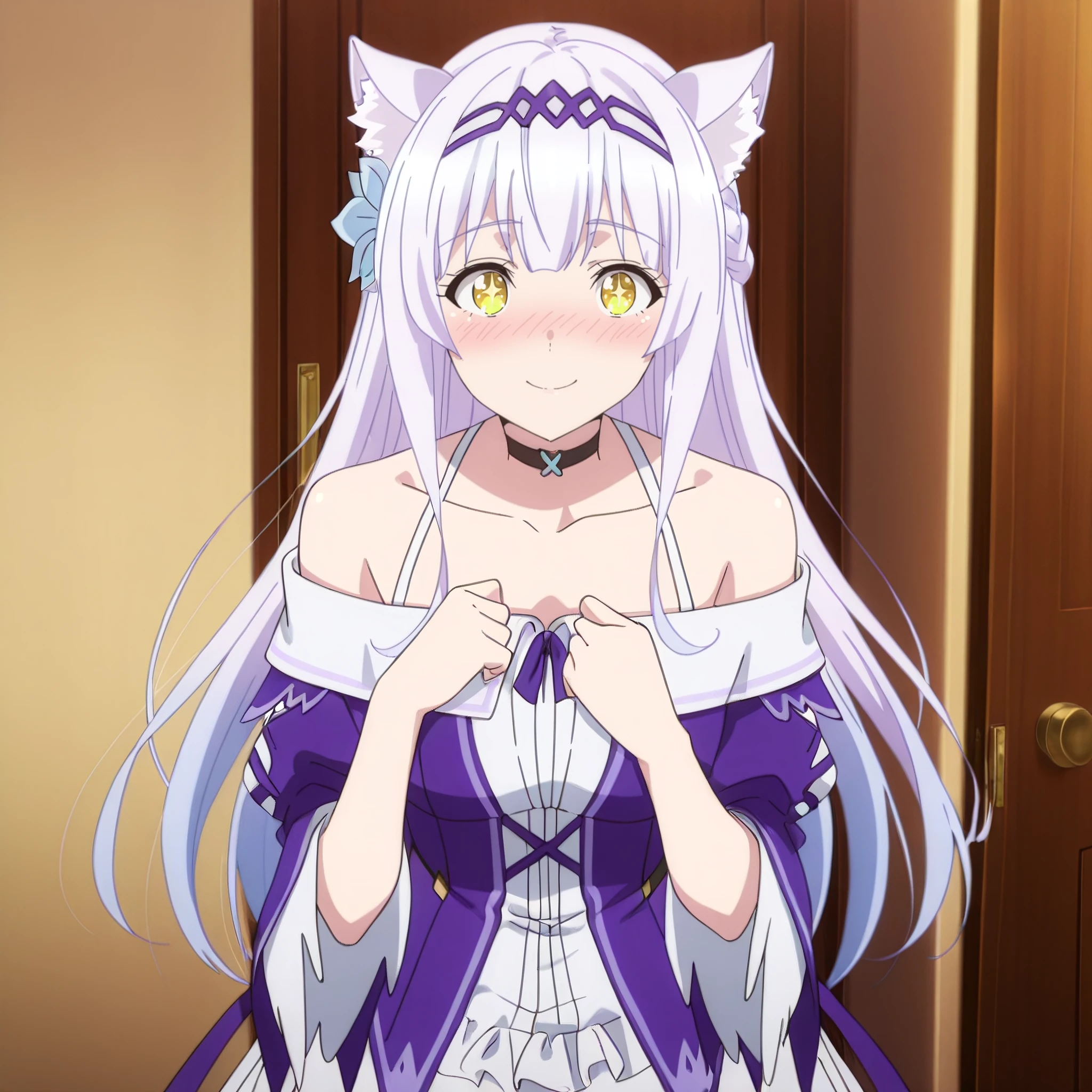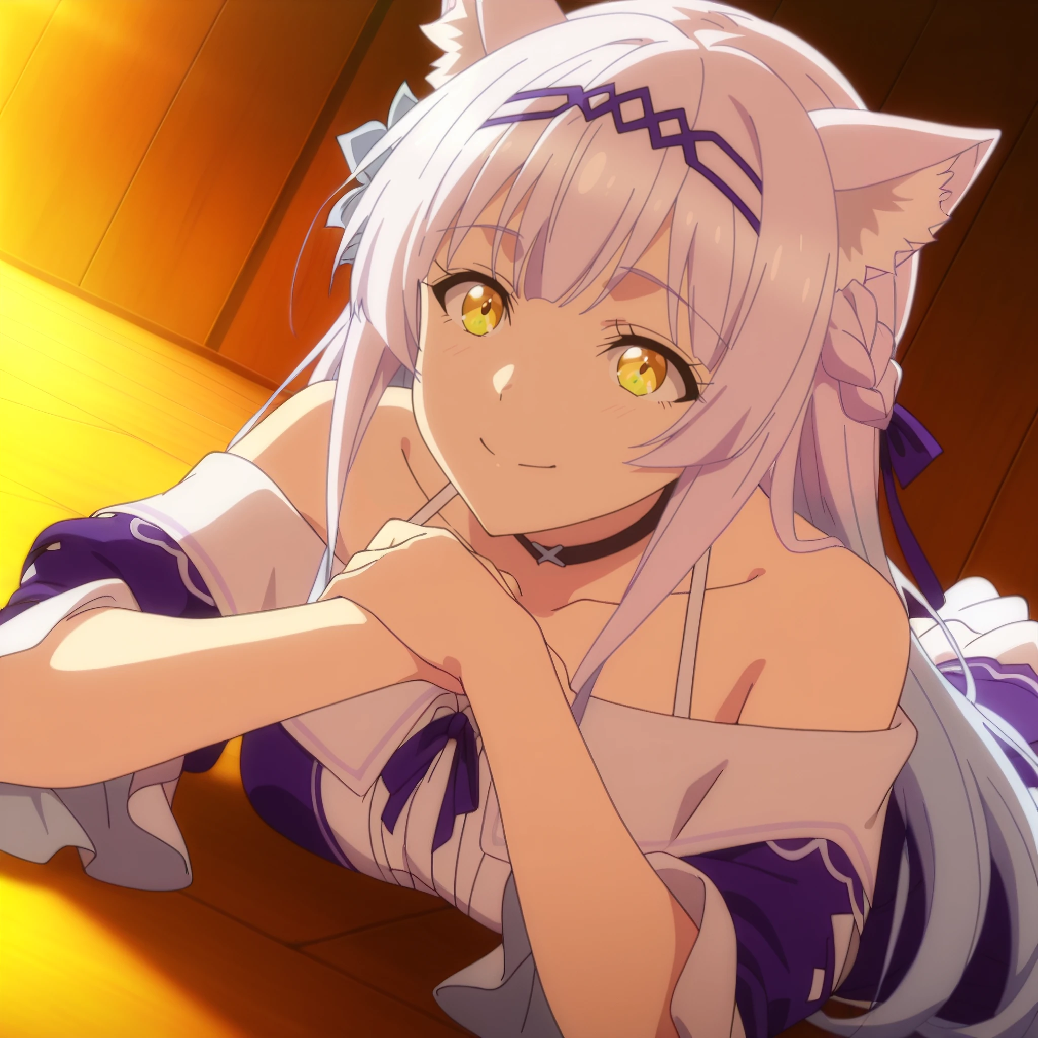 SRAClaire, purple hair, long hair, animal ears, black choker, yellow eyes, hairband, cat ears, animal ear fluff, hair ornament, white hair flower, braid, hair ribbon, sidelocks,