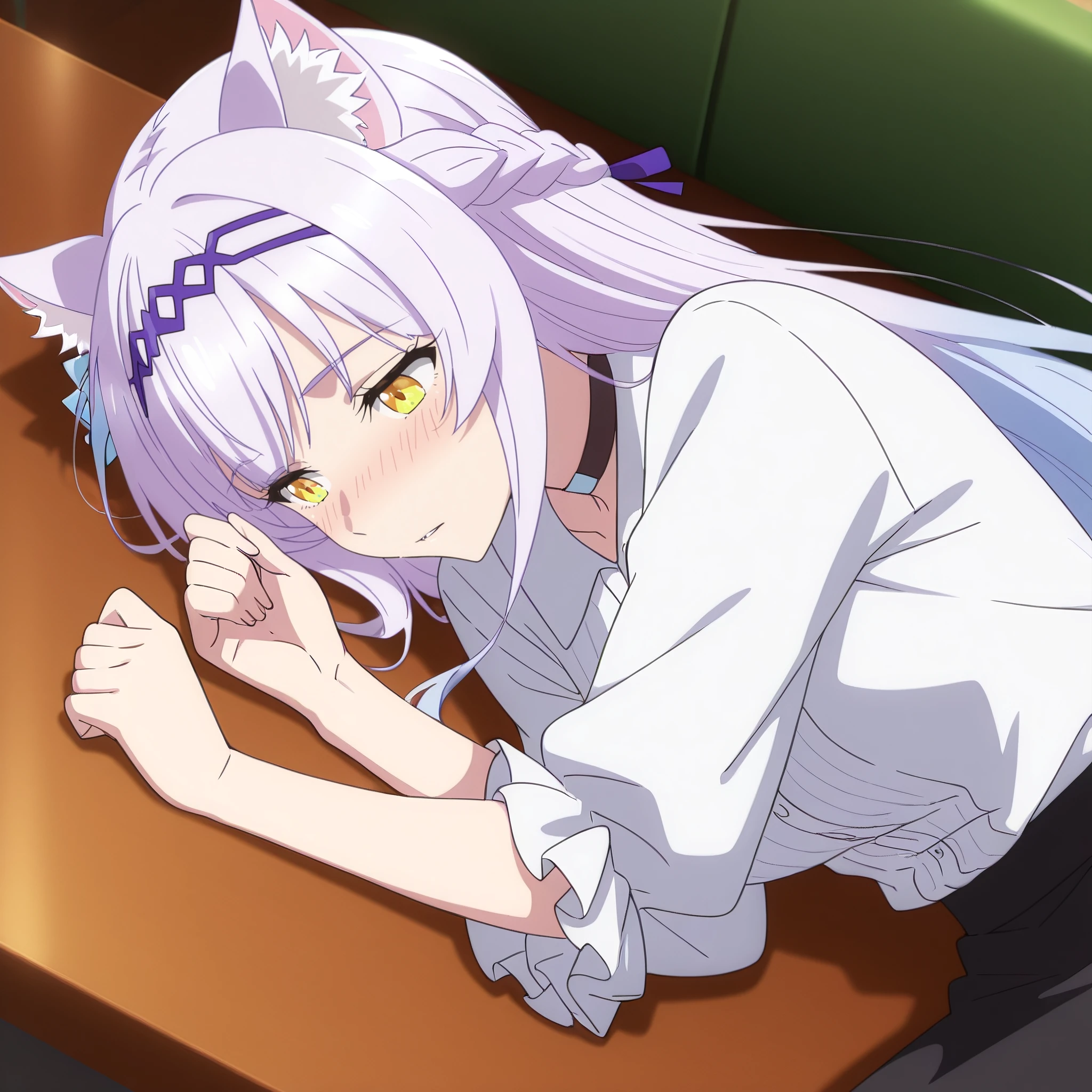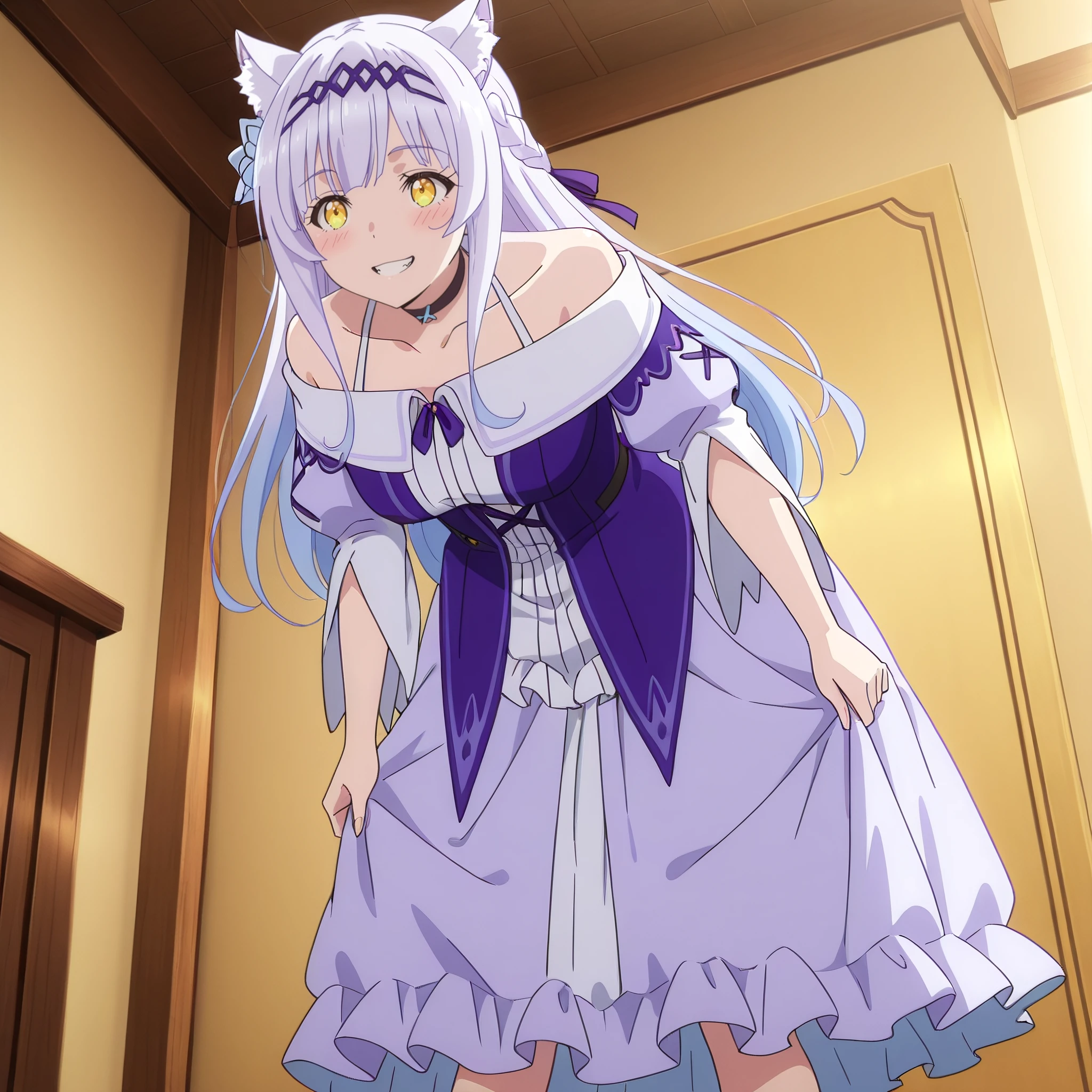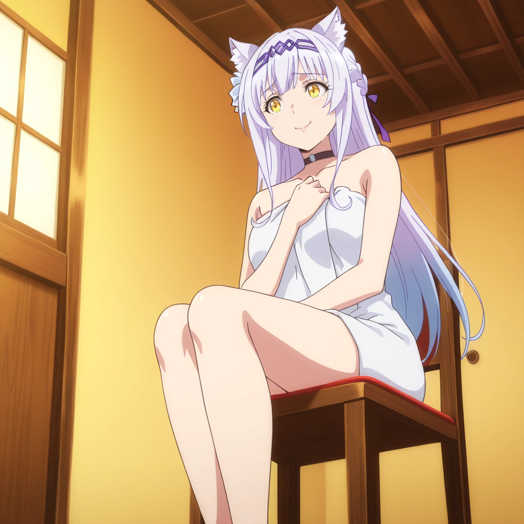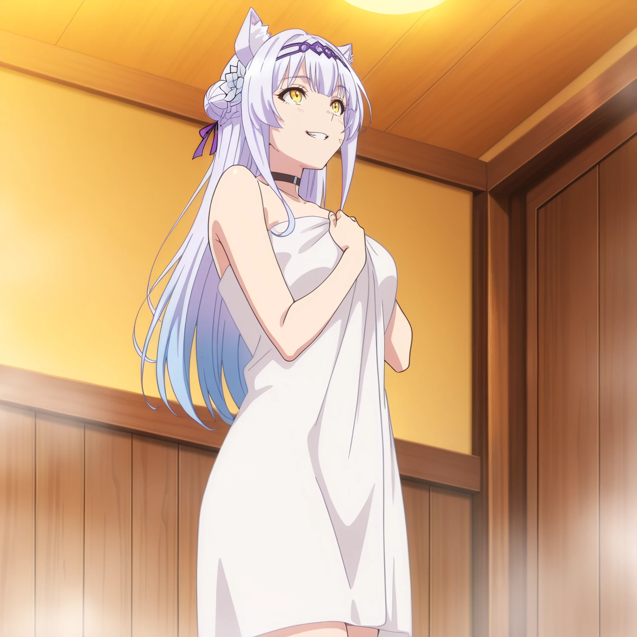SRAClaire, purple hair, long hair, animal ears, black choker, yellow eyes, hairband, cat ears, animal ear fluff, hair ornament, white hair flower, braid, hair ribbon, sidelocks,