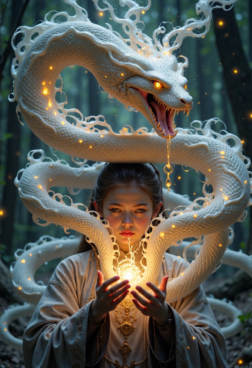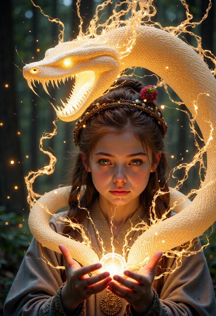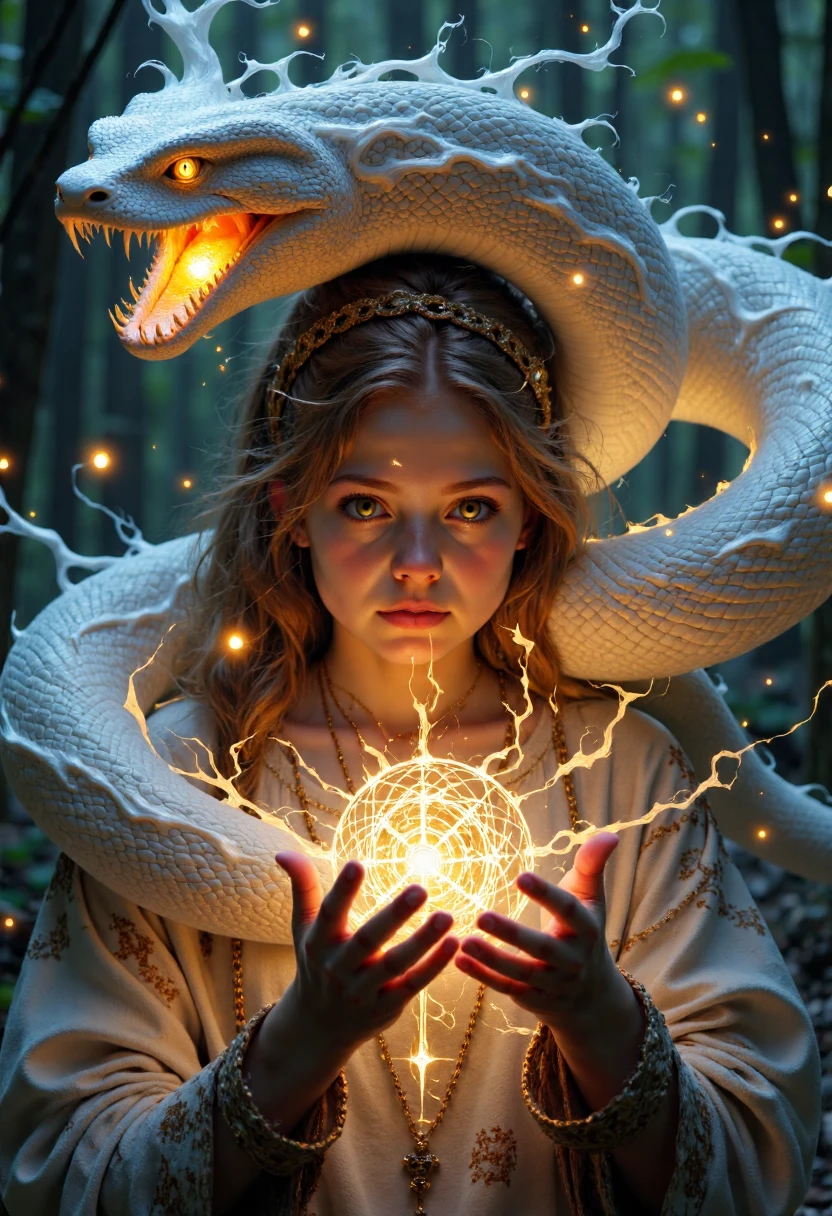 A woman, with eyes shimmering with ancient knowledge, performs a light purple snake spell. A light, almost ethereal, pulsates from within the snake, its luminescence mirrored in the girl's eyes, highlighting the intricate patterns of the spell runes on the air. The air, thick with the scent of damp earth and pine, buzzes with an almost tangible magic. The scene is bathed in the light glow of the conjured beast.