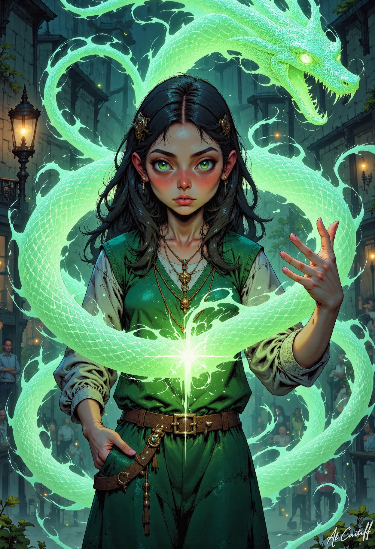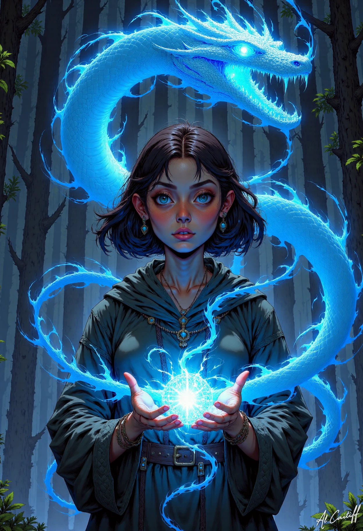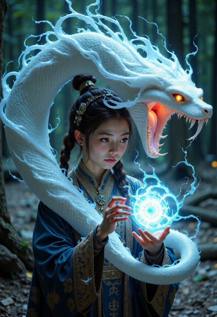 A woman, with eyes shimmering with ancient knowledge, performs a light purple snake spell. A light, almost ethereal, pulsates from within the snake, its luminescence mirrored in the girl's eyes, highlighting the intricate patterns of the spell runes on the air. The air, thick with the scent of damp earth and pine, buzzes with an almost tangible magic. The scene is bathed in the light glow of the conjured beast.