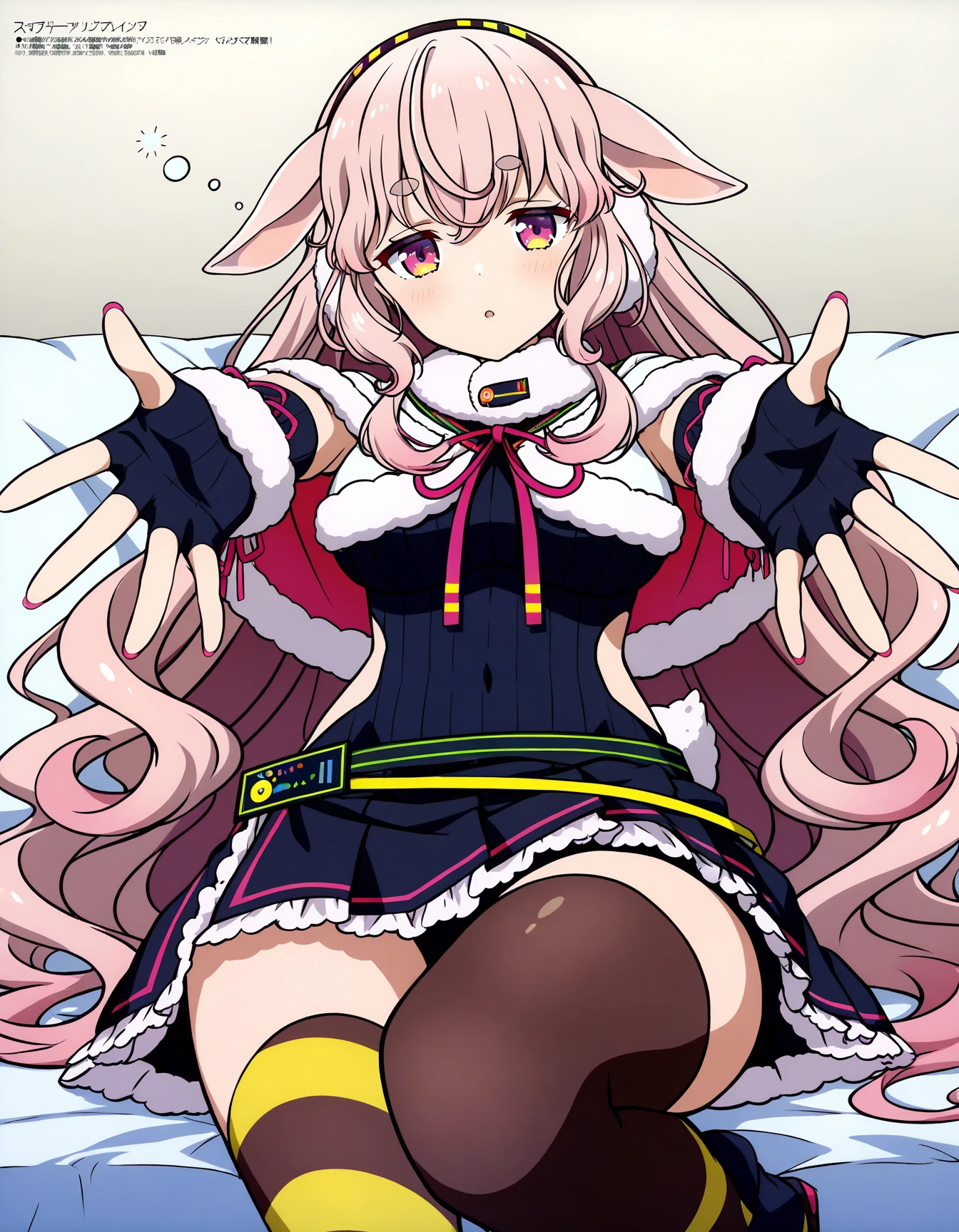 <lora:Mokota_mememe:1>,Mokota_mememe, long hair, virtual youtuber,red eyes, sheep ears, animal ears, pink hair, multicolored hair, tail, hairband, pink eyes, rabbit ears, bangs, hair between eyes, thick eyebrows, pink nails, very long hair, nail polish,earmuffs, headphones,
