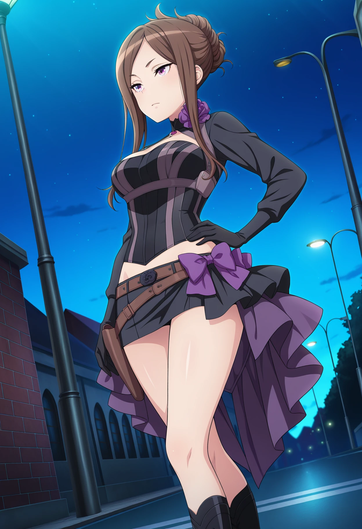Outfit - goggles on head, bustier, black shirt, black gloves, black skirt, miniskirt, holster, purple bow, showgirl skirt, knee boots, black footwear