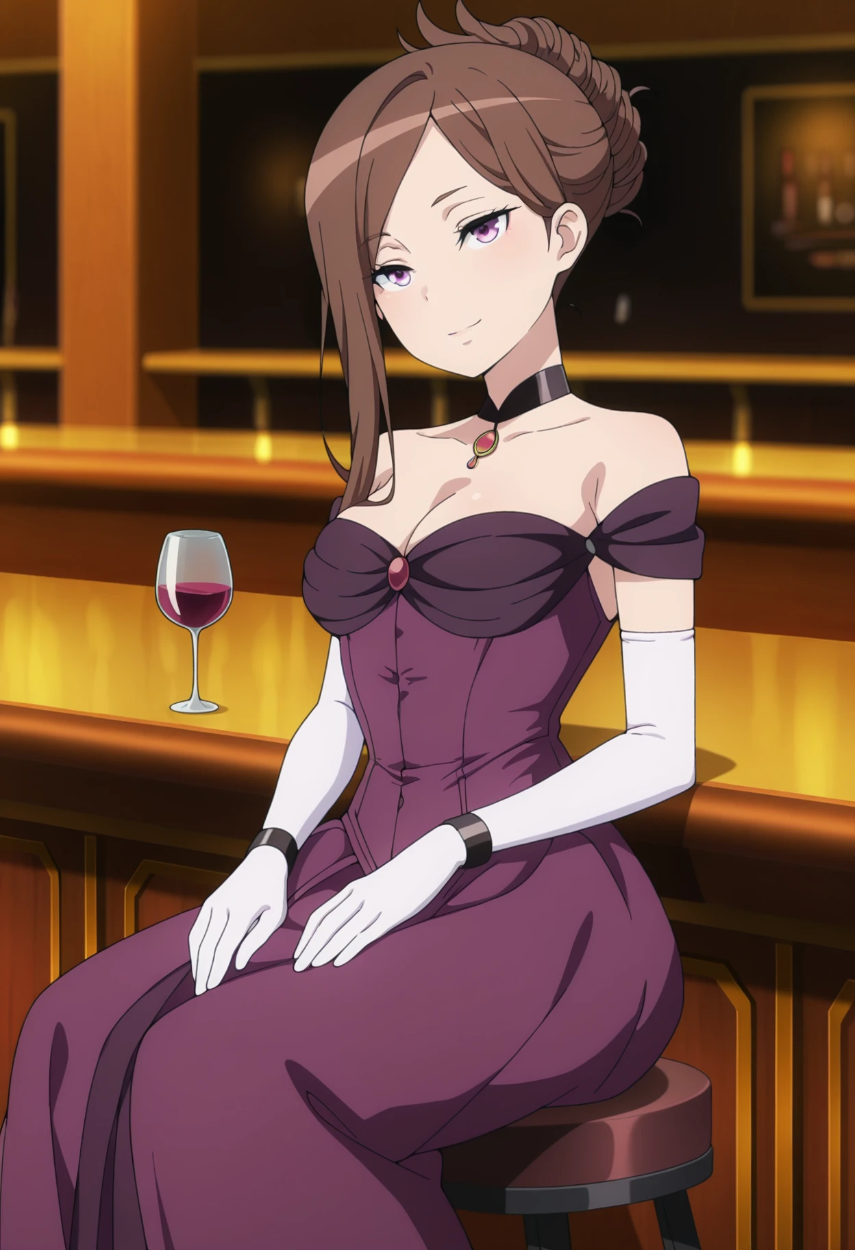 Outfit - black choker, pendant choker, purple ??????????-shoulder dress, elbow gloves, white gloves, bracelet