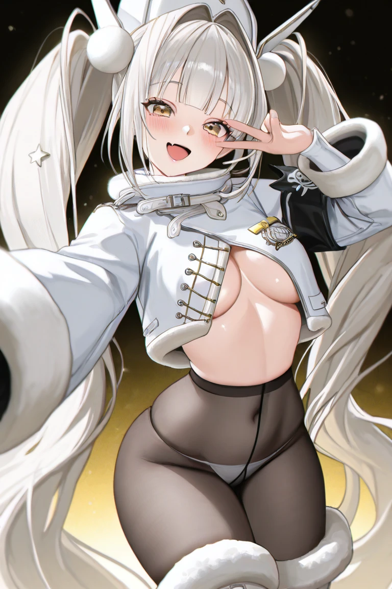Blanc_Fortune,white hair, absurdly long hair, twintails, blunt bangs, hair intakes, yellow eyes,white jacket, cropped jacket, long sleeves,panties under pantyhose, string panties, white panties, bikini bottom only,thigh boots, white footwear,Optional: