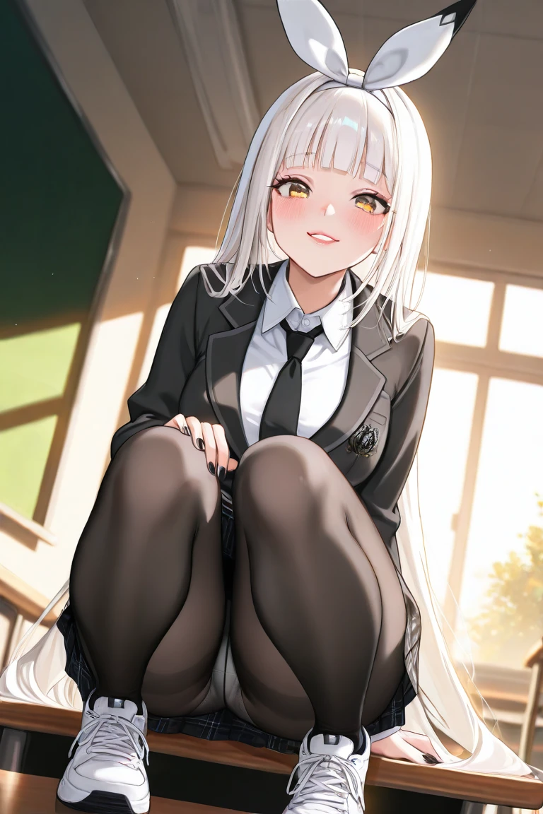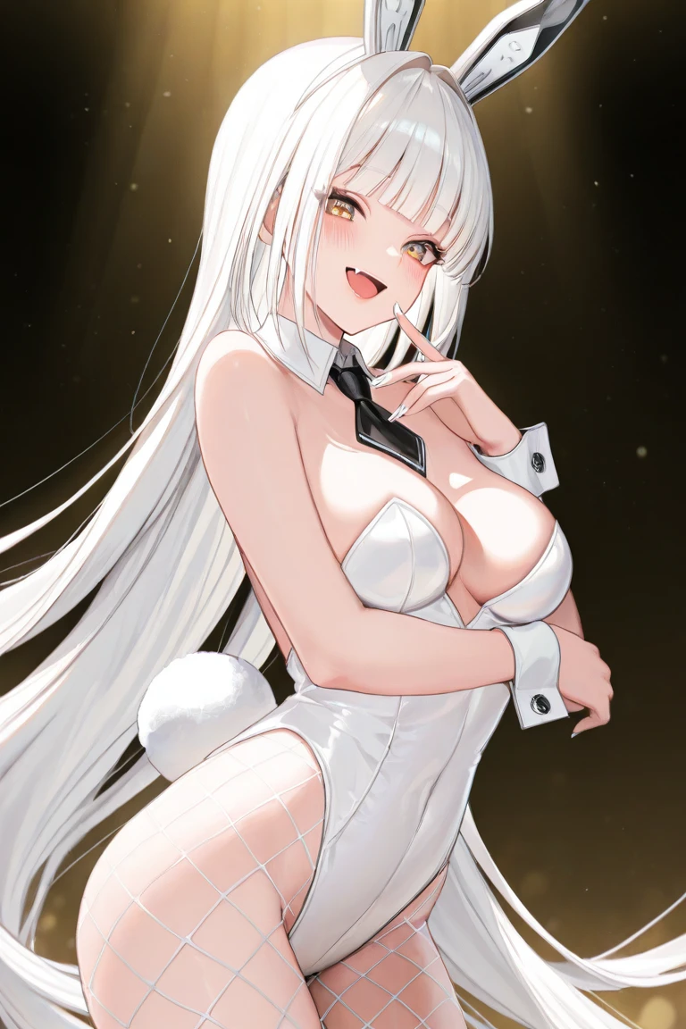 Blanc_Default,white hair, very long hair, blunt bangs, yellow eyes,playboy bunny, rabbit ears, fake animal ears, rabbit tail, fake tail,white leotard, strapless leotard, highleg leotard,white pantyhose, fishnet pantyhose,black footwear, high heels,detached collar, wrist cuffs, short necktie, black necktie,nail polish, white nails,Optional:
