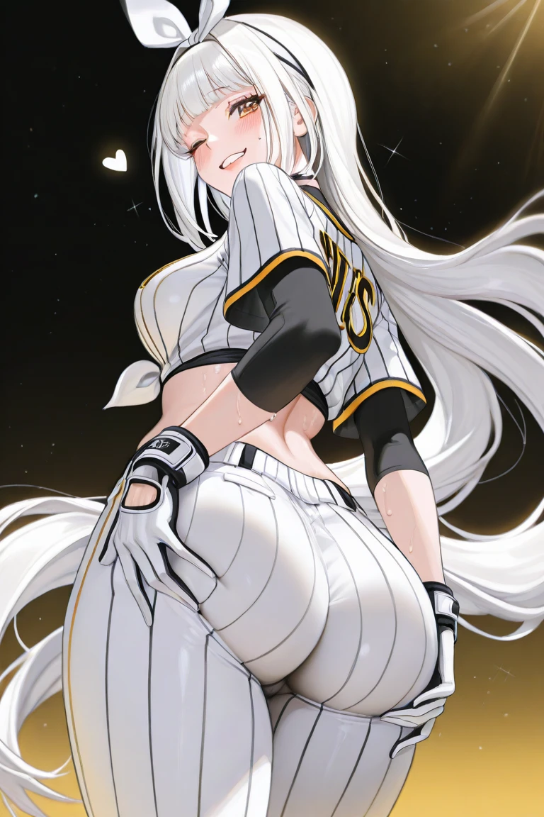 Blanc_Batter,white hair, very long hair, blunt bangs, yellow eyes,baseball uniform, striped clothes, vertical stripes,white shirt, tied shirt, short sleeves, front-tie top,black crop top,white pants,white hairband, white gloves, hair bow,kneehighs, black socks, sneakers, white footwear,Optional: