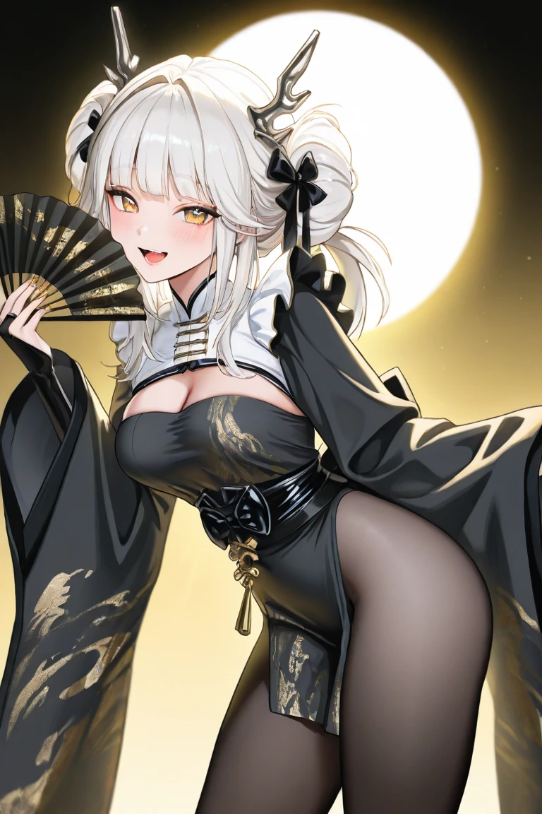 Blanc_White,white hair, long hair, blunt bangs, sidelocks, double bun, hair bun, yellow eyes,dragon horns, fake horns,japanese clothes, black dress, cleavage cutout, wide sleeves, long sleeves, pelvic curtain,back bow, black bow,black bodystocking,high heels, black footwear,nail polish, orange nails, black gloves, bridal gauntlets,hair ribbon, black ribbon, hair ornament, tassel,Optional: