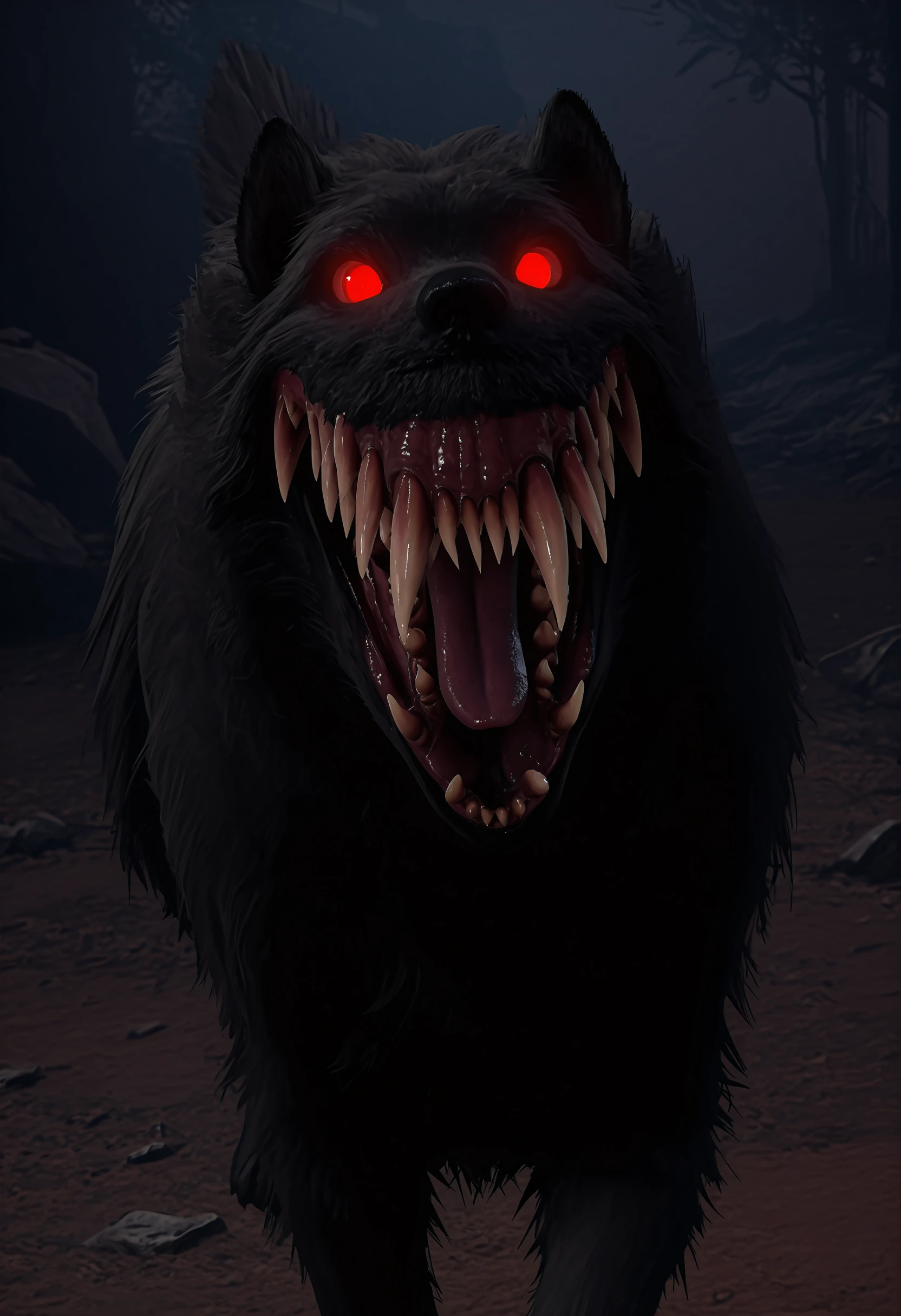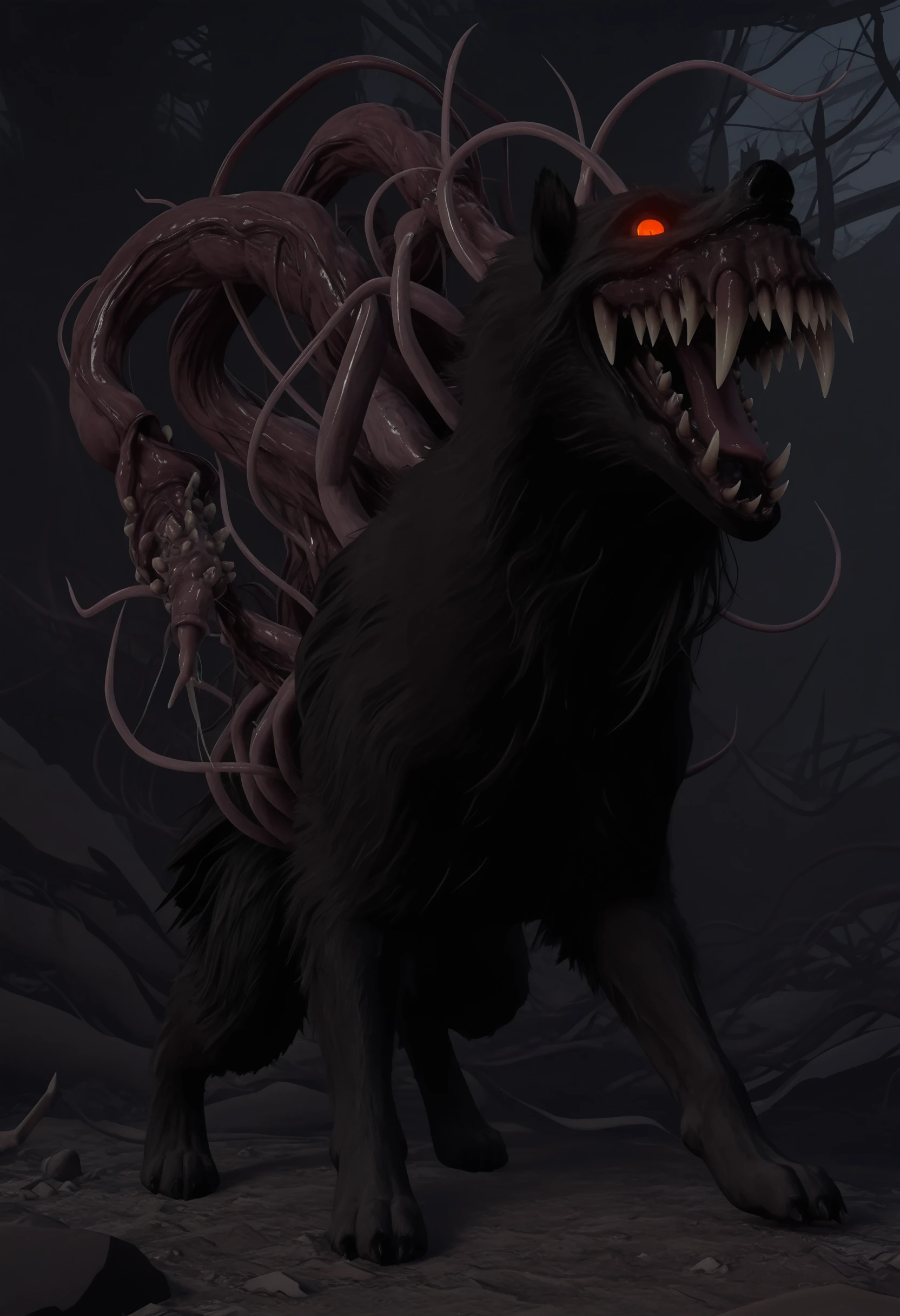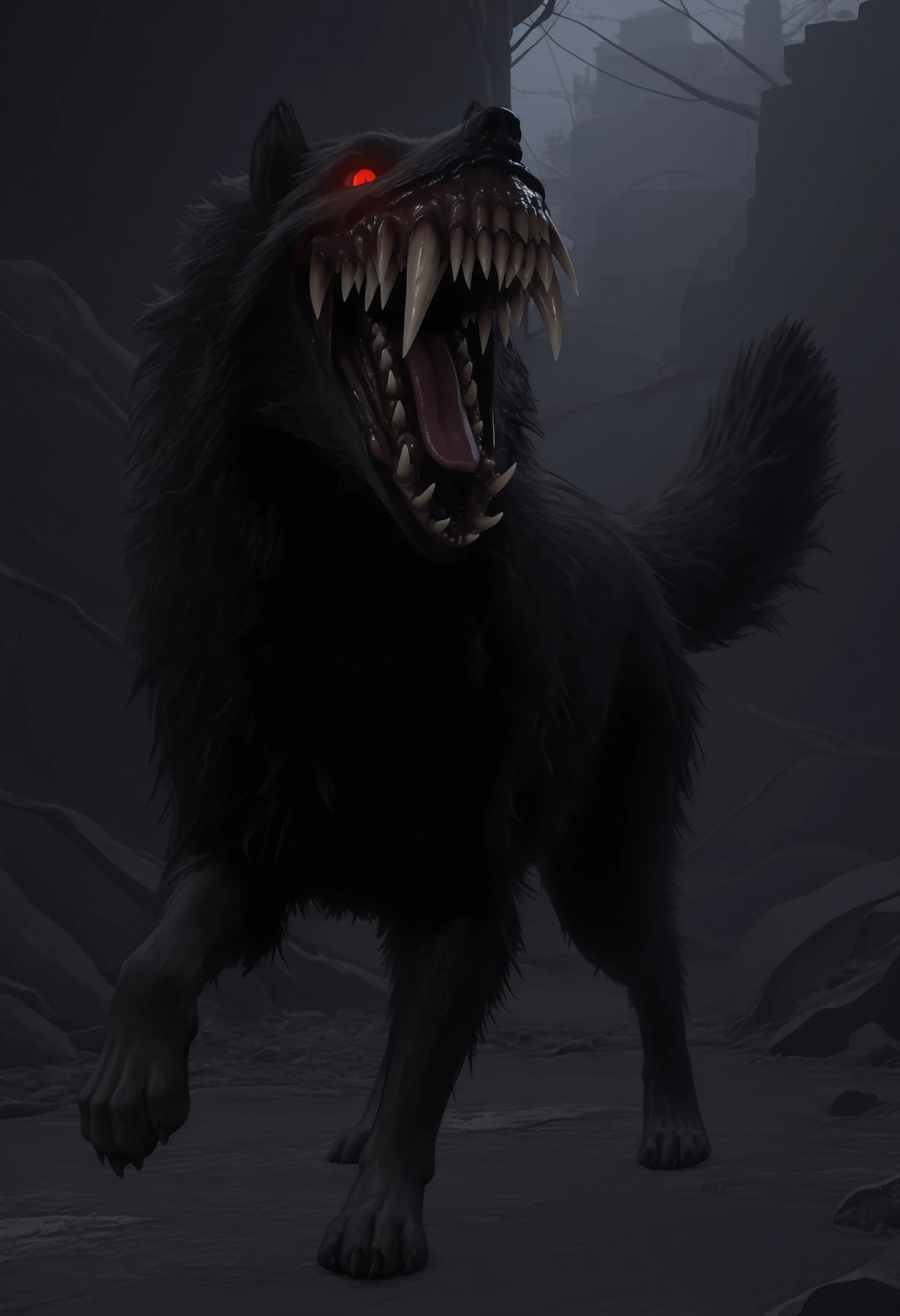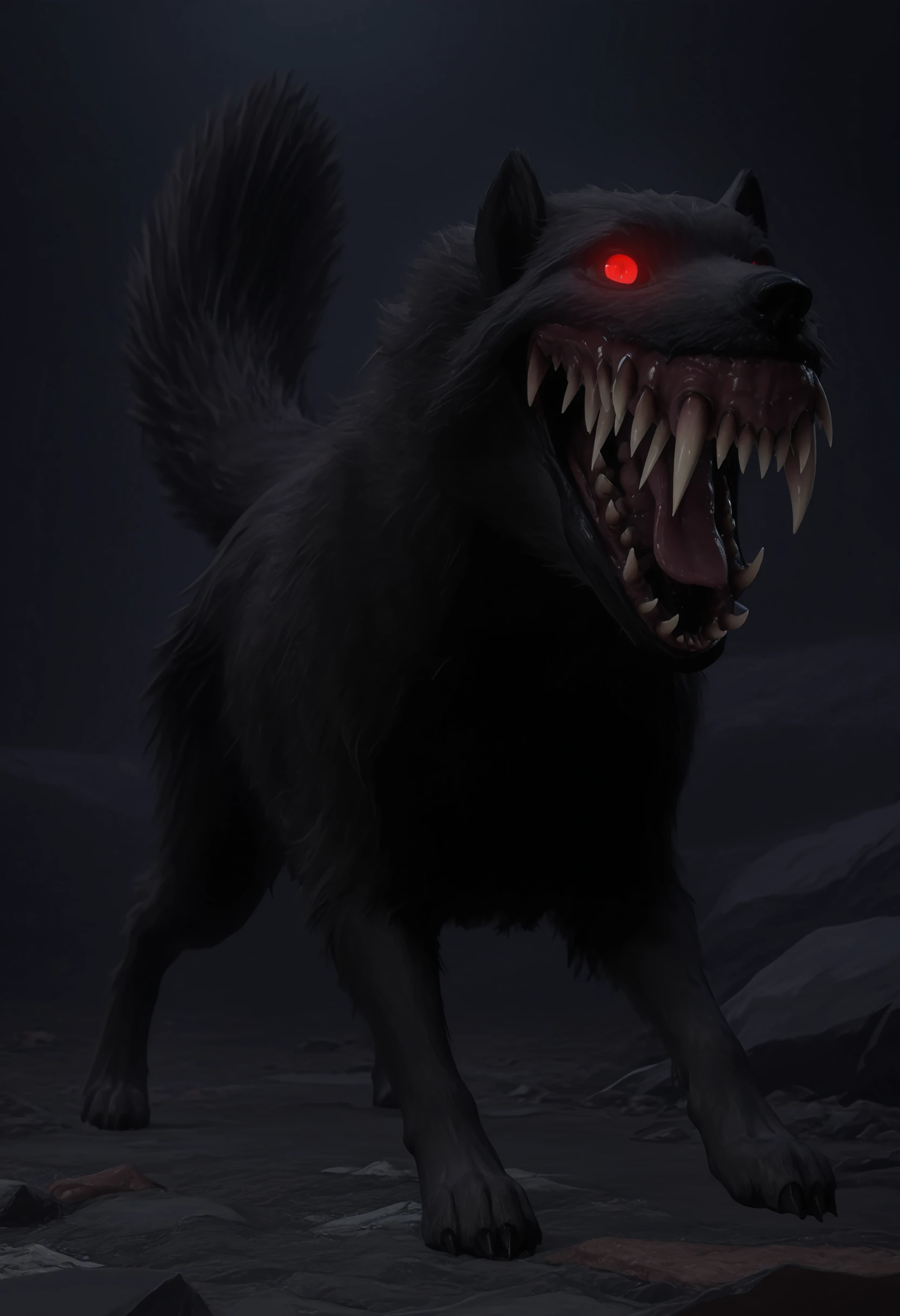 • c0lilf, monster, sharp teeth, red eyes, glowing eyes, tail