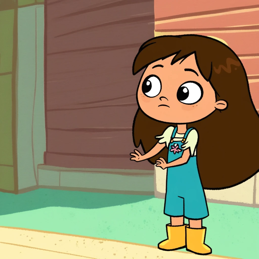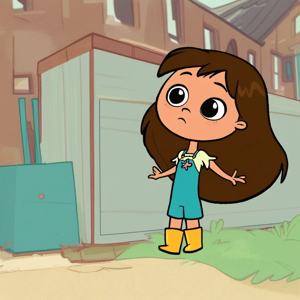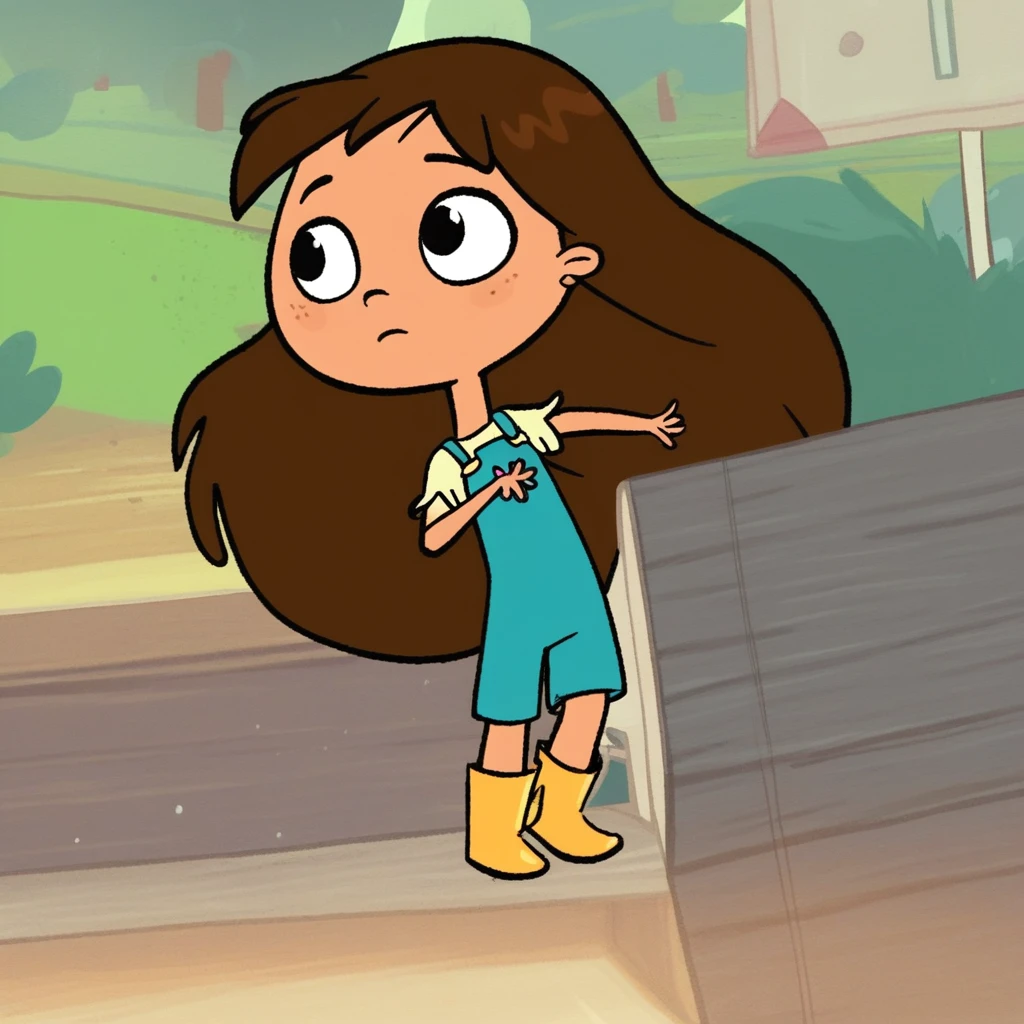 rosie, brown hair, long hair, black eyes, overalls, boots