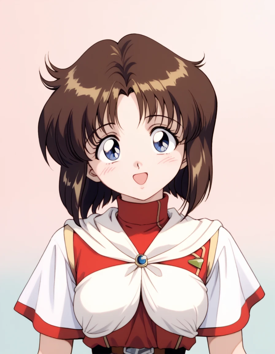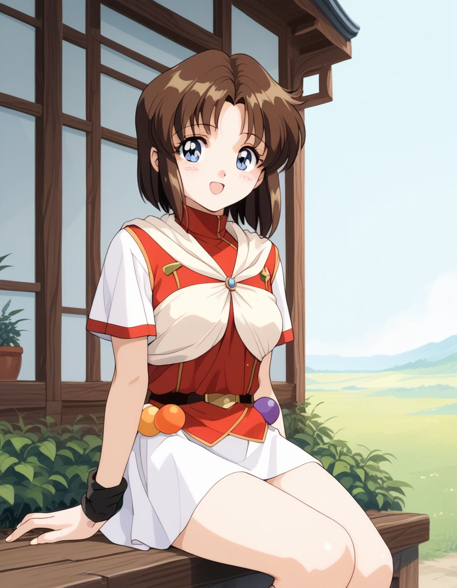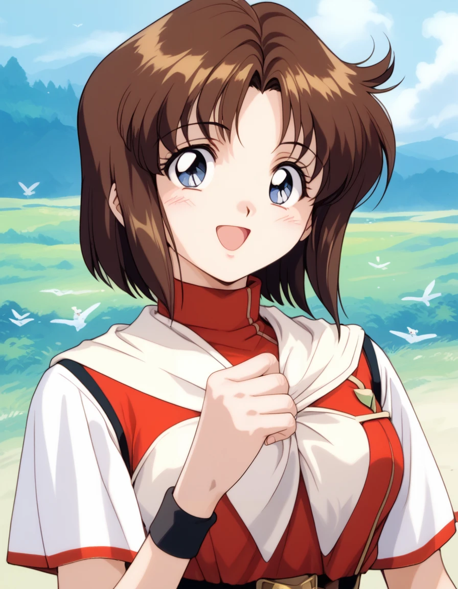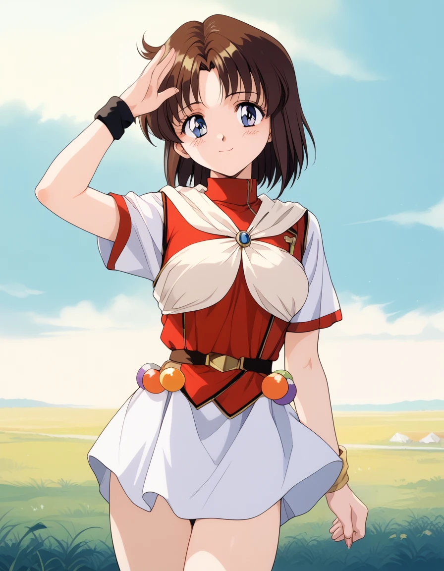 lilith (megami paradise), brown hair, short hair, blue eyes,